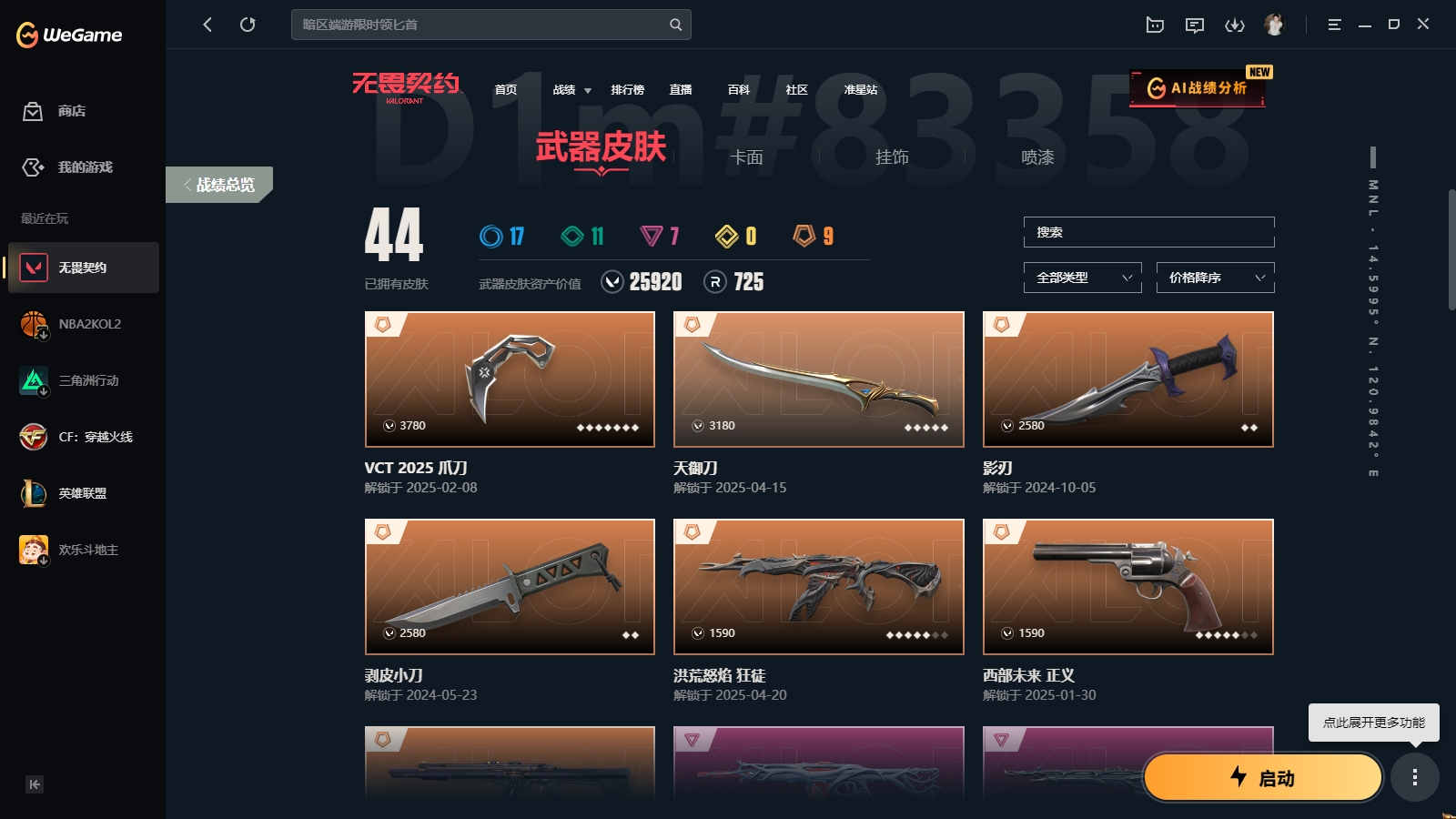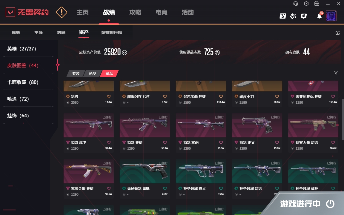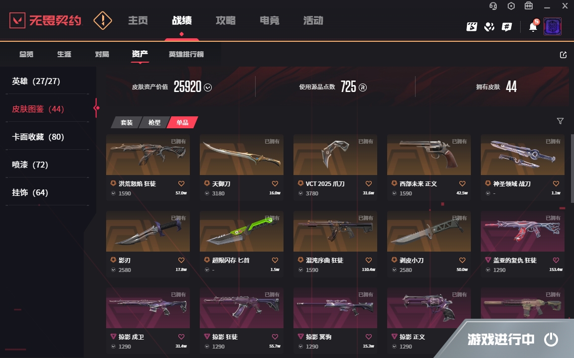 [9347725]【保证金商户】【编号75779】【27英雄44皮肤】【7卓越9传奇】 vct 2025爪刀 天御刀 影刃 剥皮小刀 洪荒怒焰 狂徒 西部未来 正义 混沌序曲狂徒 盖亚的复仇 狂徒 掠影戍卫 掠影狂徒 掠影冥驹 掠影正义 侦察力量幻影 紫阙金琅狂徒 神圣领域战刀