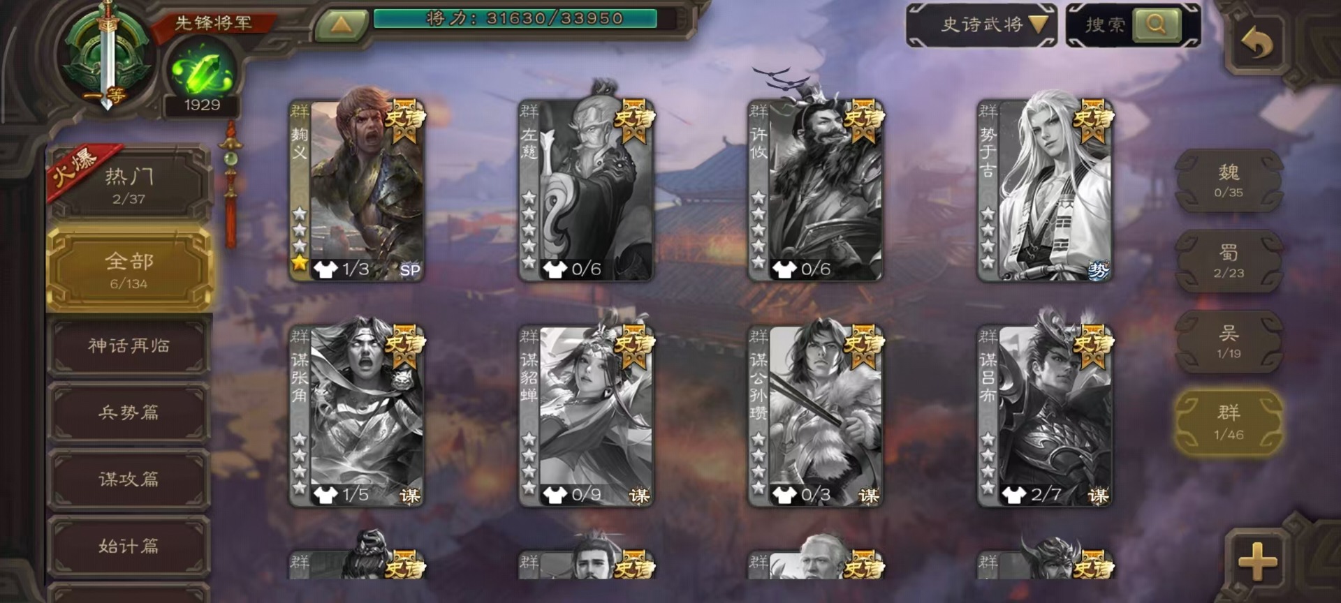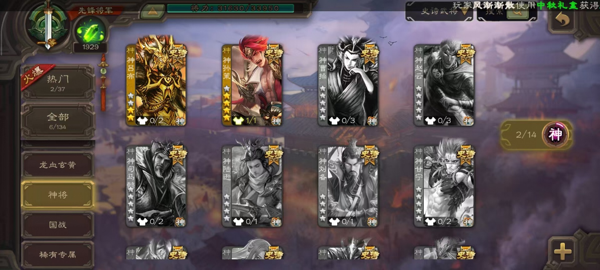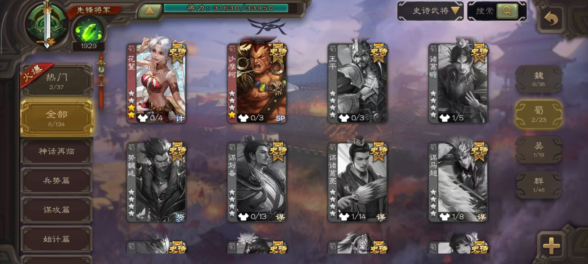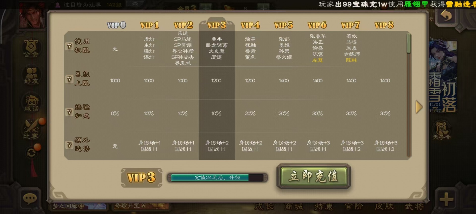 [14233984]vip3 先锋将军 163武将 5动态皮肤 6史诗武将 【神将】:神吕布神孙策 【蜀国武将】:沙摩柯花鬘 【吴国武将】:界徐盛 【群国武将】:麹义