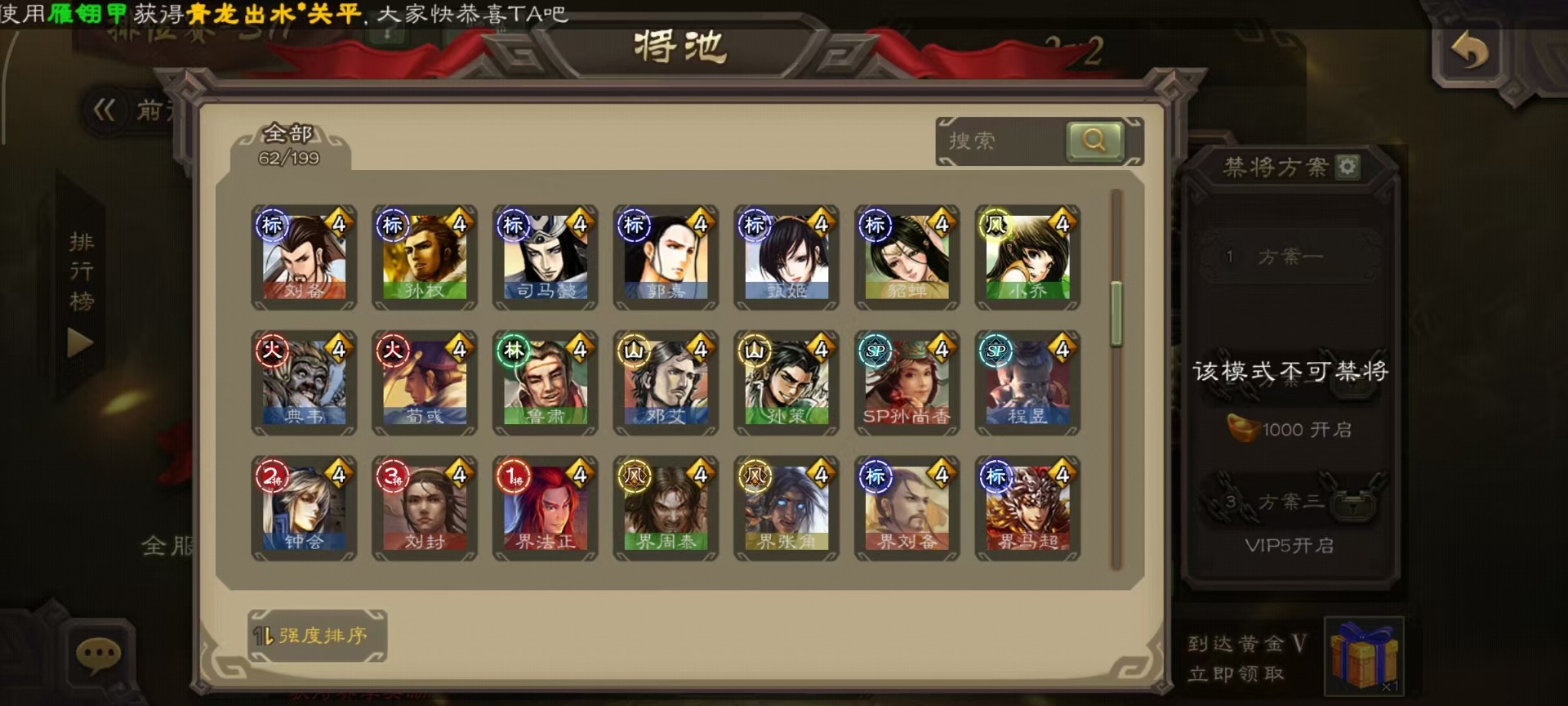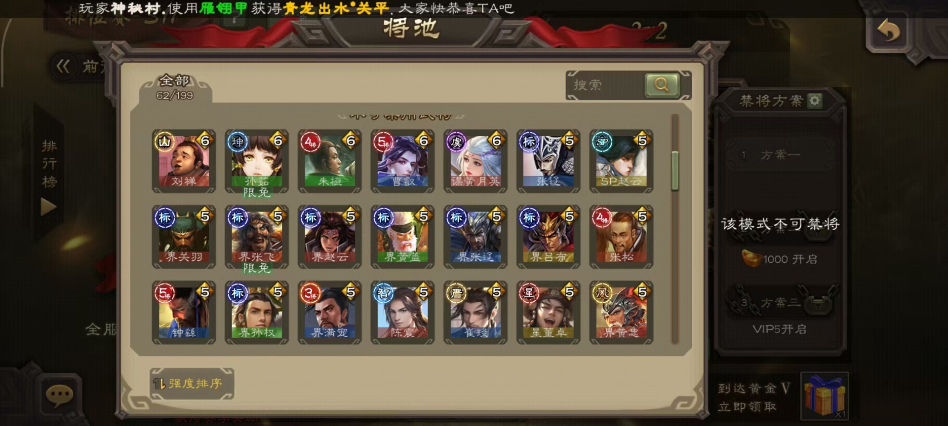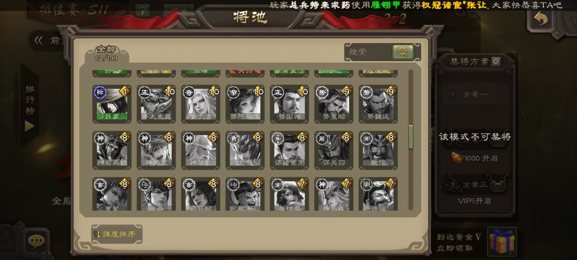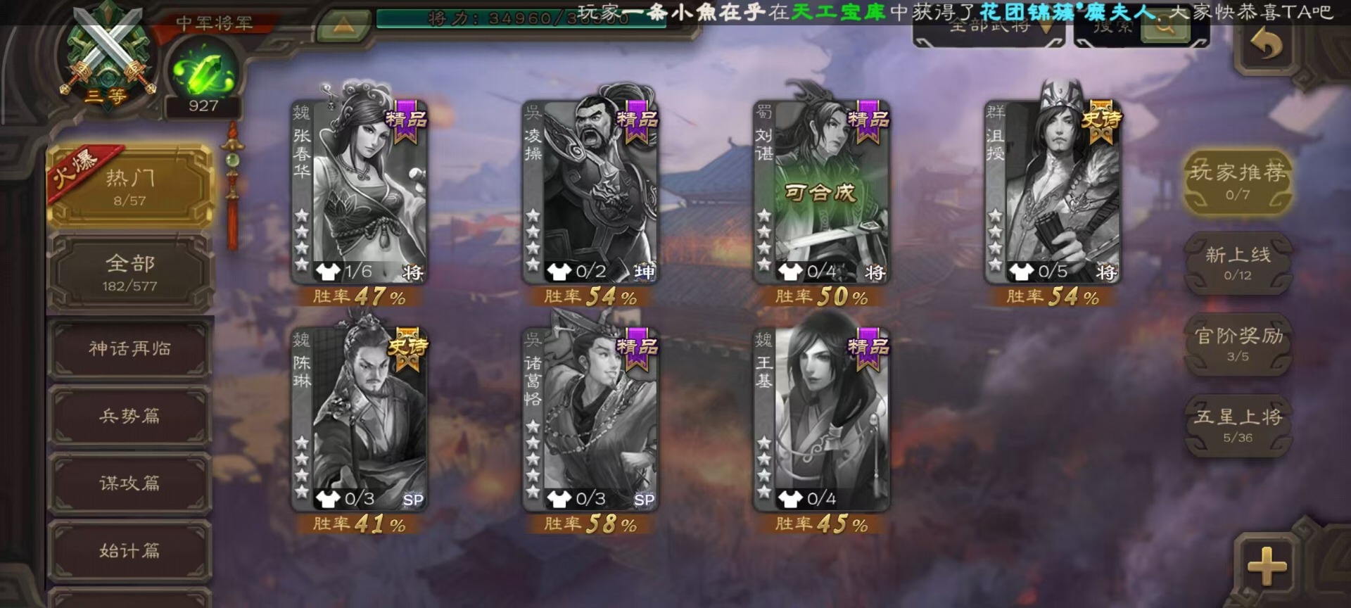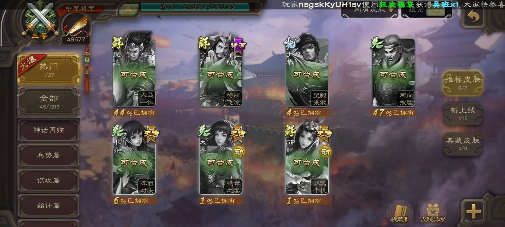 [14252952]vip4 中军将军 182武将 1动态皮肤 8史诗武将 66宝珠 【魏国武将】:程昱戏志才 【蜀国武将】:谯周界黄忠花鬘 【群国武将】:星董卓左慈星黄忠