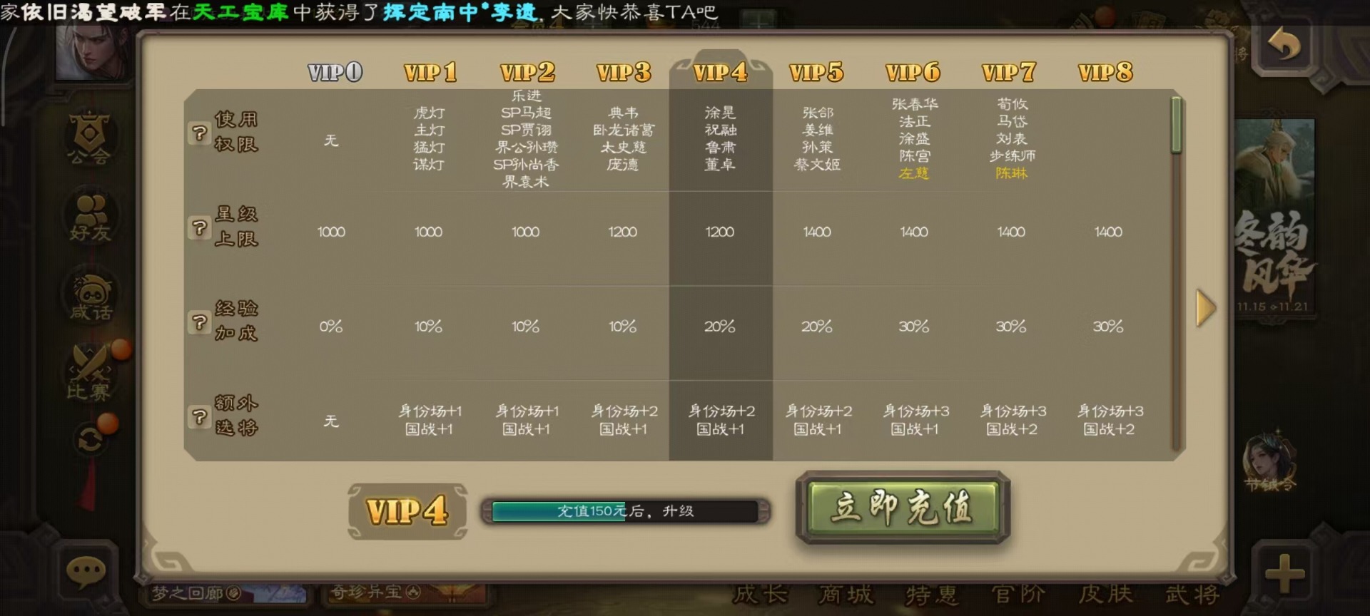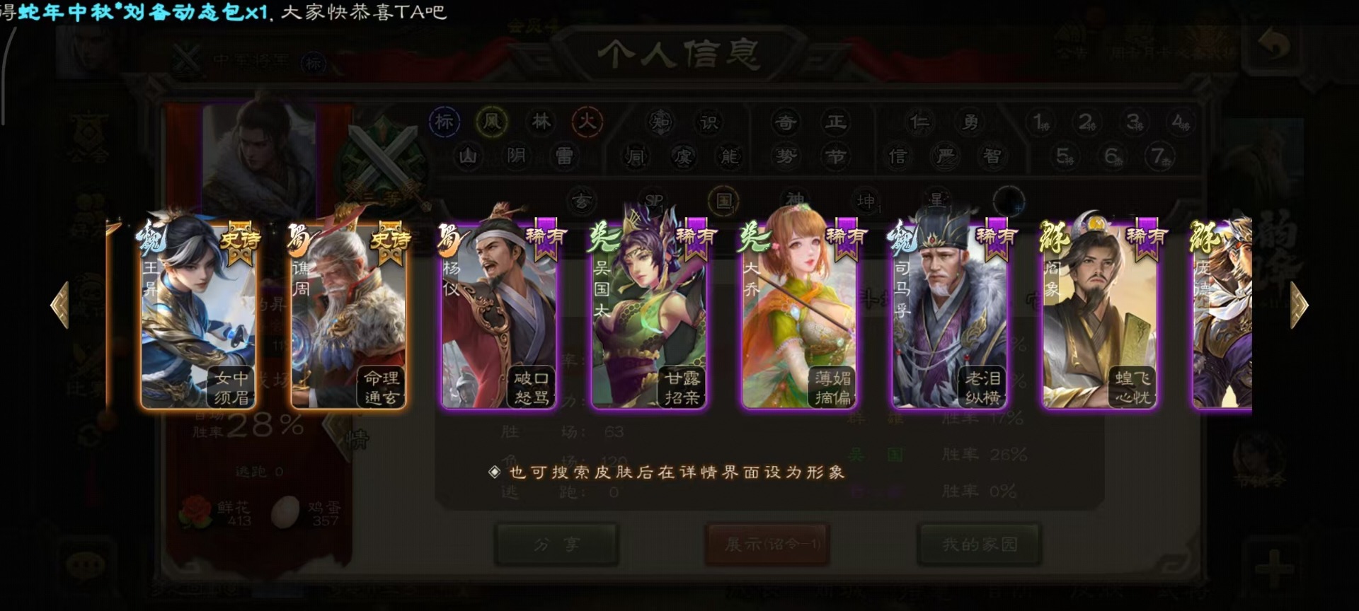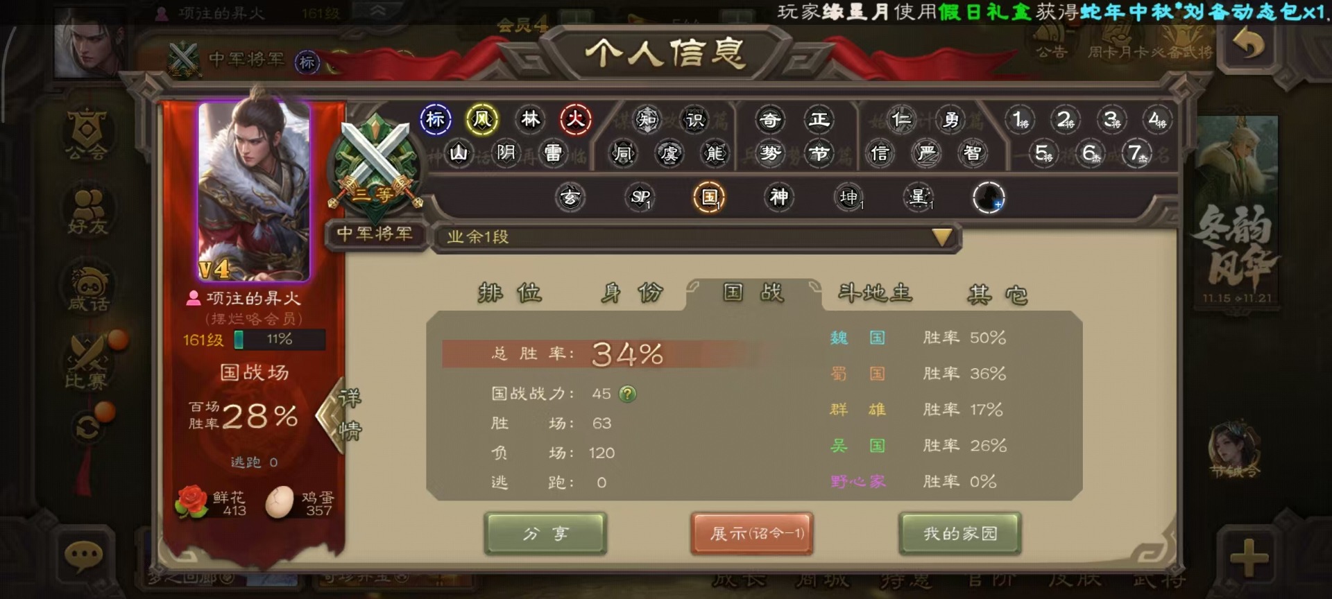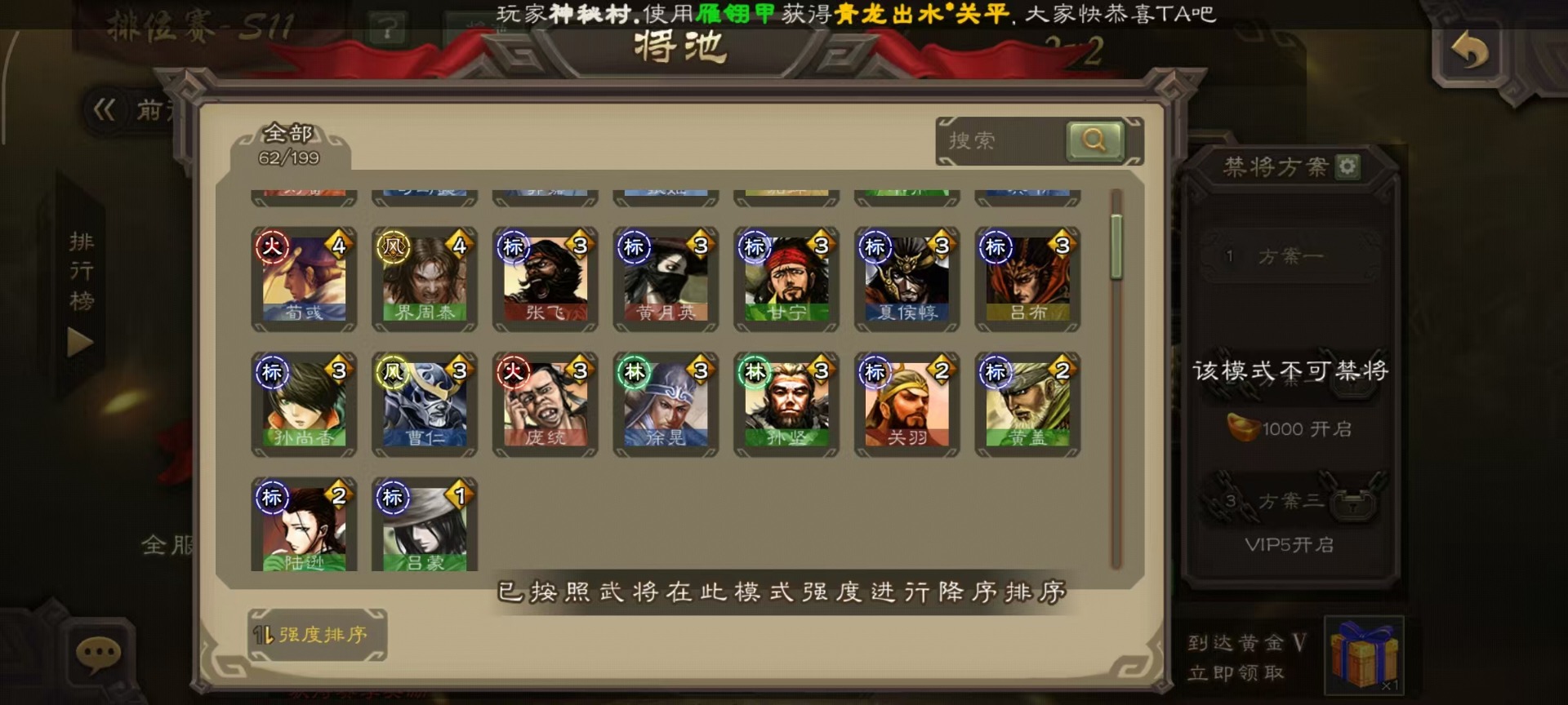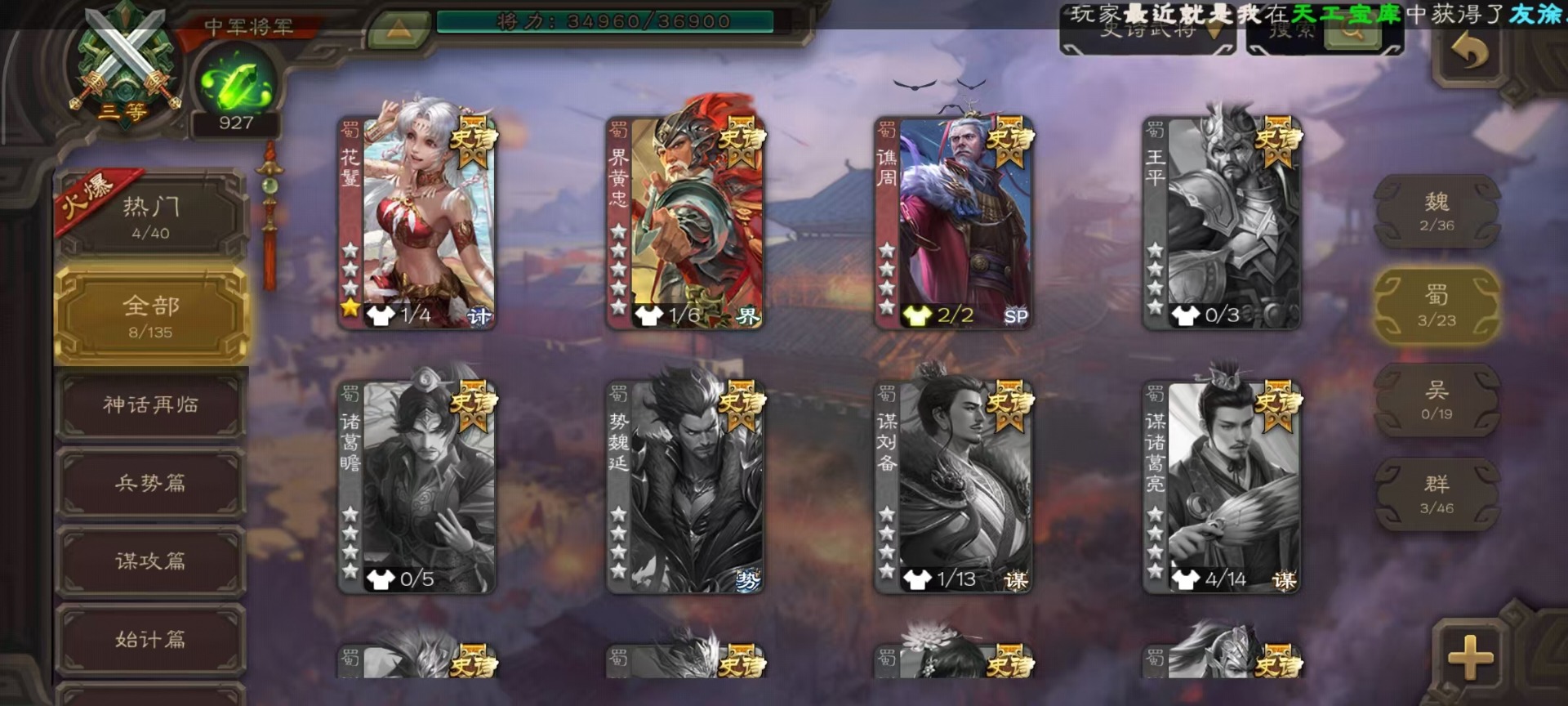 [14252952]vip4 中军将军 182武将 1动态皮肤 8史诗武将 66宝珠 【魏国武将】:程昱戏志才 【蜀国武将】:谯周界黄忠花鬘 【群国武将】:星董卓左慈星黄忠