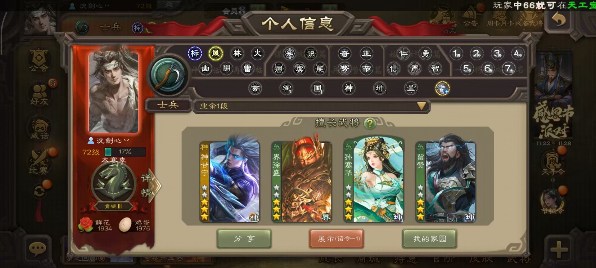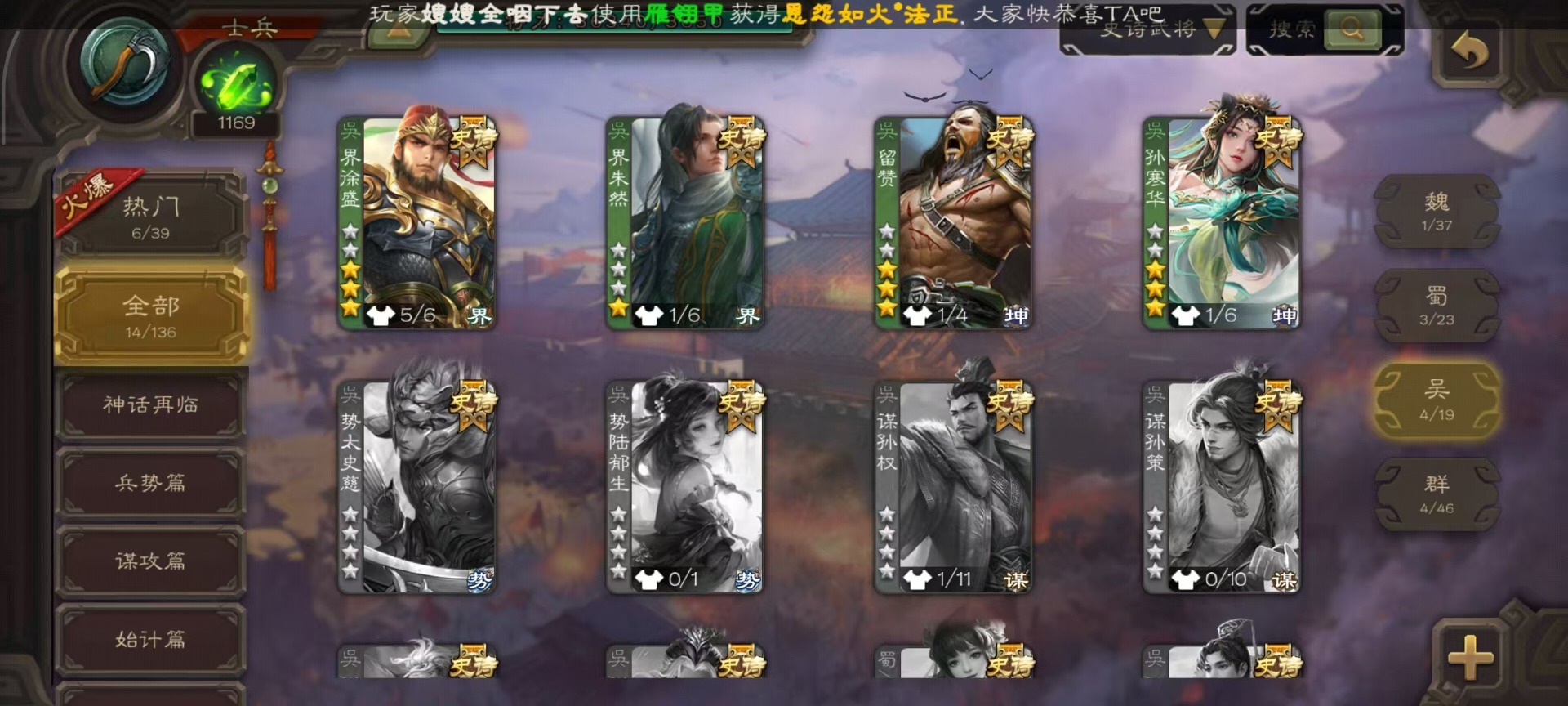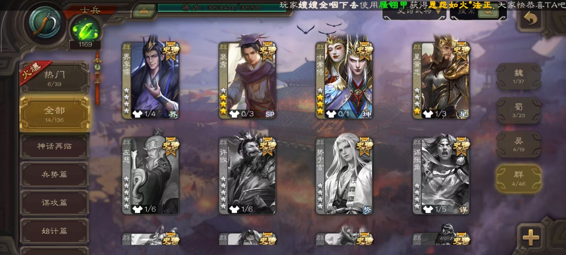 [14257175]vip8 士兵 84武将 16动态皮肤 14史诗武将 【神将】:神赵云神甘宁 【魏国武将】:王元姬 【蜀国武将】:沙摩柯谯周花鬘 【吴国武将】:孙寒华留赞界朱然界徐盛 【群国武将】:十常侍裴秀星黄忠界李儒