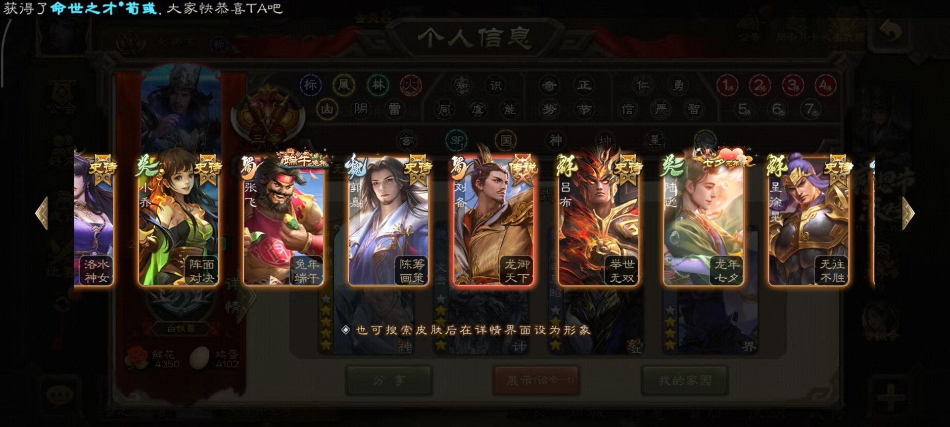 [14332015]vip8 大将军 352武将 40动态皮肤 45史诗武将 13宝珠 【神将】:神吕布神赵云神郭嘉 【魏国武将】:清河公主星周不疑王元姬魏-司马昭界钟会界曹真程昱曹婴曹纯戏志才谋夏侯惇蒋干 【蜀国武将】:谋夏侯氏谋赵云谋马超诸葛瞻张星彩沙摩柯谯周界黄忠花鬘关索董允 【吴国武将】:文鸯周处骆统界朱然界徐盛界步练师 【群国武将】:星董卓群-司马昭裴秀左慈张让兀突骨麹义南华老仙沮授界左慈界李儒公孙康谋张角许攸