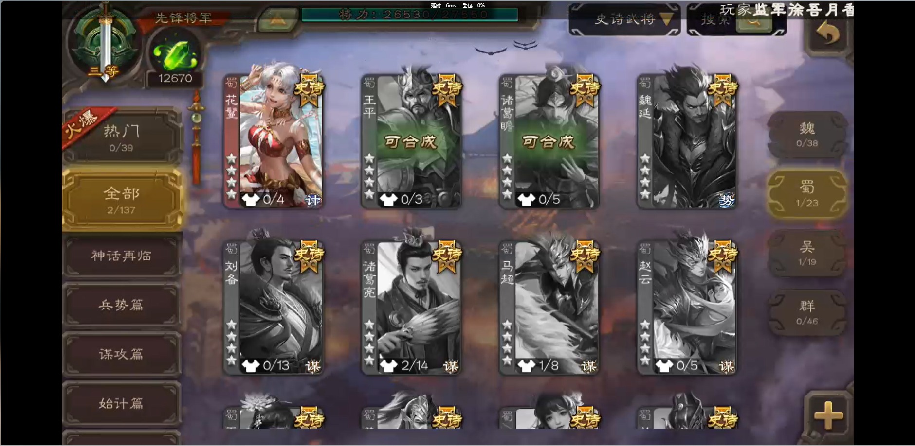 [14358421]vip1 先锋将军 143武将 3动态皮肤 2史诗武将 【魏国武将】:甄姬司马懿许褚夏侯惇郭嘉曹仁曹操张辽 【蜀国武将】:花鬘 【吴国武将】:太史慈