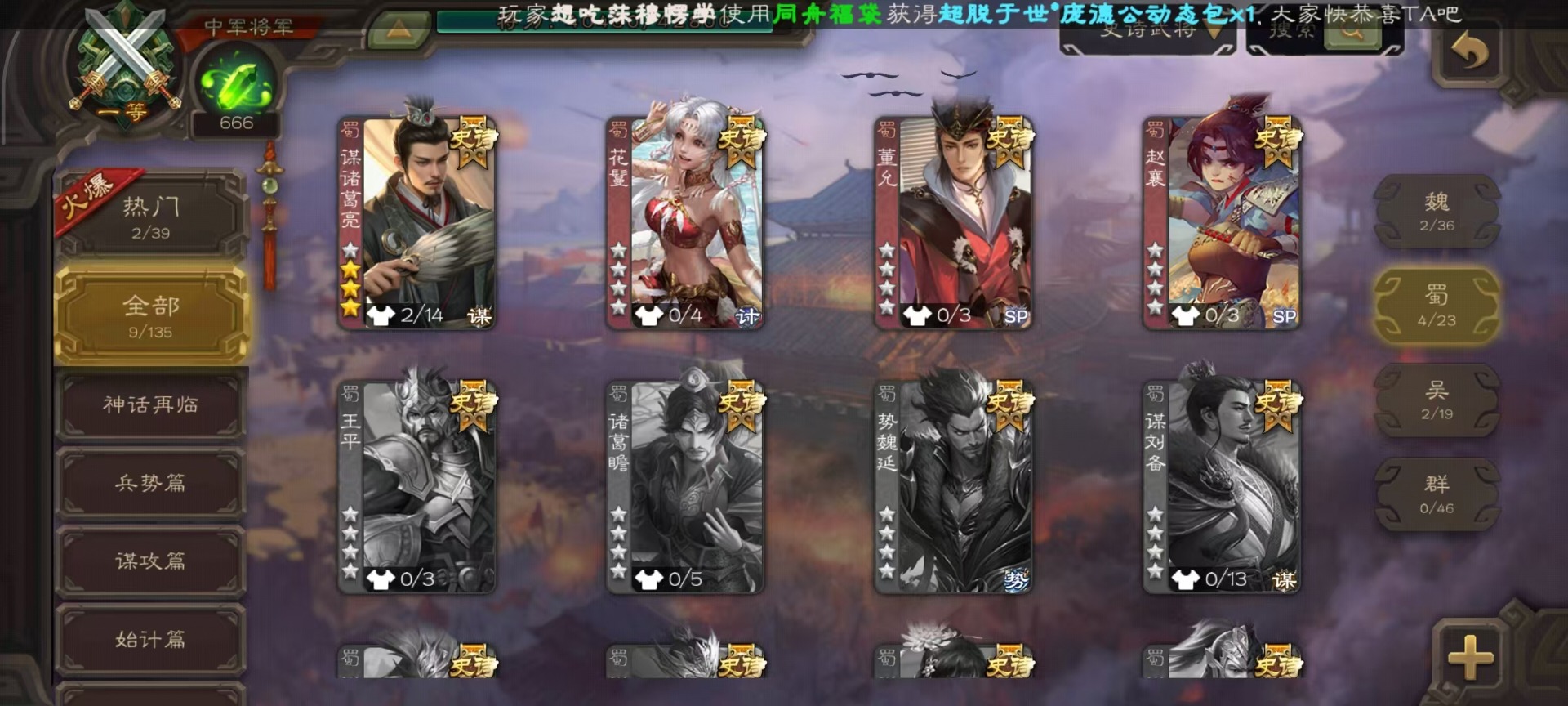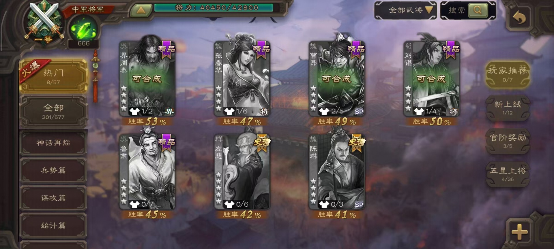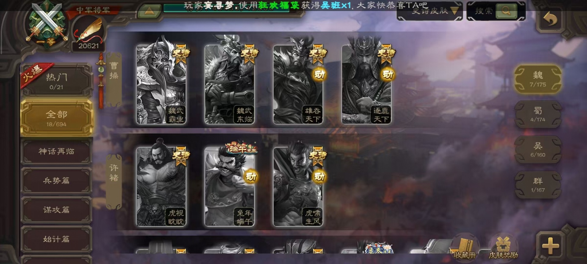 [14359048]vip7 中军将军 201武将 9动态皮肤 9史诗武将 【神将】:神吕布 【魏国武将】:星周不疑程昱 【蜀国武将】:谋诸葛亮赵襄花鬘董允 【吴国武将】:谋孙策界徐盛