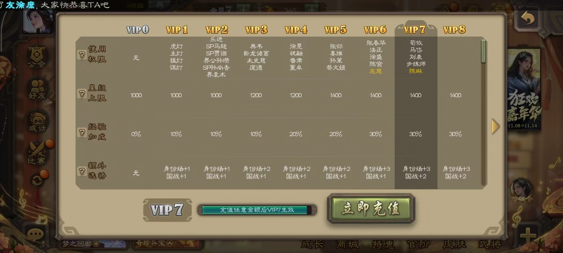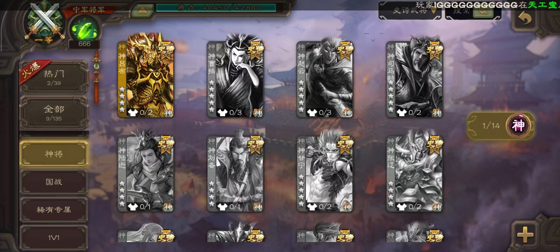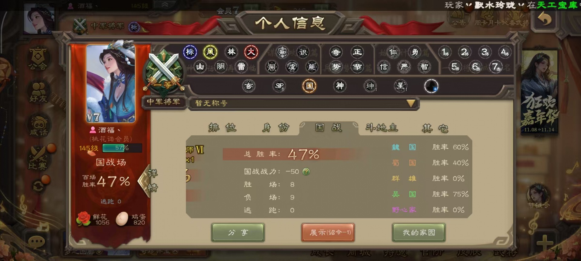 [14359048]vip7 中军将军 201武将 9动态皮肤 9史诗武将 【神将】:神吕布 【魏国武将】:星周不疑程昱 【蜀国武将】:谋诸葛亮赵襄花鬘董允 【吴国武将】:谋孙策界徐盛