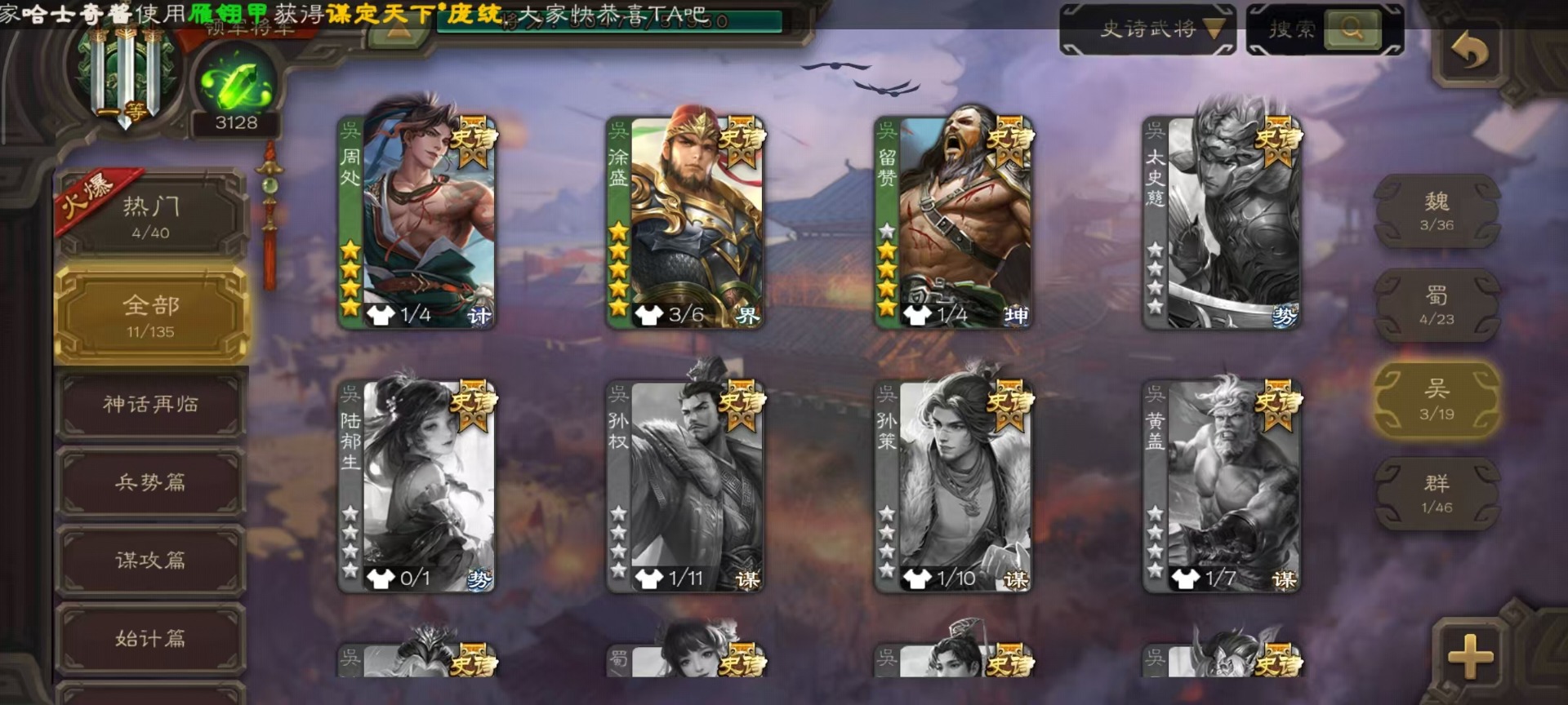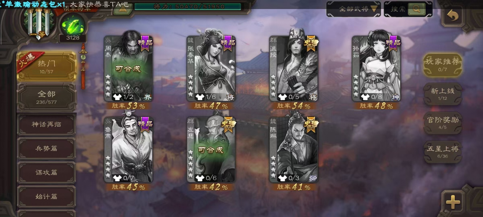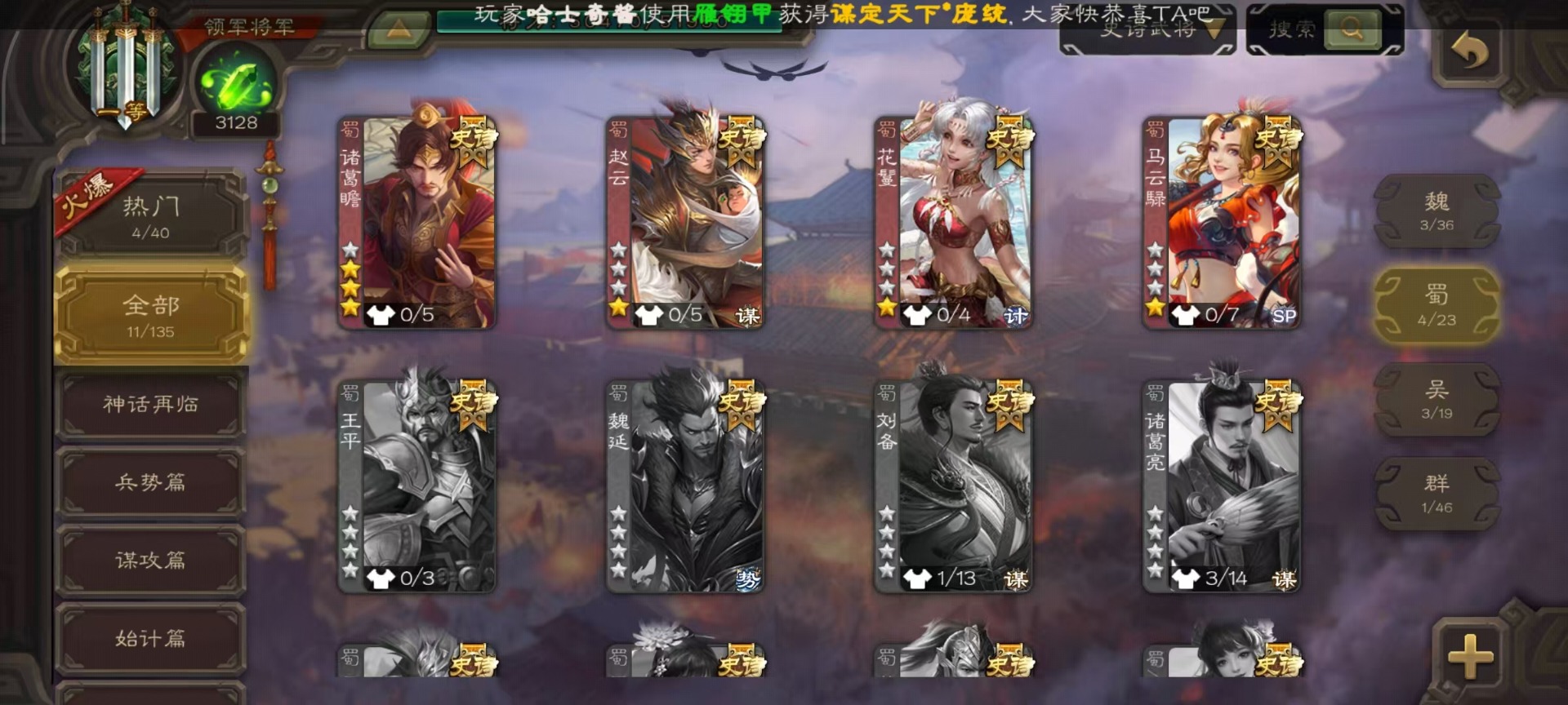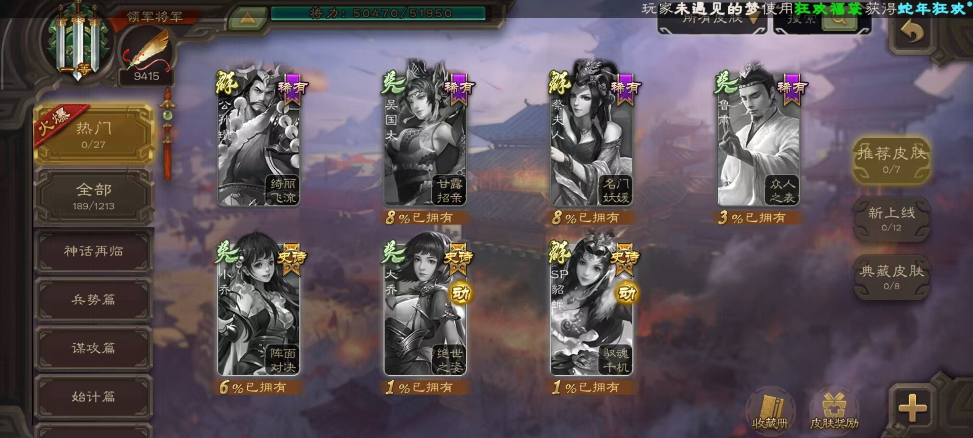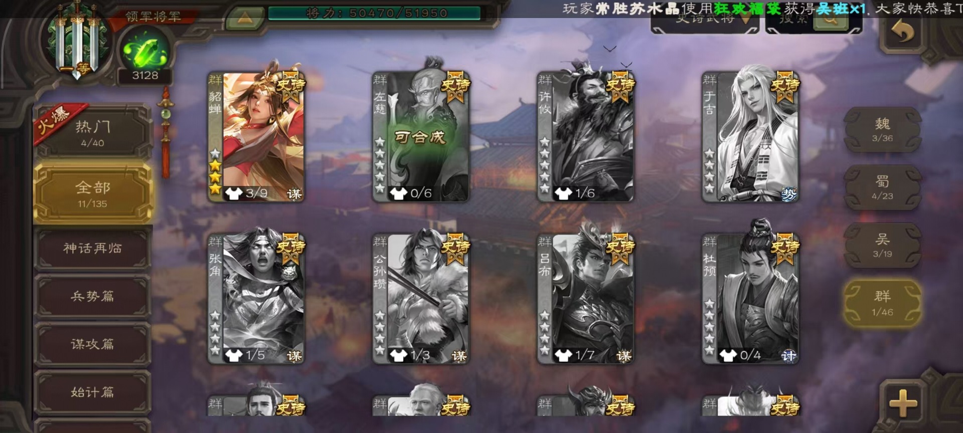 [14359093]vip8 领军将军 236武将 7动态皮肤 11史诗武将 【魏国武将】:星周不疑程昱曹纯 【蜀国武将】:马云騄诸葛瞻花鬘赵云 【吴国武将】:徐盛周处留赞 【群国武将】:貂蝉