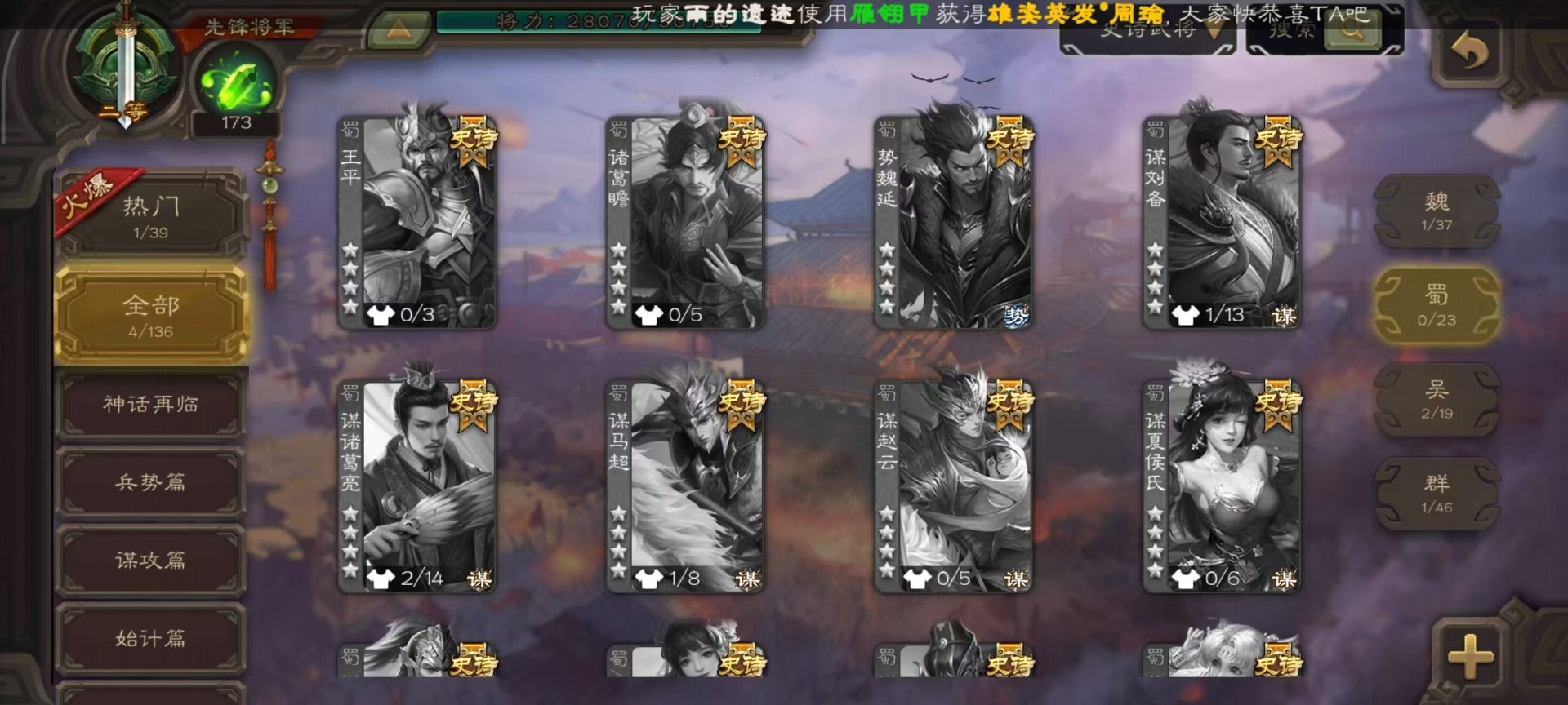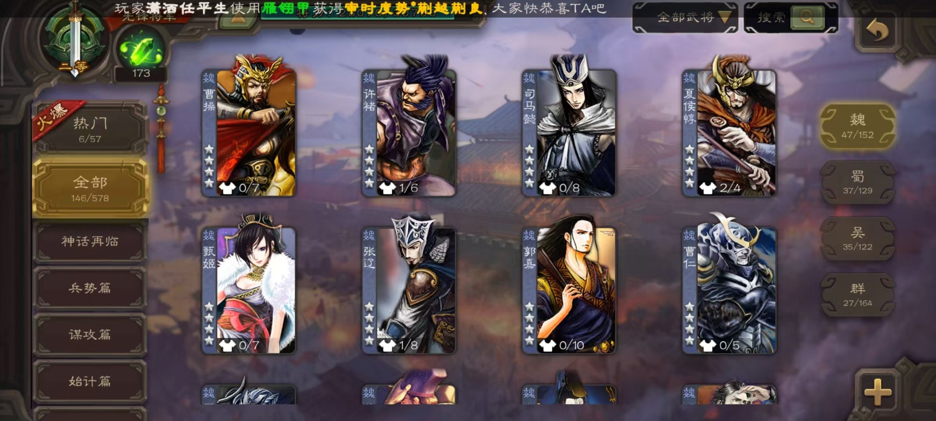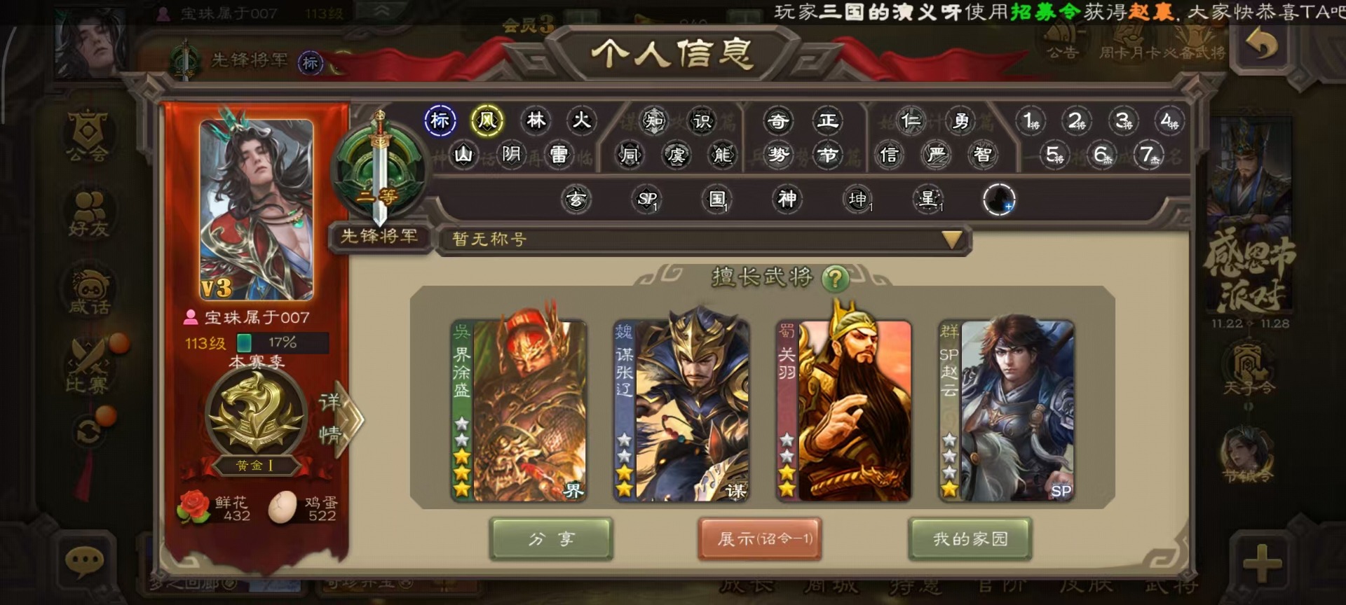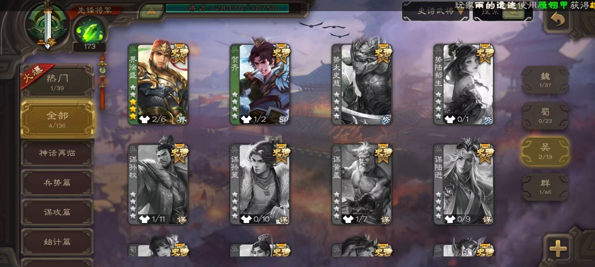 [14374998]vip3 先锋将军 146武将 4动态皮肤 4史诗武将 【魏国武将】:界于禁甄姬司马懿许褚夏侯惇郭嘉曹仁曹操张辽 【吴国武将】:界徐盛贺齐 【群国武将】:麹义