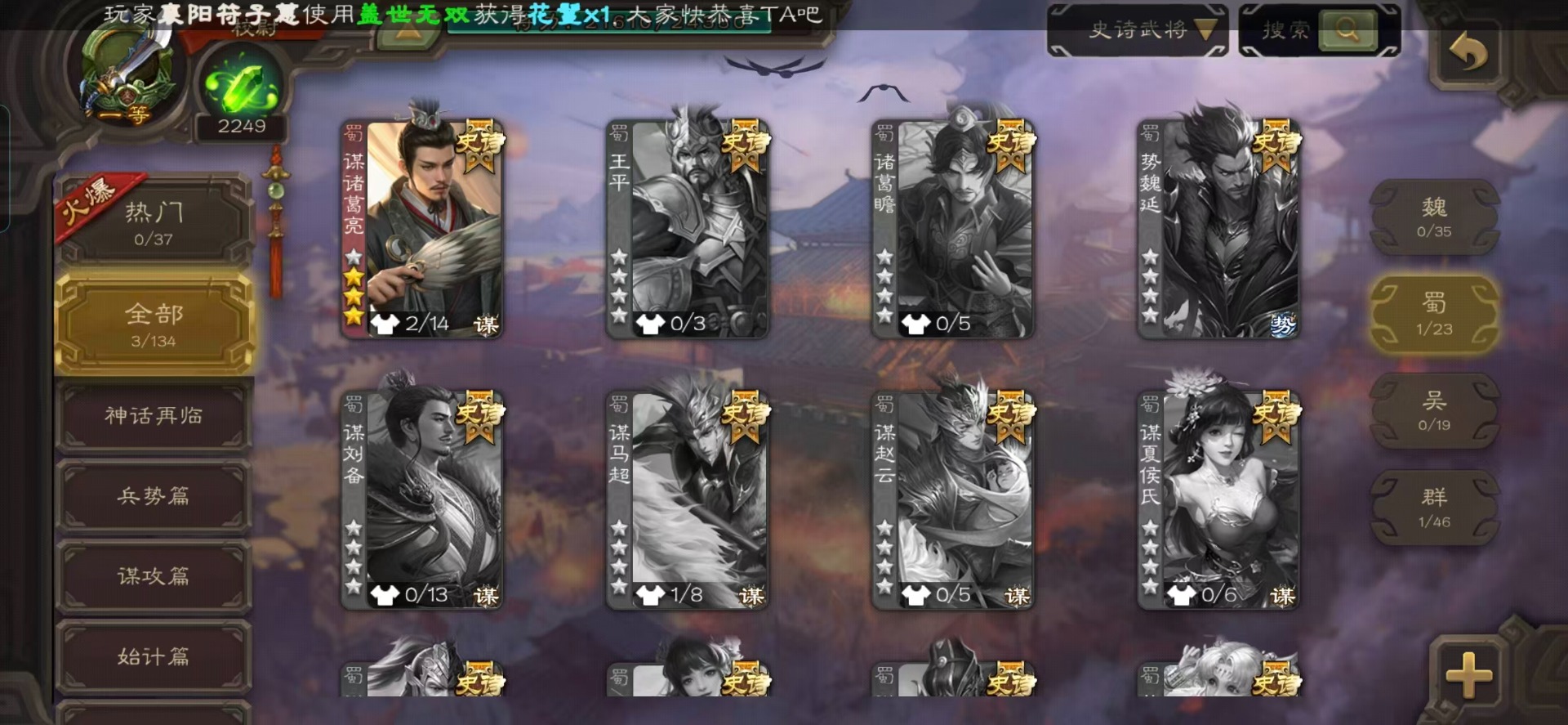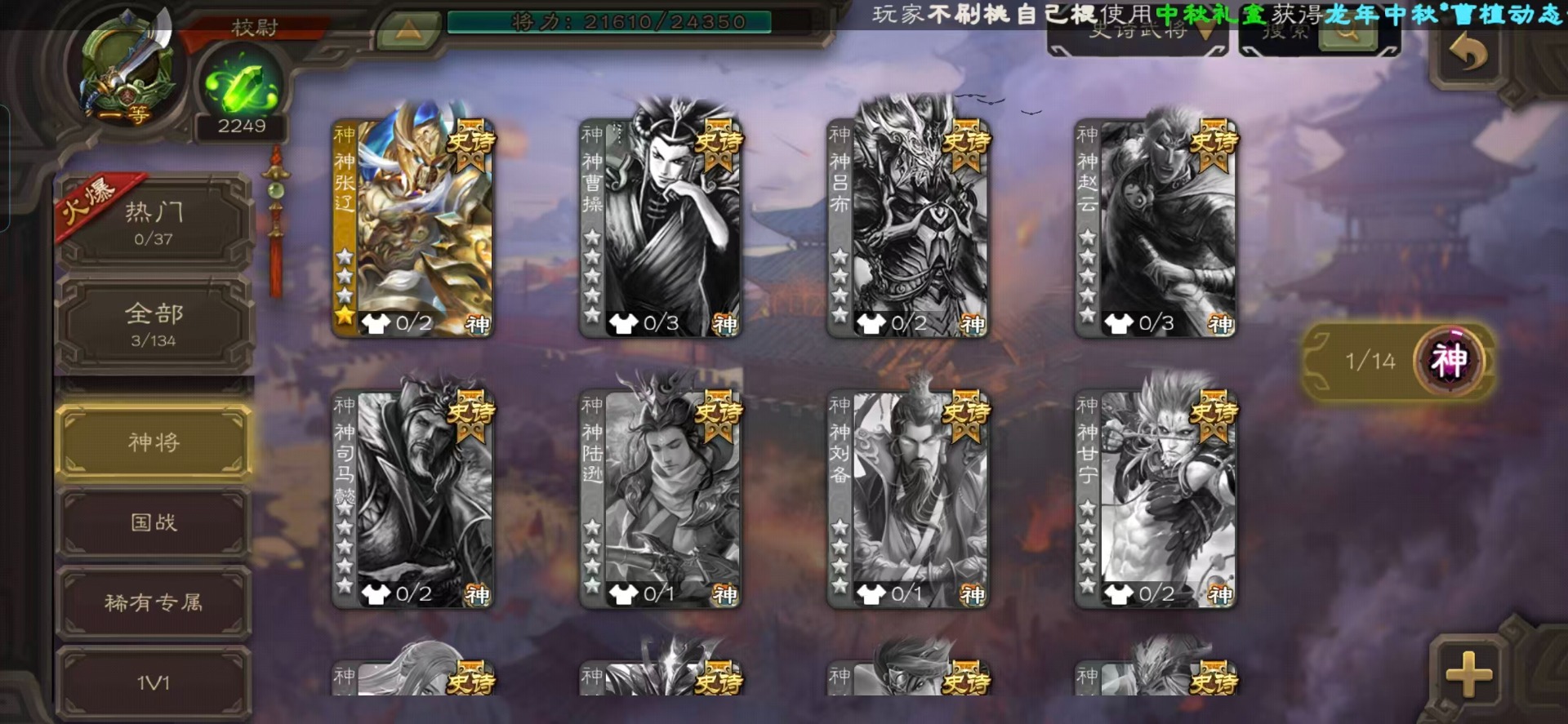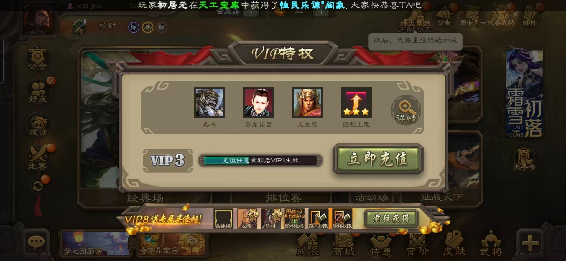 [14399328]vip3 校尉 135武将 3动态皮肤 3史诗武将 【神将】:神张辽 【魏国武将】:张恭甄姬 【蜀国武将】:谋诸葛亮马良诸葛果陈到黄忠诸葛亮张飞 【群国武将】:公孙康