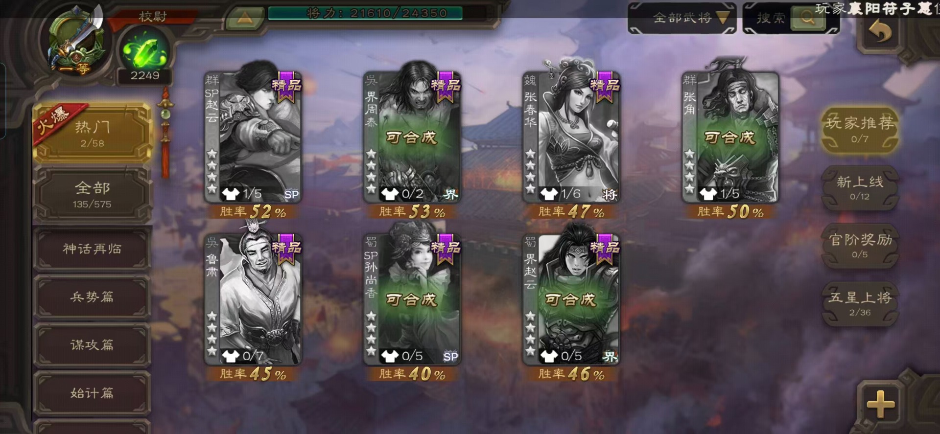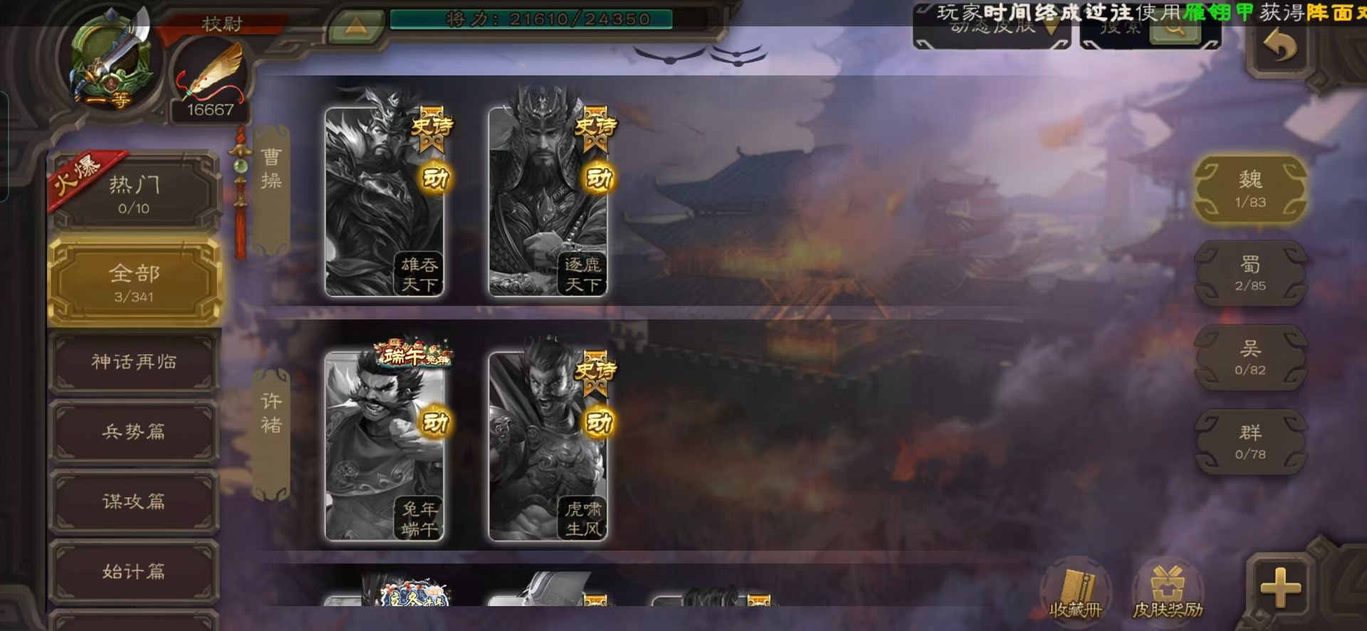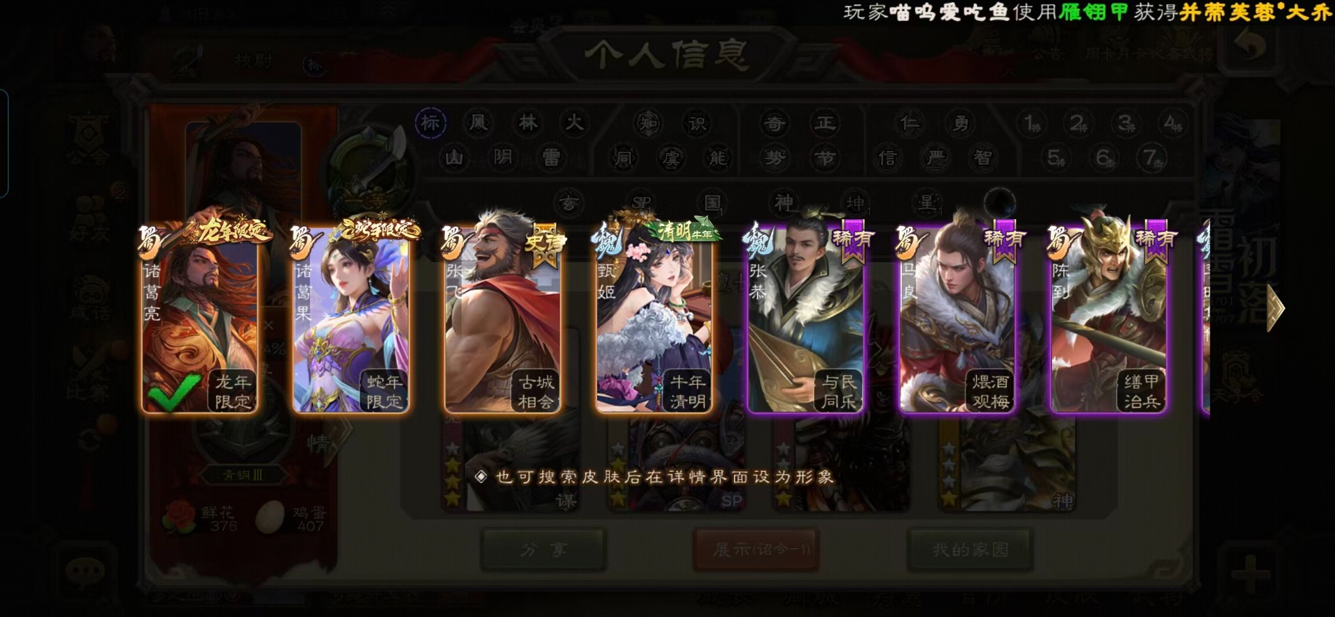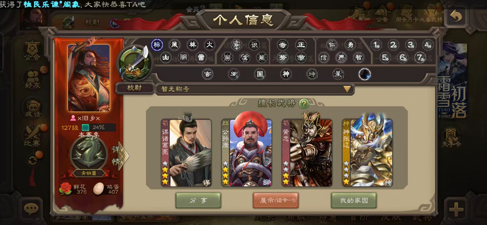 [14399328]vip3 校尉 135武将 3动态皮肤 3史诗武将 【神将】:神张辽 【魏国武将】:张恭甄姬 【蜀国武将】:谋诸葛亮马良诸葛果陈到黄忠诸葛亮张飞 【群国武将】:公孙康