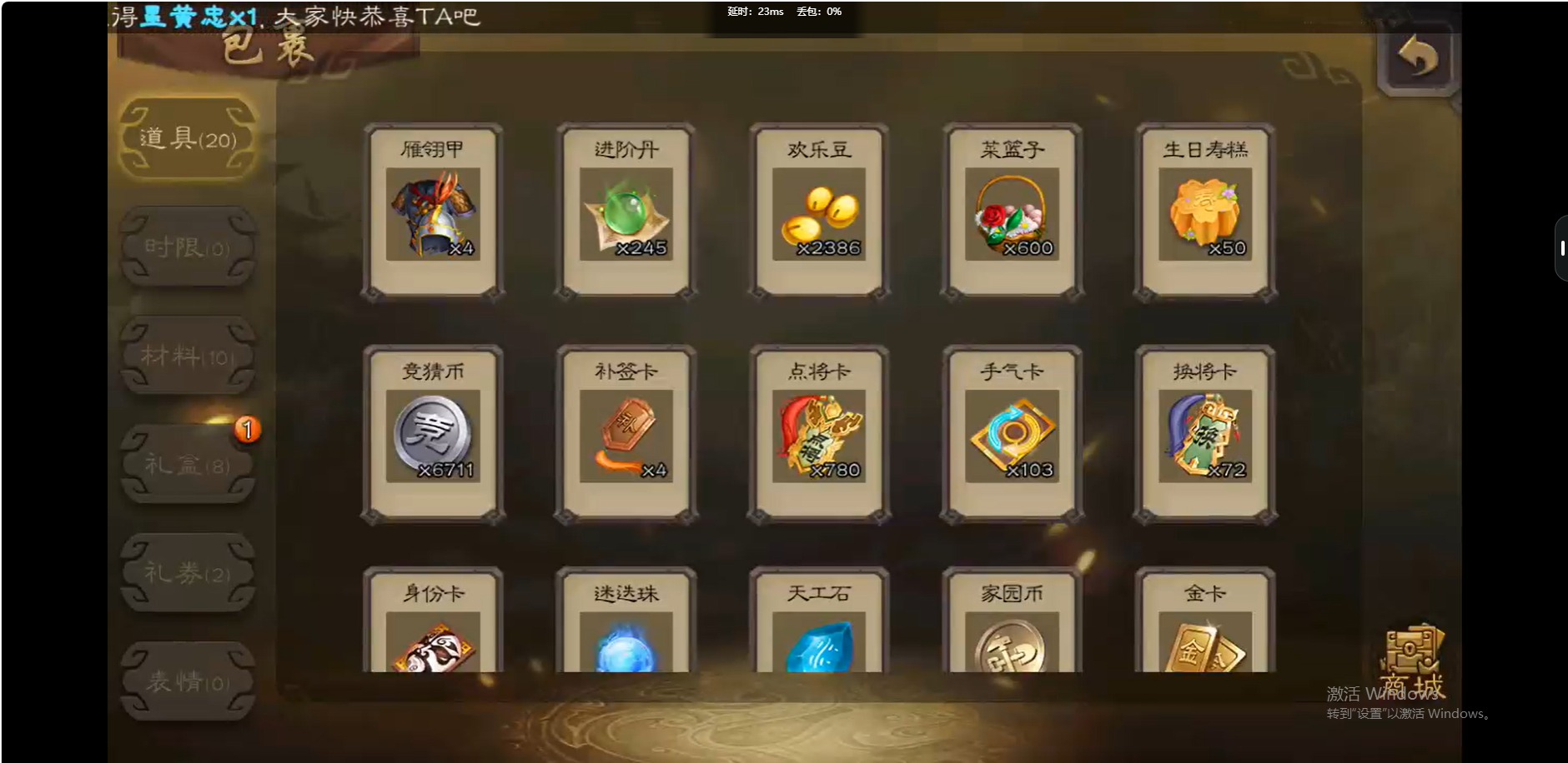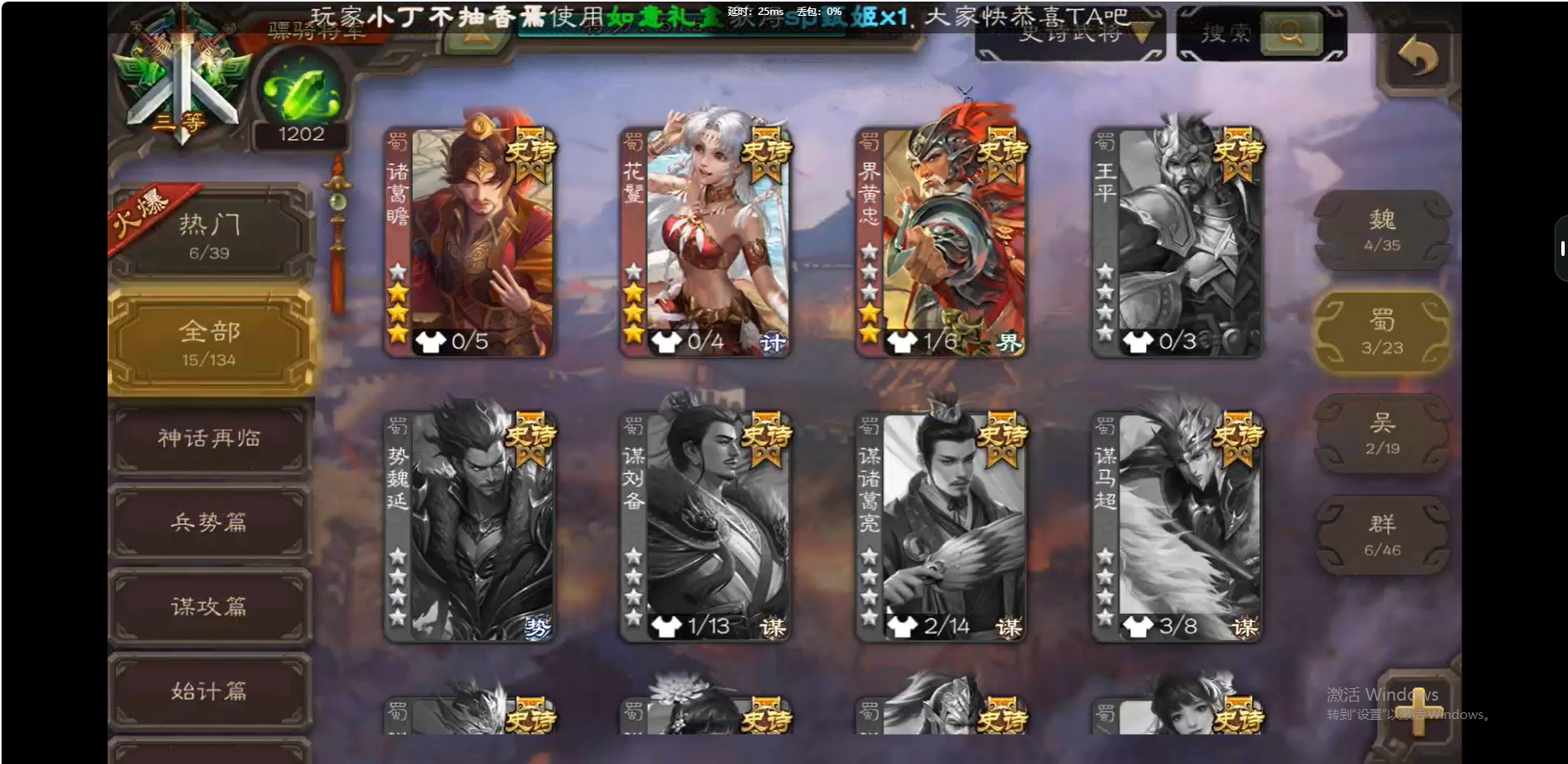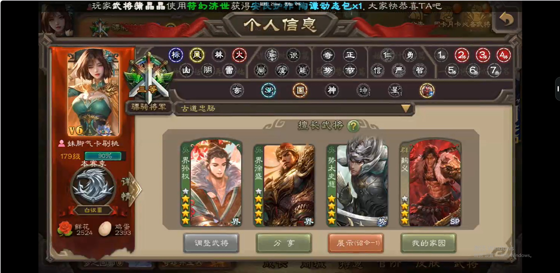[14399344]vip6 骠骑将军 259武将 8动态皮肤 15史诗武将 【魏国武将】:界钟会程昱曹纯戏志才 【蜀国武将】:诸葛瞻界黄忠花鬘 【吴国武将】:势太史慈界徐盛界孙权 【群国武将】:星董卓兀突骨麹义沮授公孙康谋张角