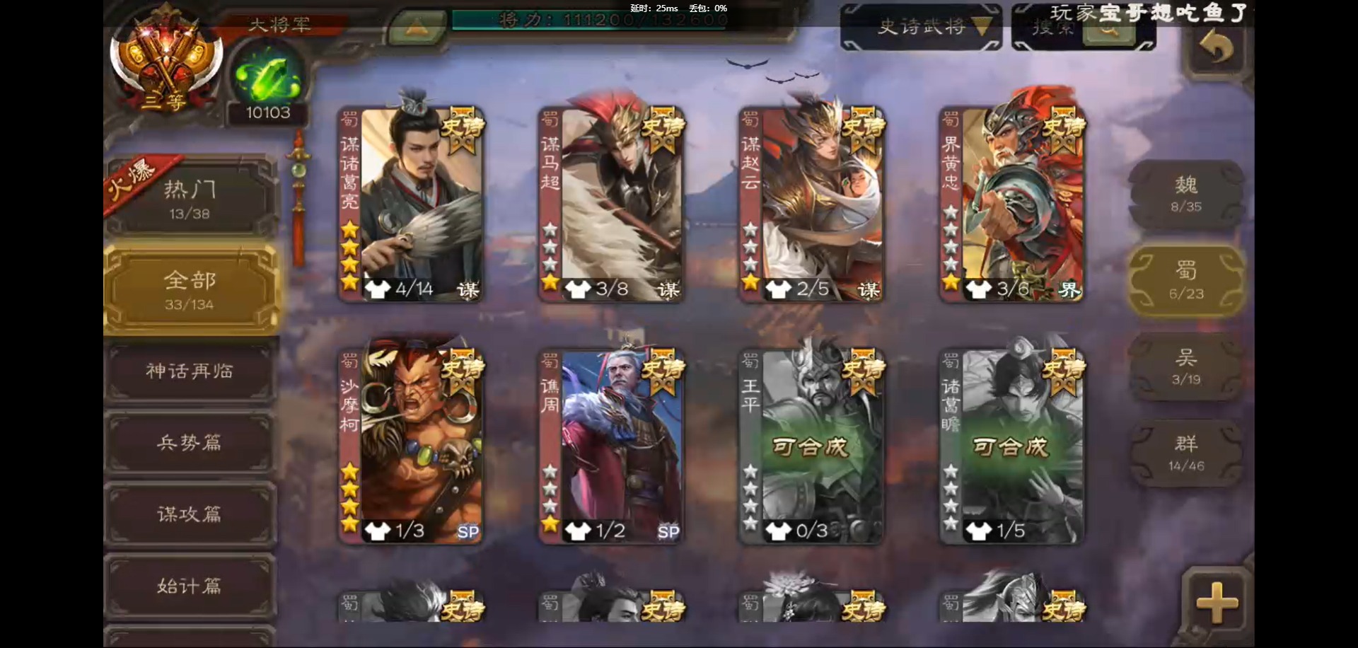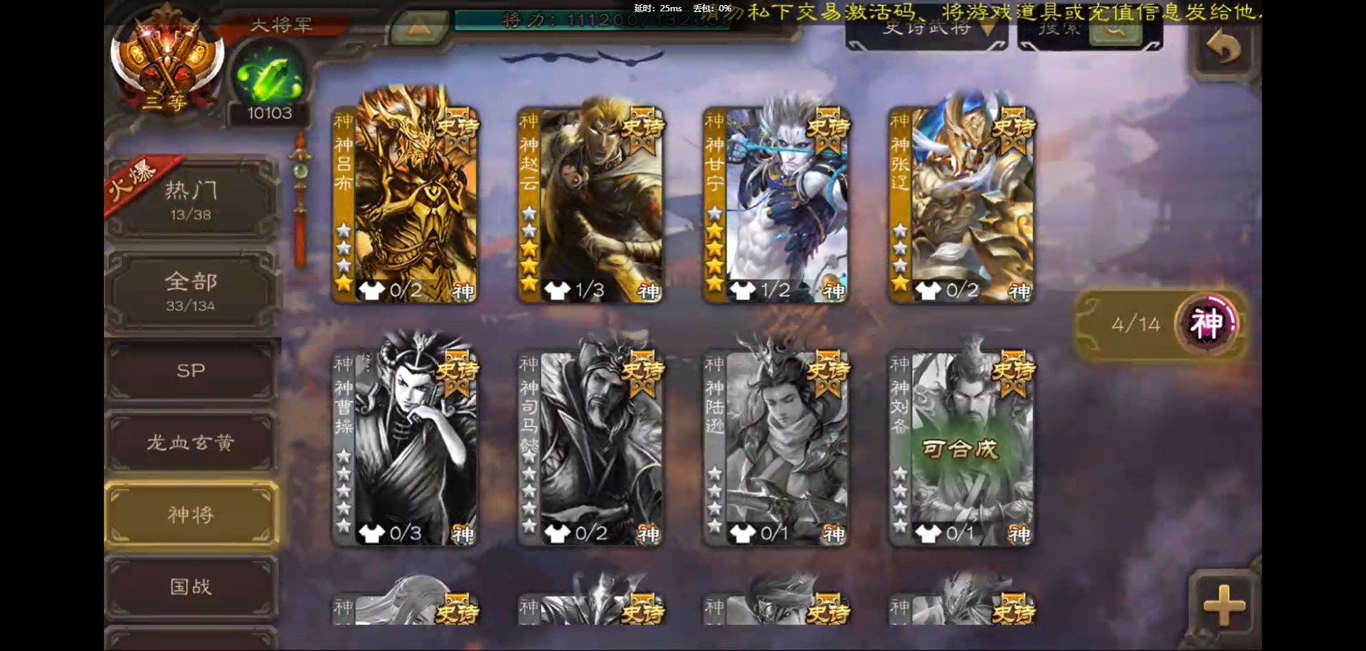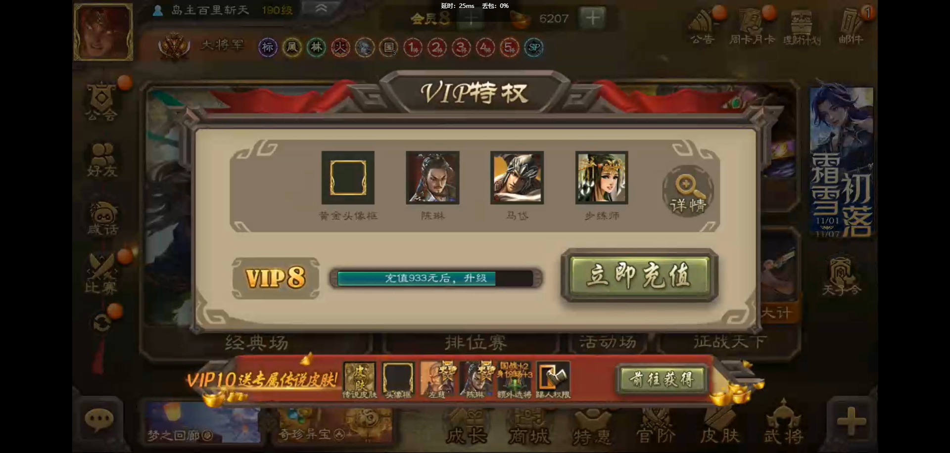 [14399357]vip8 大将军 341武将 38动态皮肤 33史诗武将 【神将】:神吕布神赵云神甘宁神张辽 【魏国武将】:星周不疑文鸯魏-司马昭界钟会界曹真程昱戏志才曹昂 【蜀国武将】:谋诸葛亮谋赵云谋马超沙摩柯谯周界黄忠卧龙诸葛赵云 【吴国武将】:文鸯界徐盛贺齐吕蒙 【群国武将】:星董卓势于吉群-司马昭左慈张让兀突骨麹义南华老仙沮授界左慈界李儒公孙康卑弥呼谋张角李儒许攸袁绍