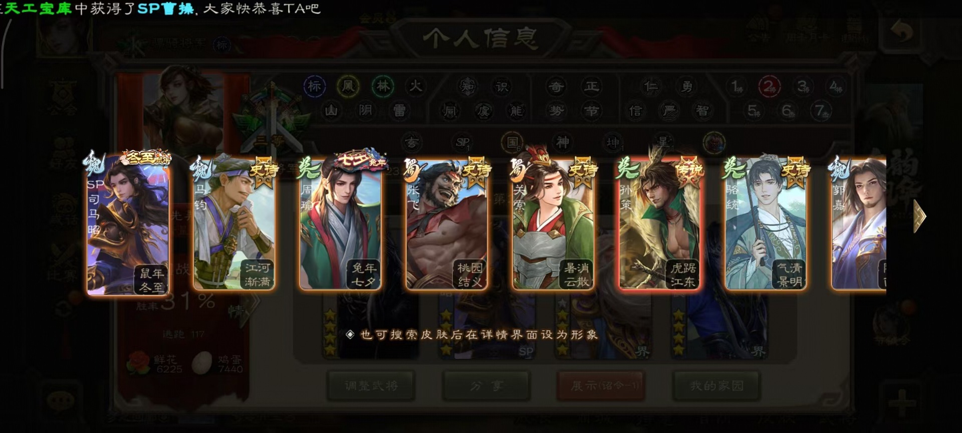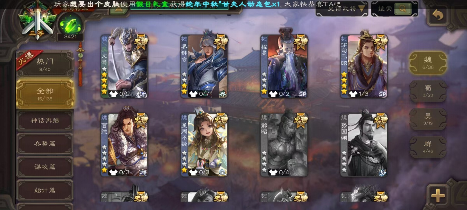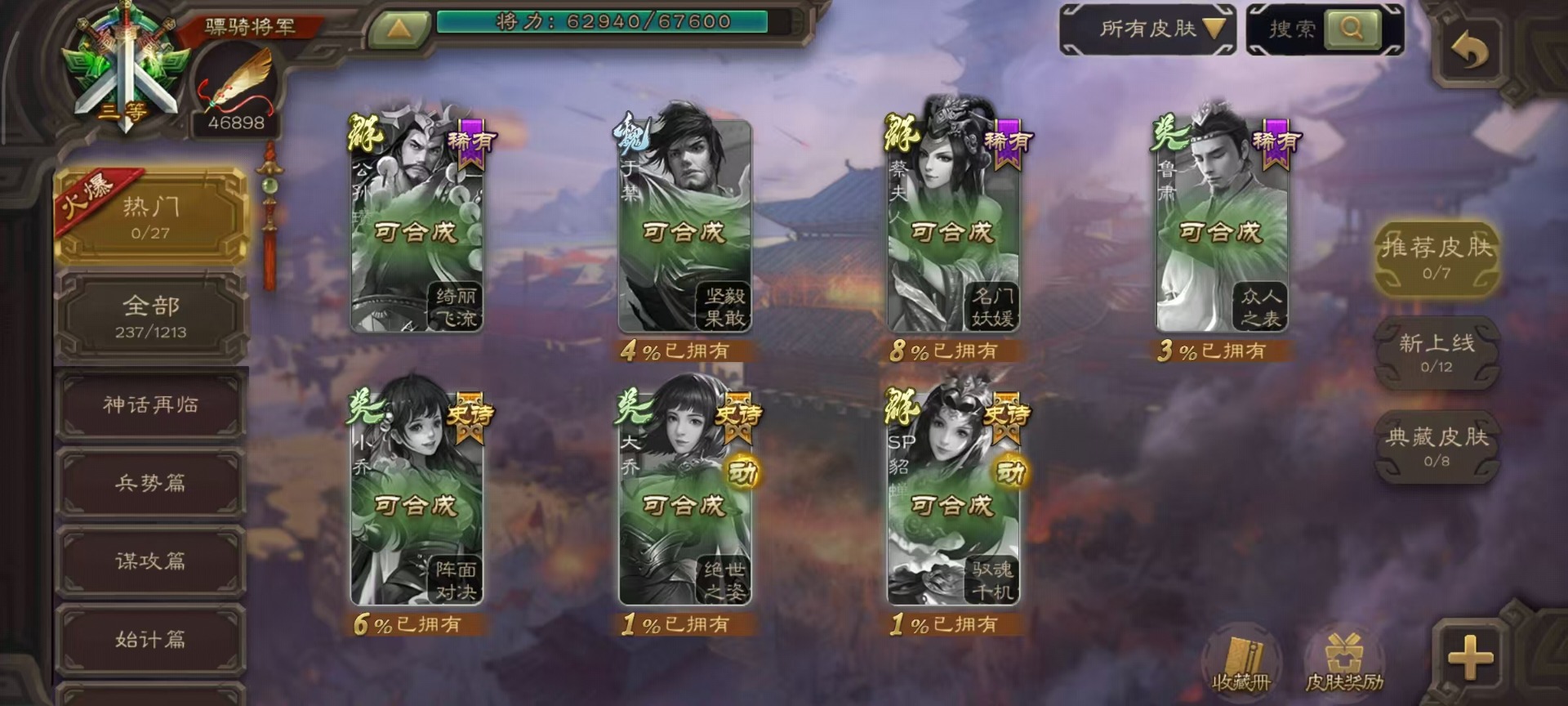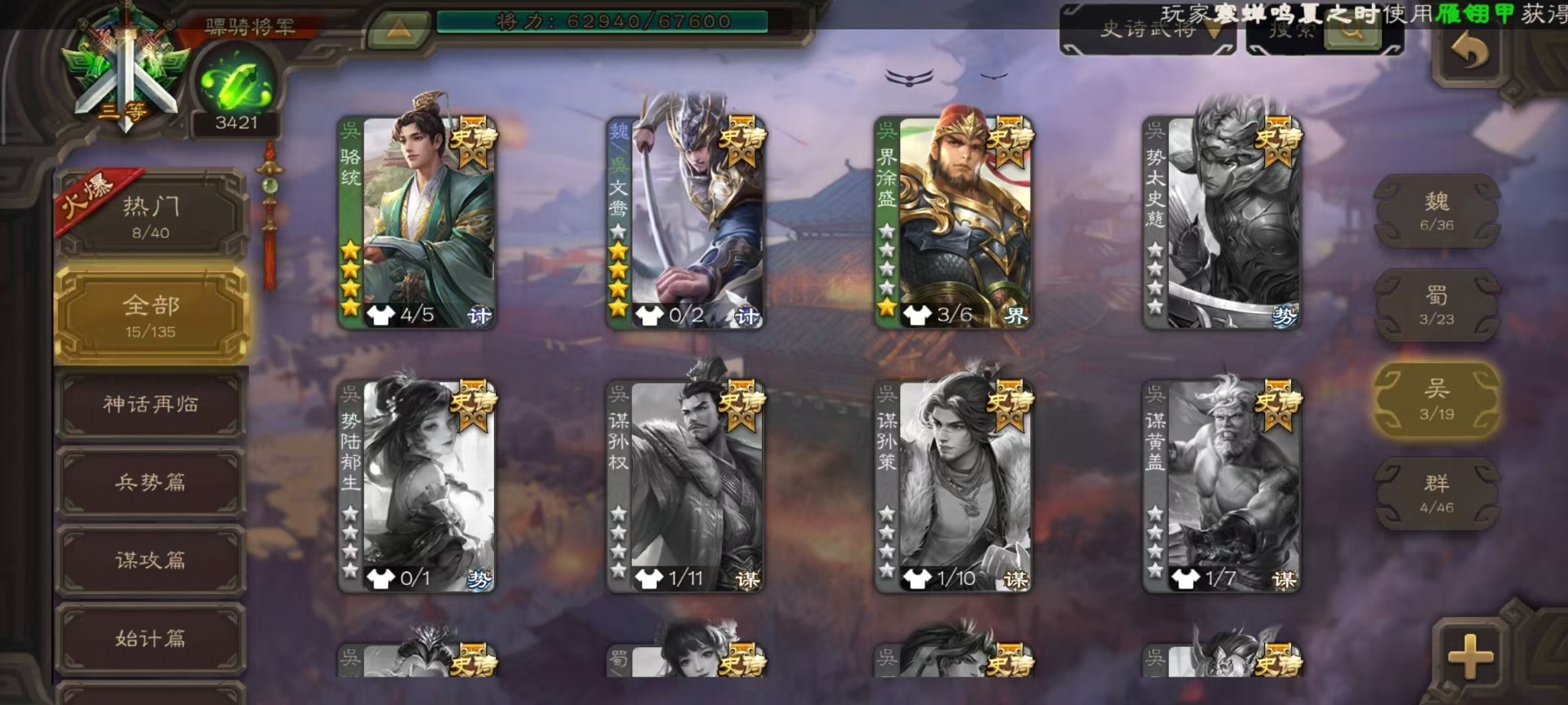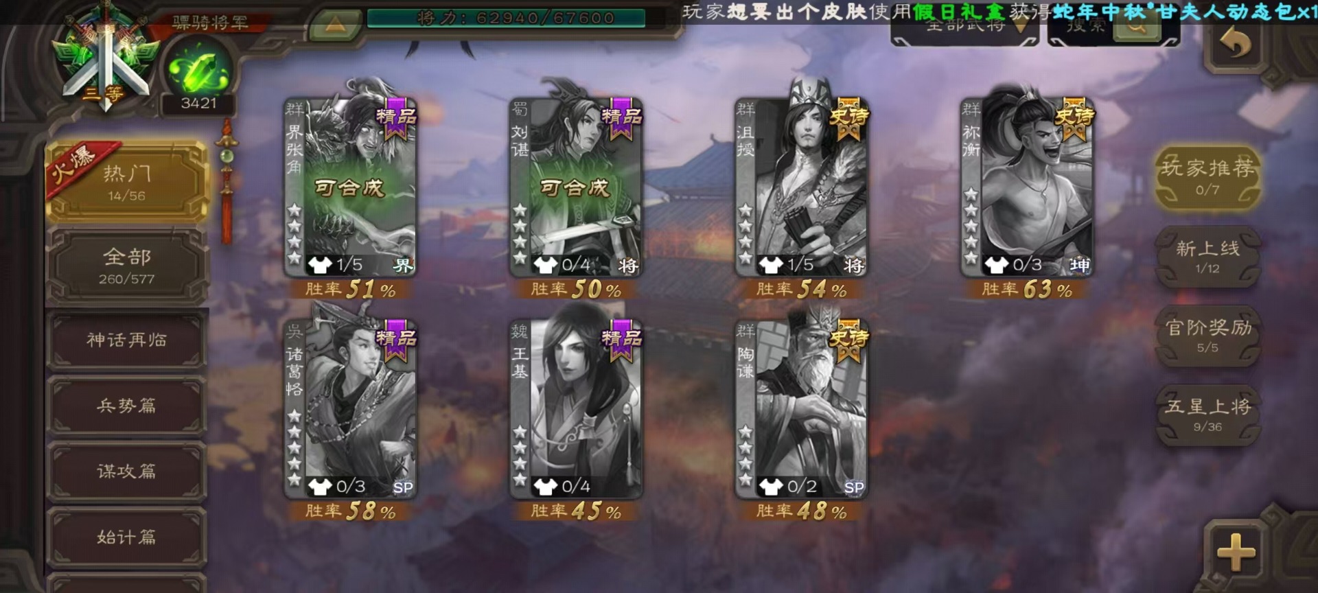 [14399864]vip8 骠骑将军 260武将 13动态皮肤 15史诗武将 7宝珠 【魏国武将】:sp司马昭星周不疑文鸯界钟会程昱曹纯 【蜀国武将】:谋赵云谋马超花鬘 【吴国武将】:文鸯骆统界徐盛 【群国武将】:左慈兀突骨界左慈杜预