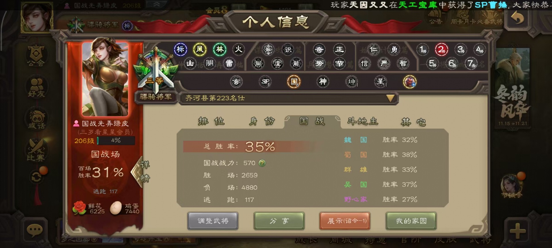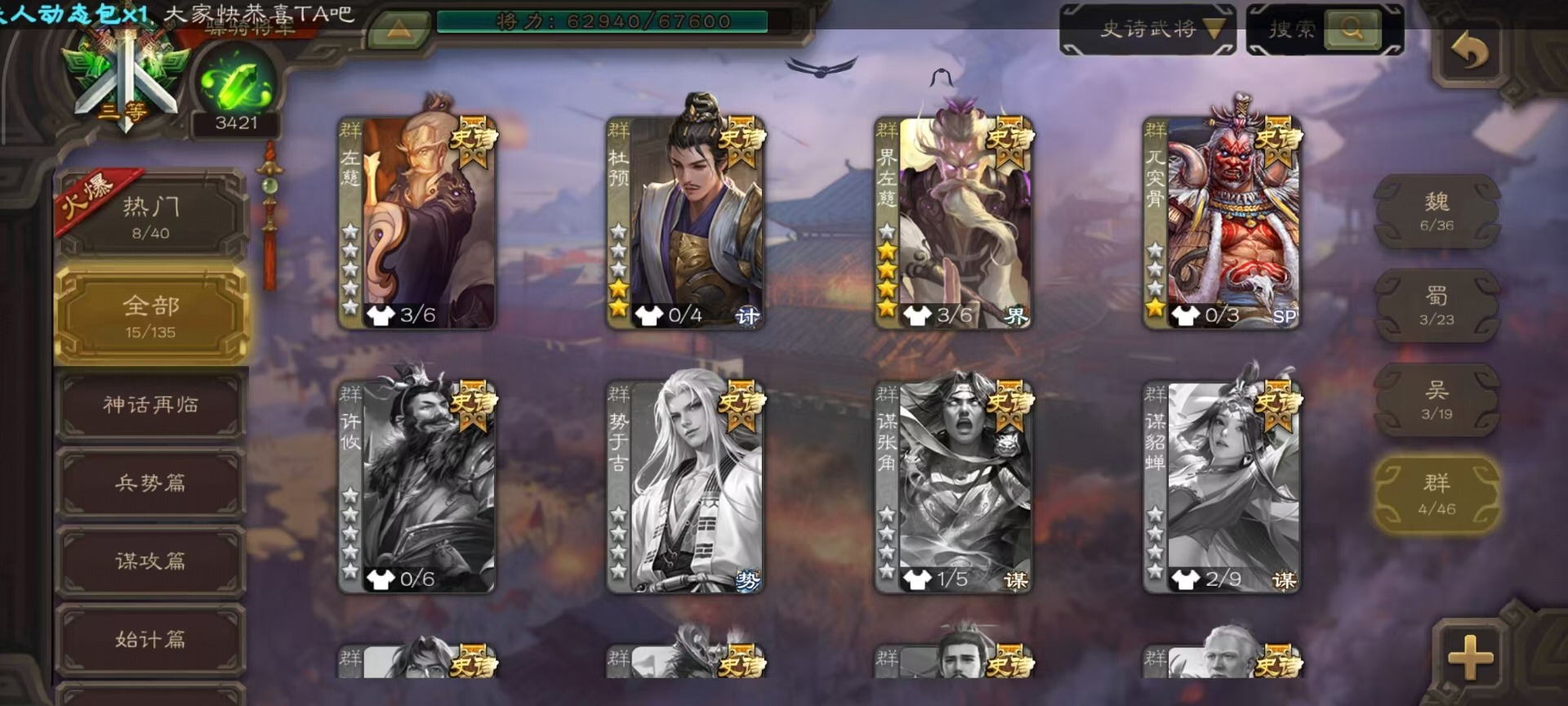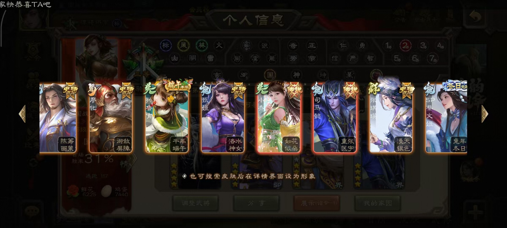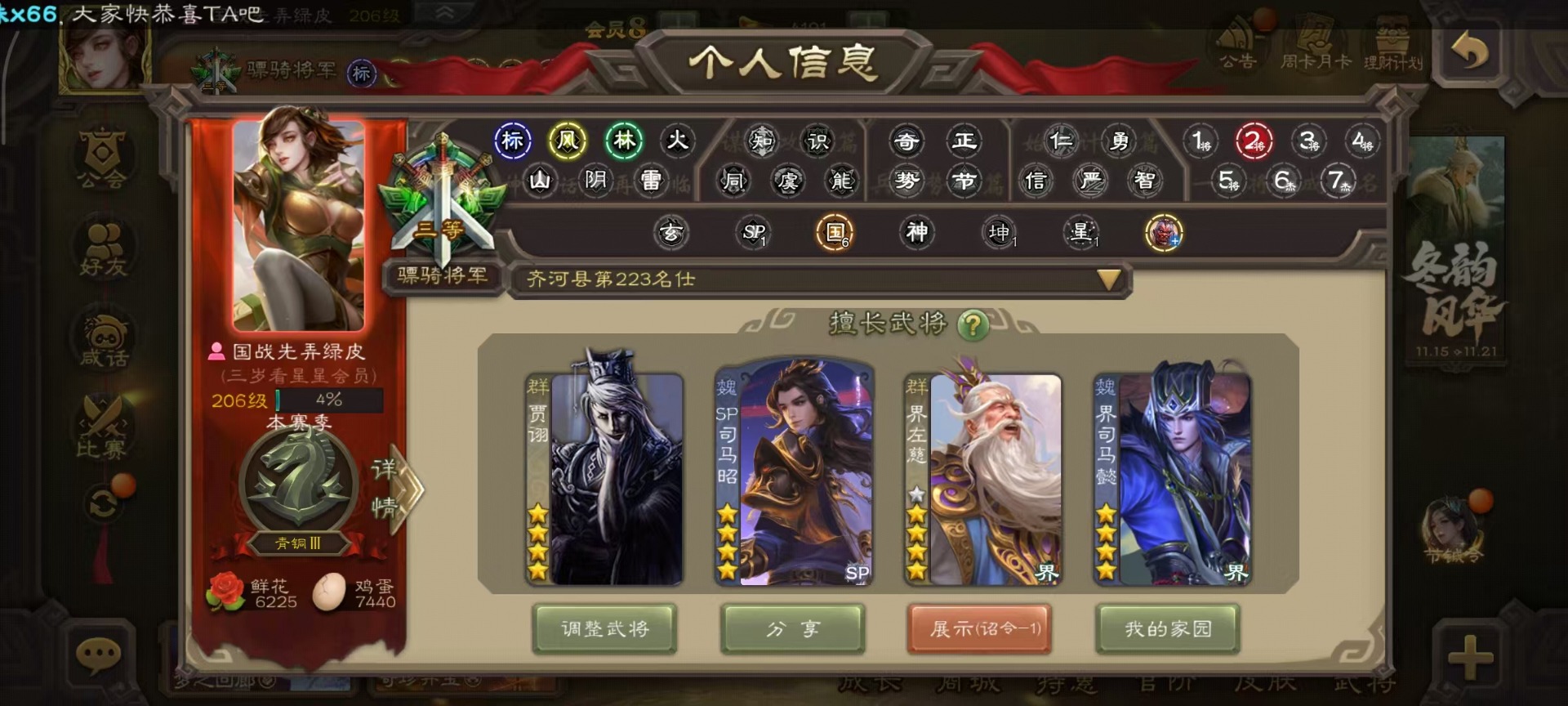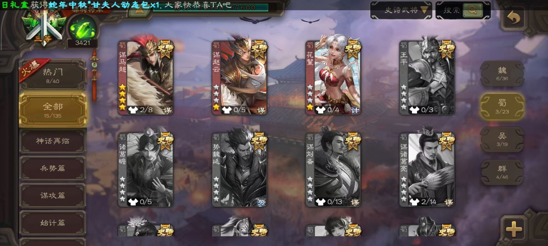 [14399864]vip8 骠骑将军 260武将 13动态皮肤 15史诗武将 7宝珠 【魏国武将】:sp司马昭星周不疑文鸯界钟会程昱曹纯 【蜀国武将】:谋赵云谋马超花鬘 【吴国武将】:文鸯骆统界徐盛 【群国武将】:左慈兀突骨界左慈杜预