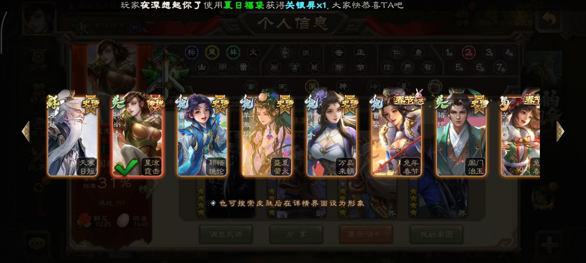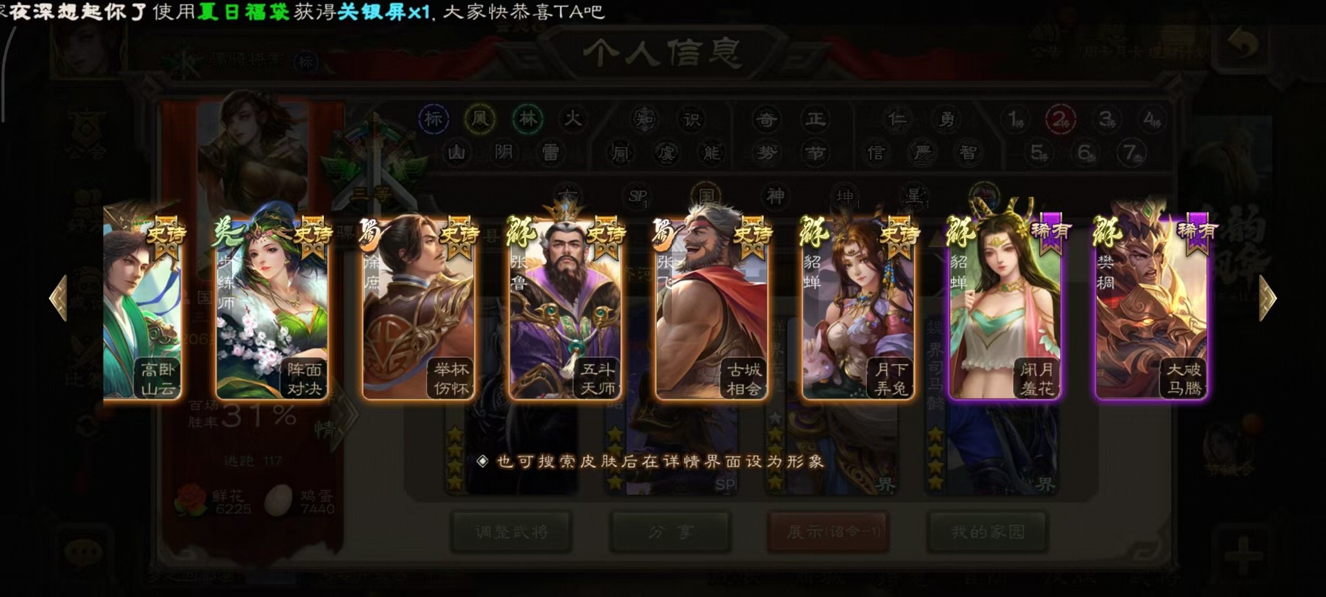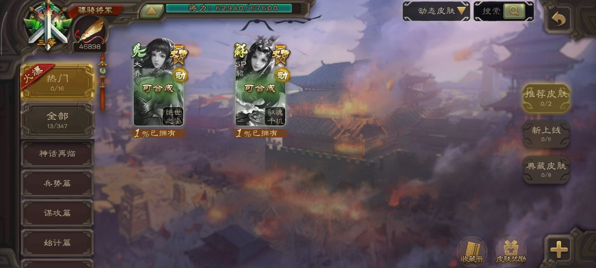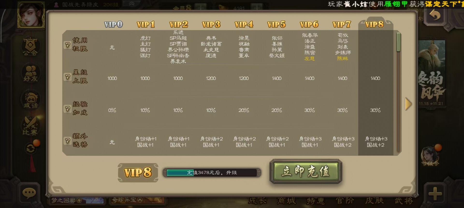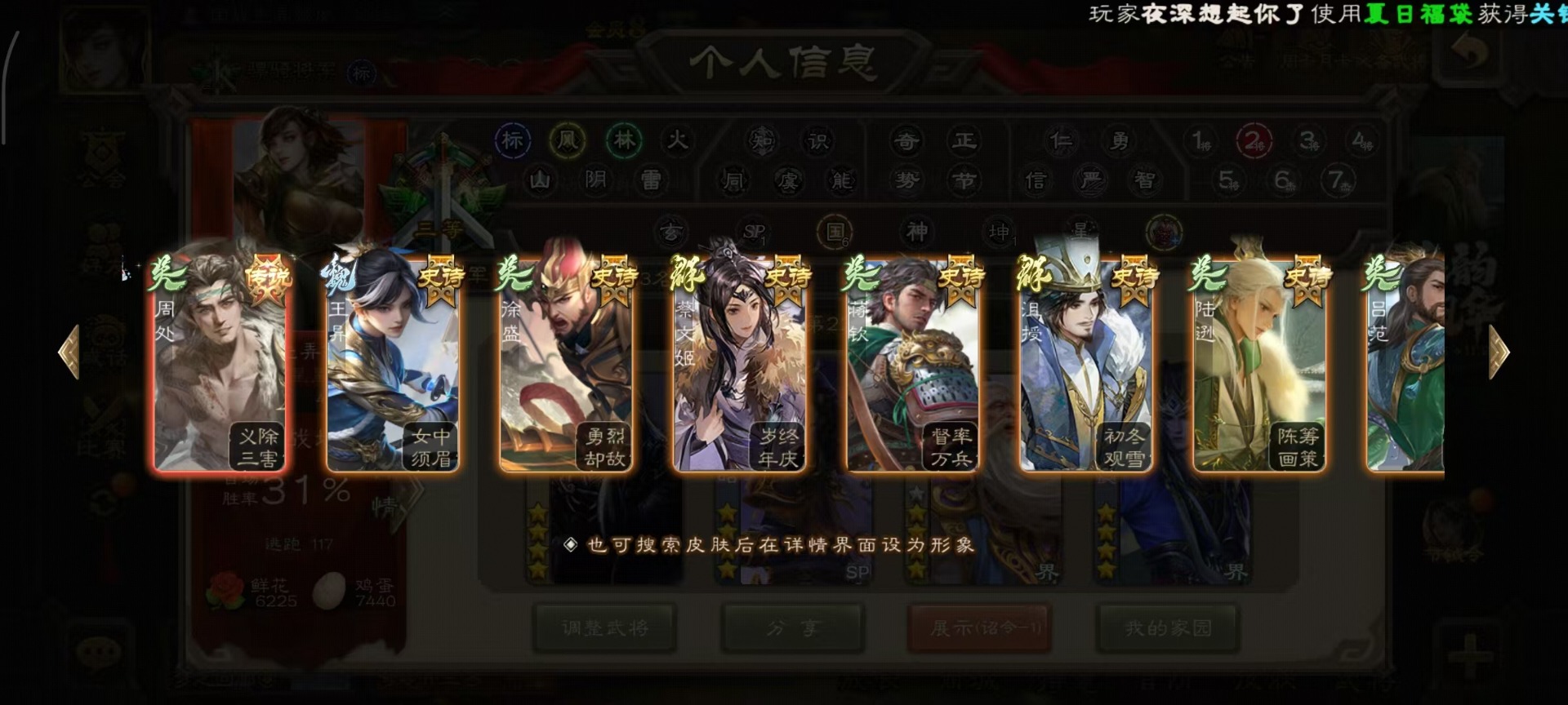 [14399864]vip8 骠骑将军 260武将 13动态皮肤 15史诗武将 7宝珠 【魏国武将】:sp司马昭星周不疑文鸯界钟会程昱曹纯 【蜀国武将】:谋赵云谋马超花鬘 【吴国武将】:文鸯骆统界徐盛 【群国武将】:左慈兀突骨界左慈杜预
