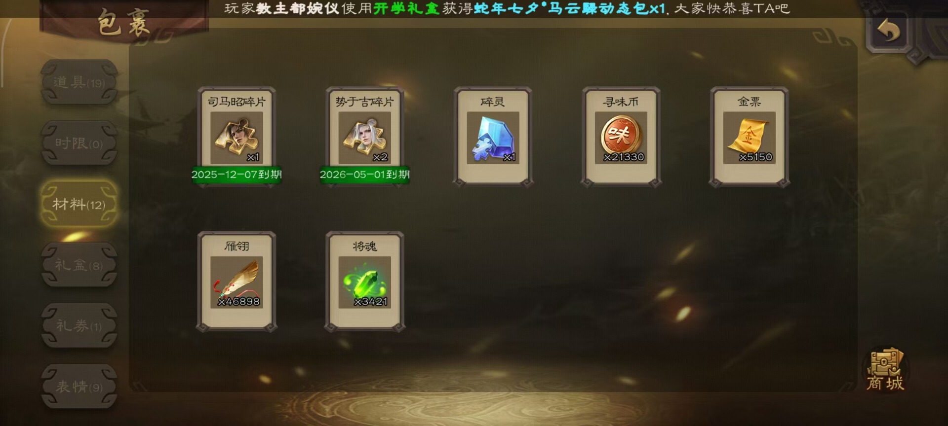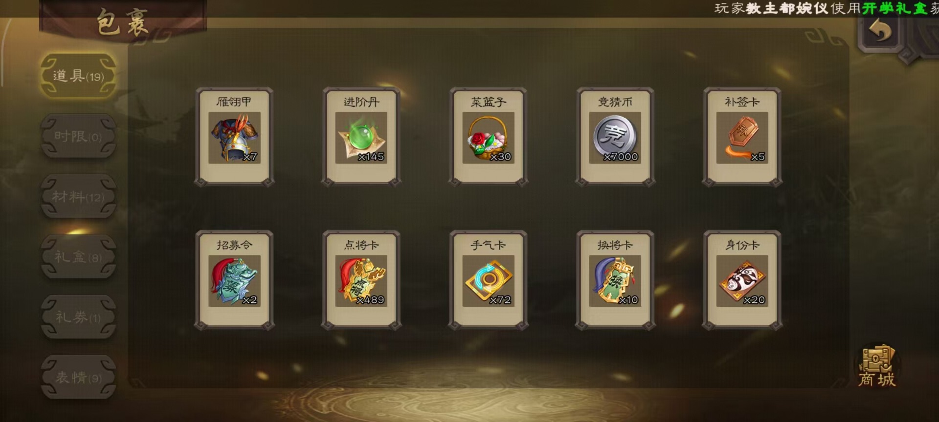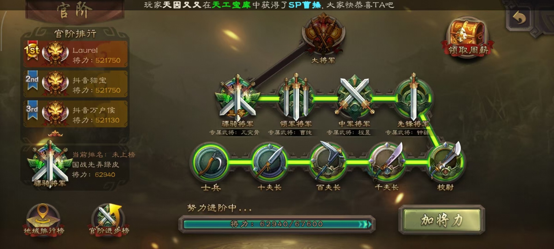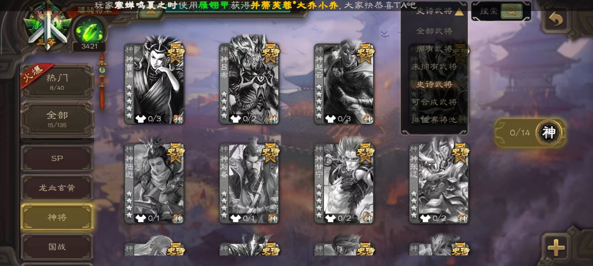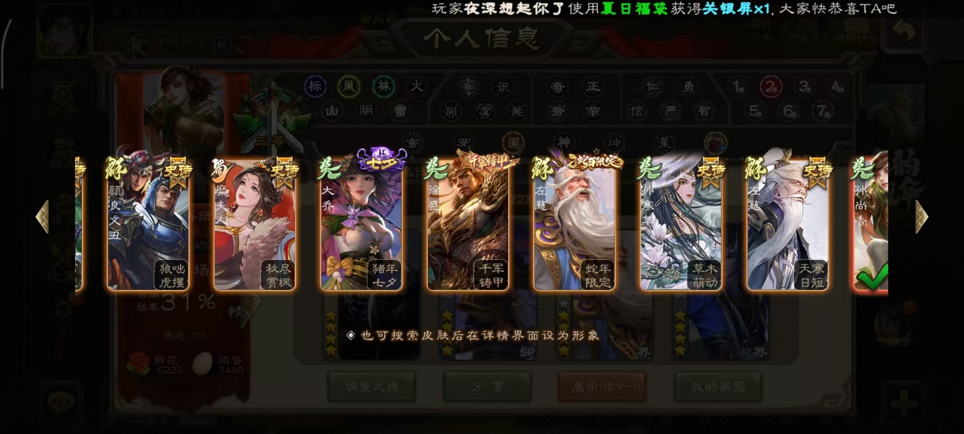 [14399864]vip8 骠骑将军 260武将 13动态皮肤 15史诗武将 7宝珠 【魏国武将】:sp司马昭星周不疑文鸯界钟会程昱曹纯 【蜀国武将】:谋赵云谋马超花鬘 【吴国武将】:文鸯骆统界徐盛 【群国武将】:左慈兀突骨界左慈杜预
