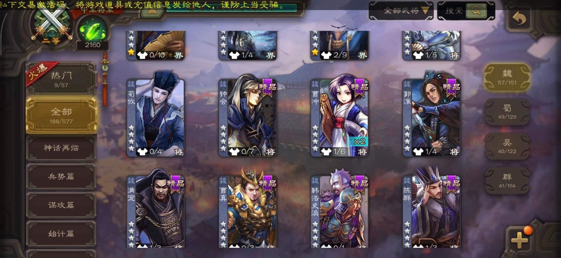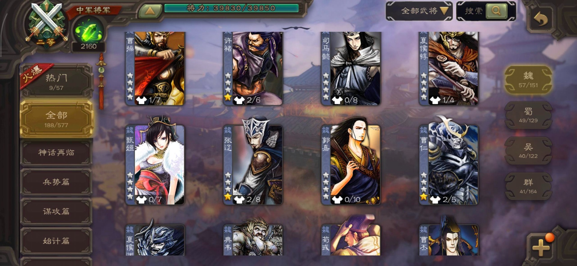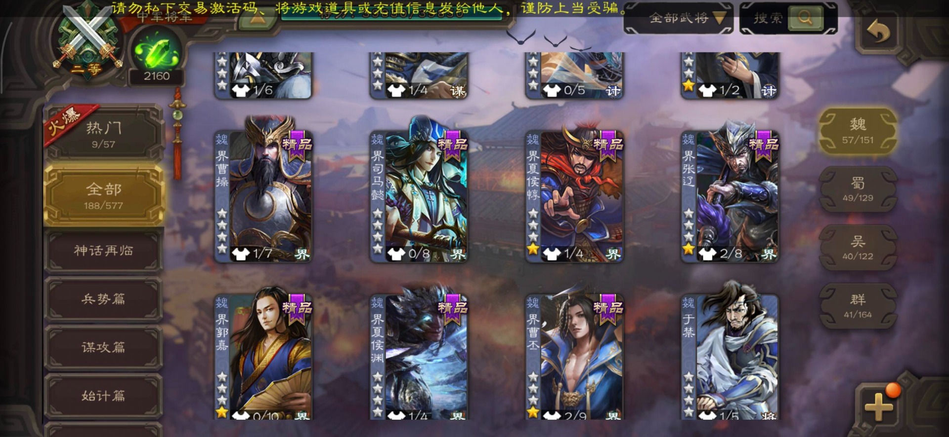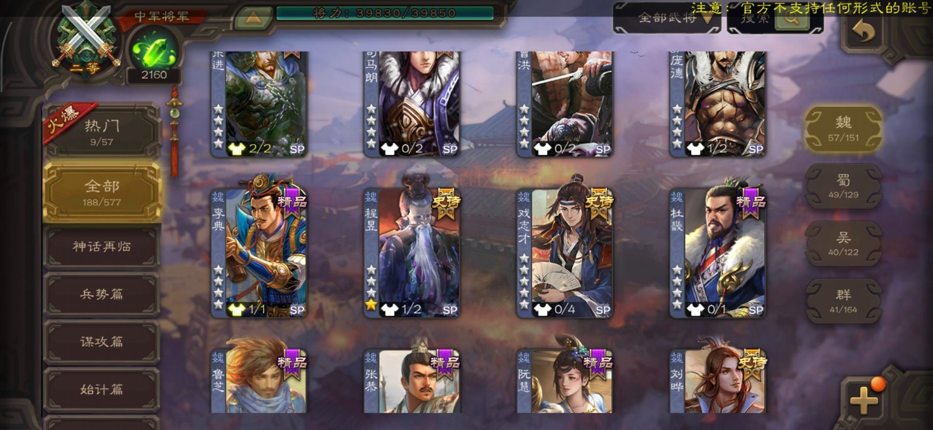 [14399882]vip7 中军将军 188武将 4动态皮肤 11史诗武将 【魏国武将】:程昱戏志才界司马懿于禁界夏侯渊界夏侯惇界张辽界曹操界曹丕崔琰界郭嘉蔡贞姬邓艾夏侯渊典韦甄姬司马懿许褚夏侯惇荀彧郭嘉曹仁曹丕曹操张辽