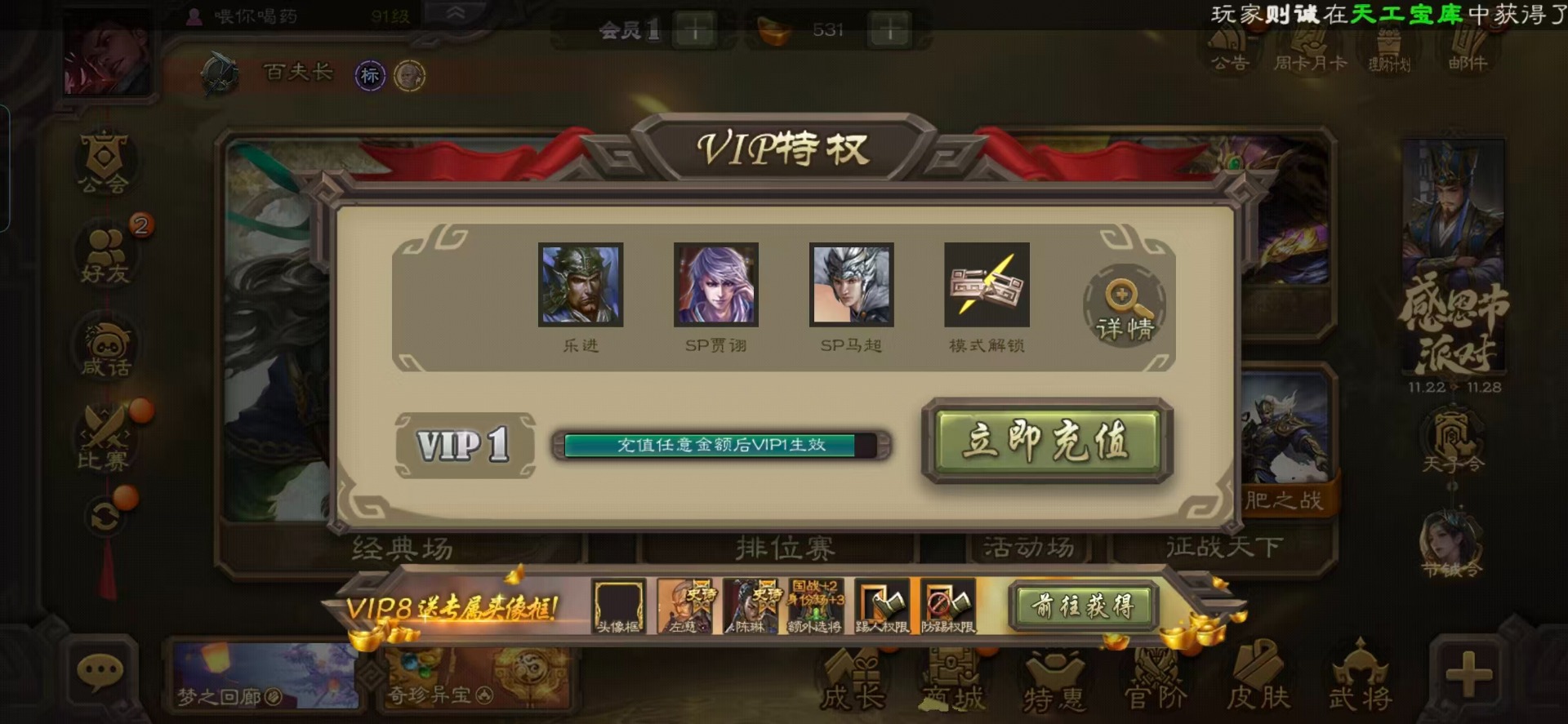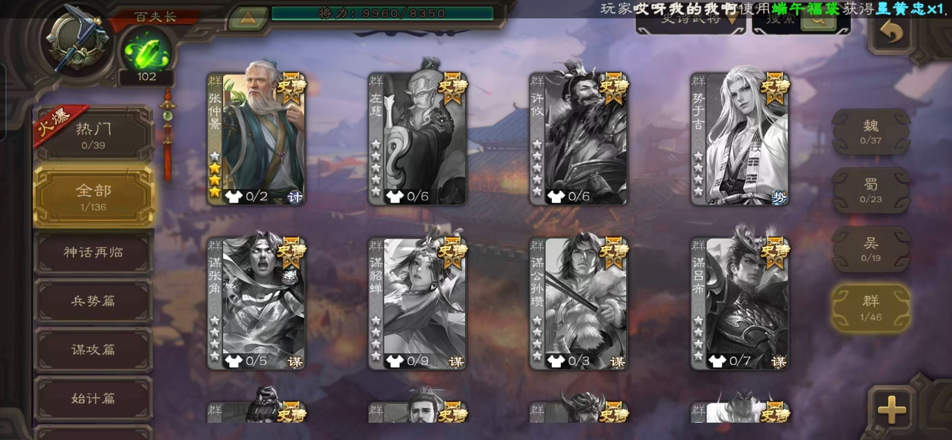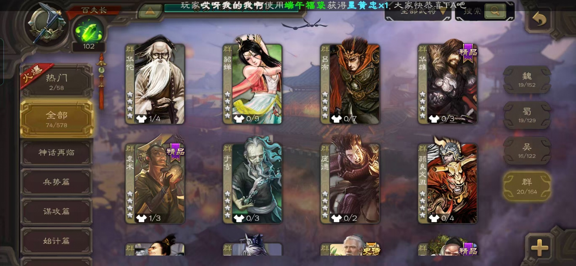 [14400602]vip1 百夫长 74武将 1史诗武将 【群国武将】:张仲景袁术华雄颜良文丑貂蝉华佗吕布于吉