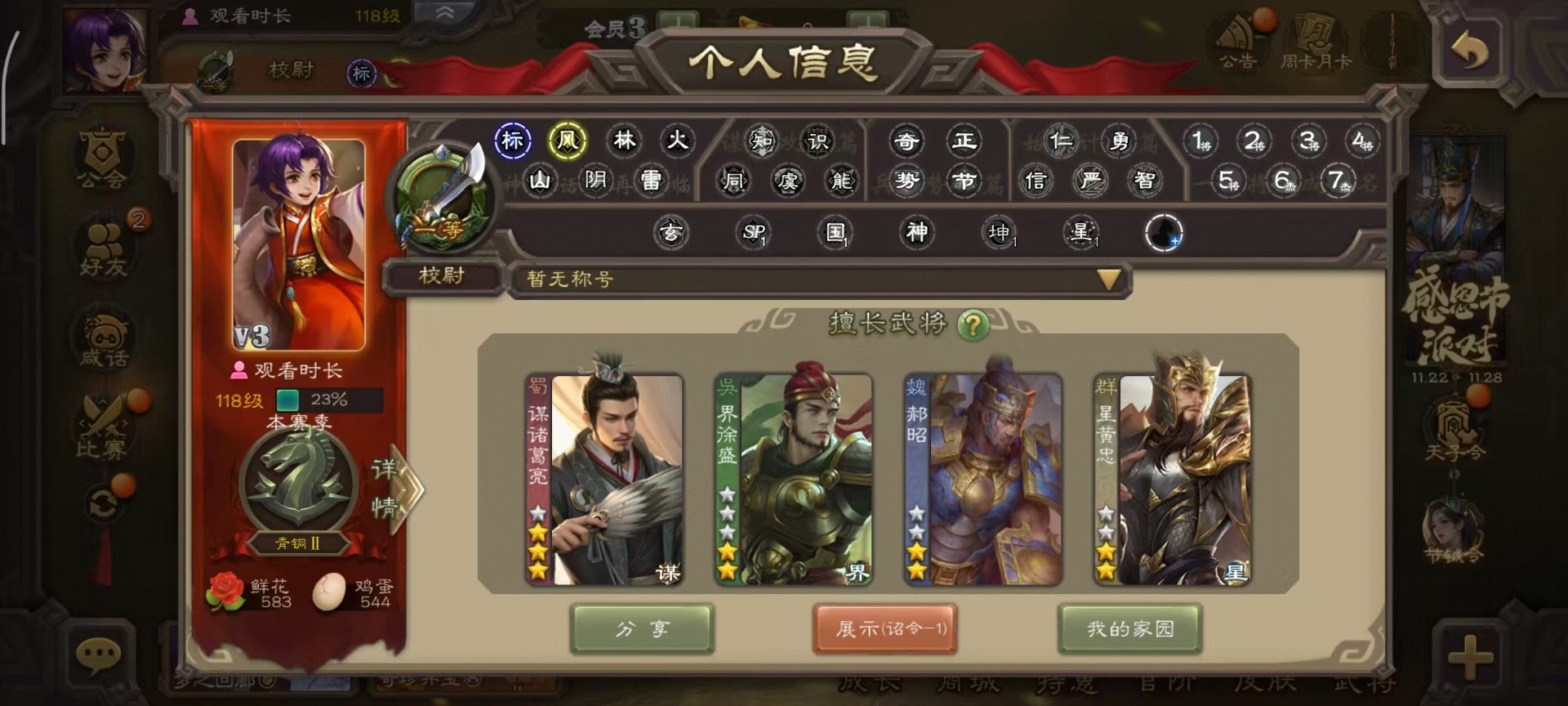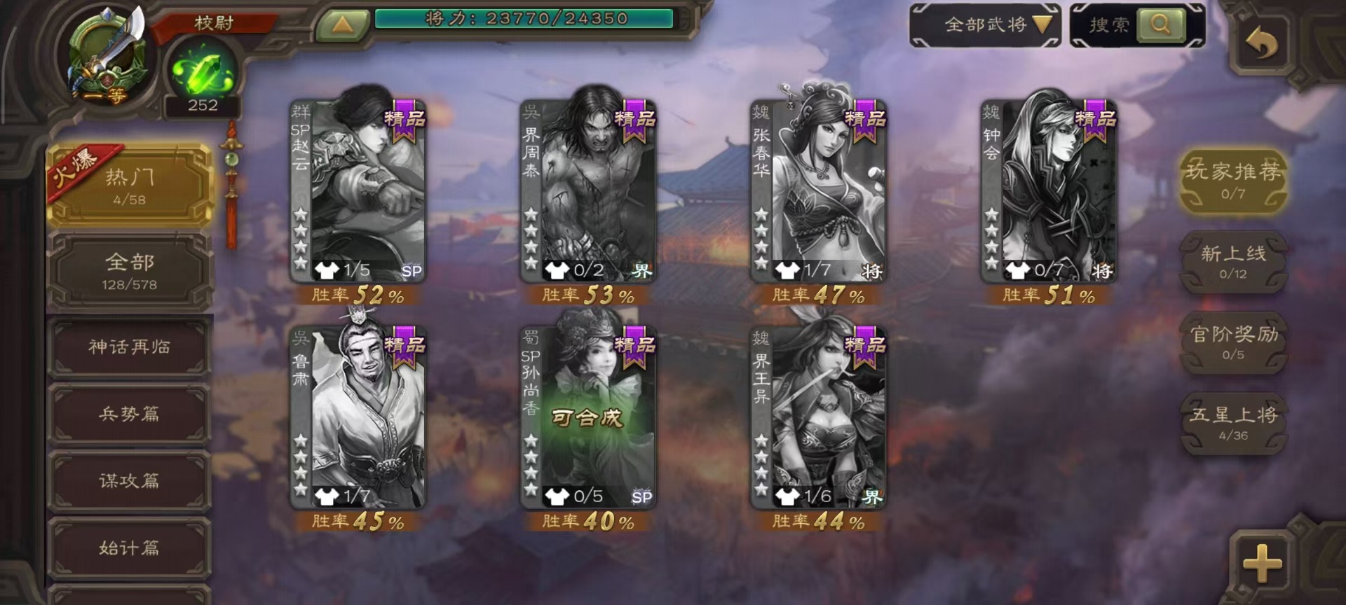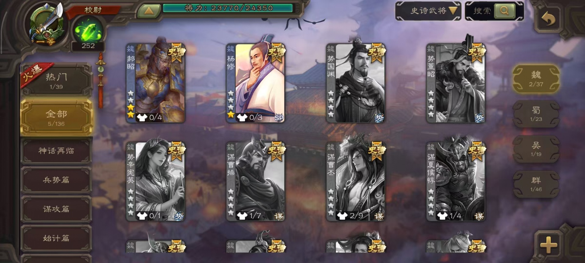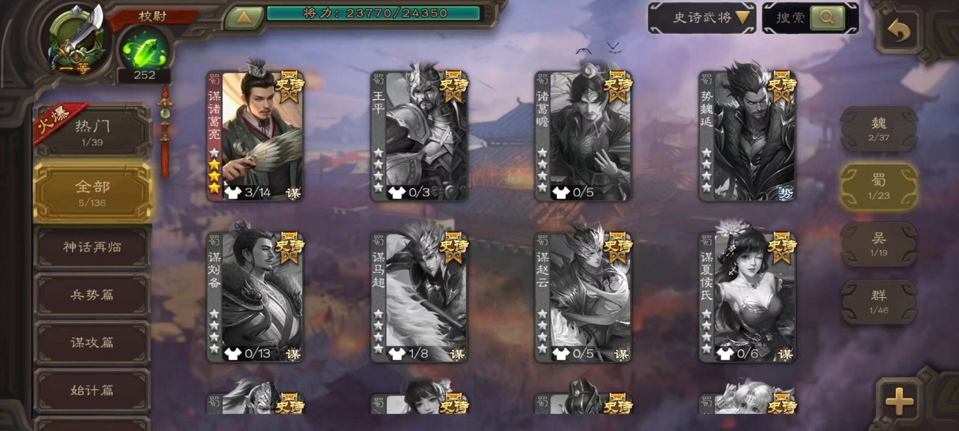 [14493662]vip3 校尉 128武将 4动态皮肤 5史诗武将 【魏国武将】:杨修郝昭 【蜀国武将】:谋诸葛亮 【吴国武将】:界徐盛 【群国武将】:星黄忠