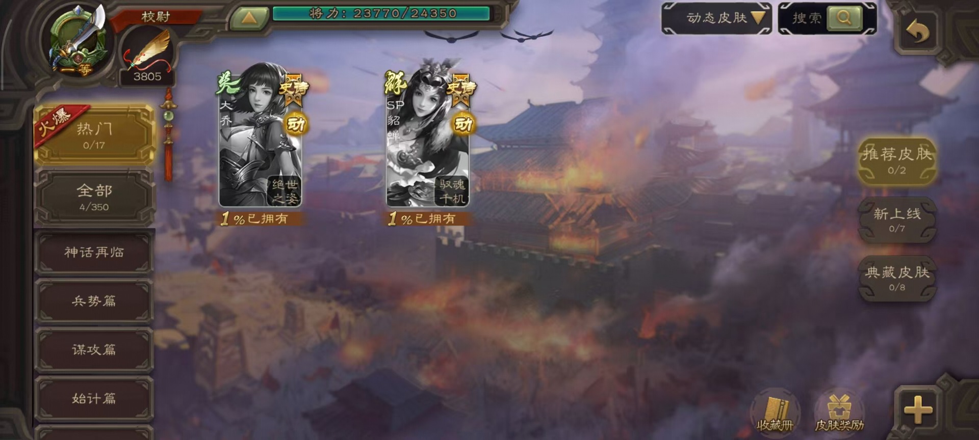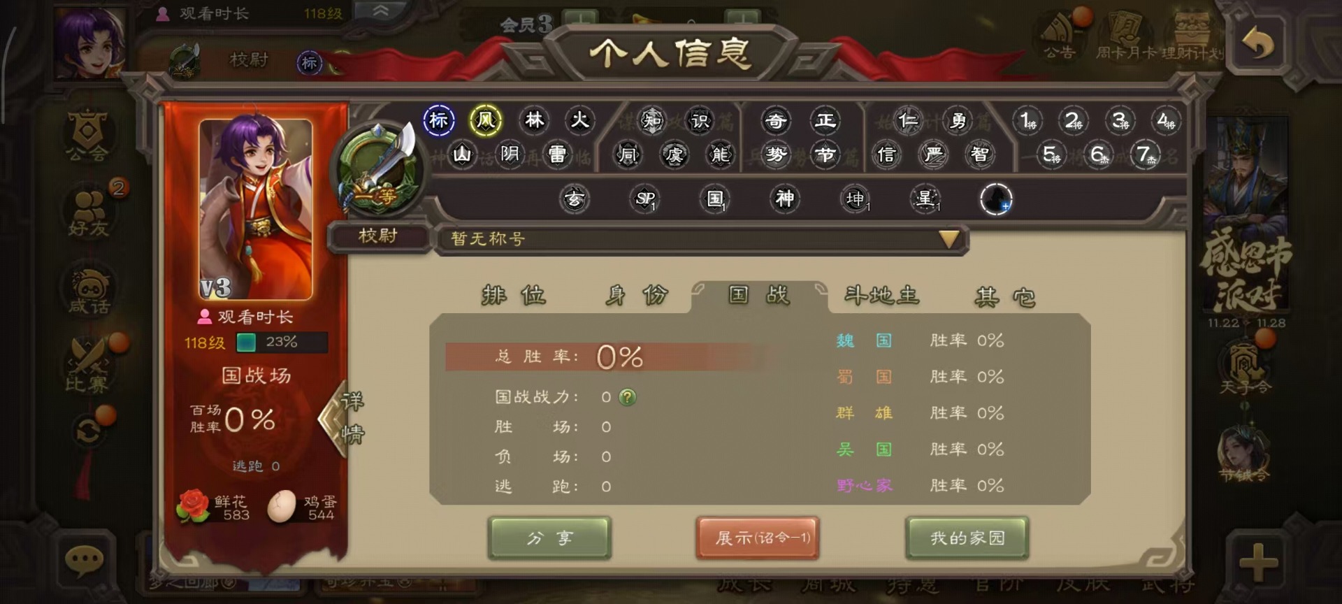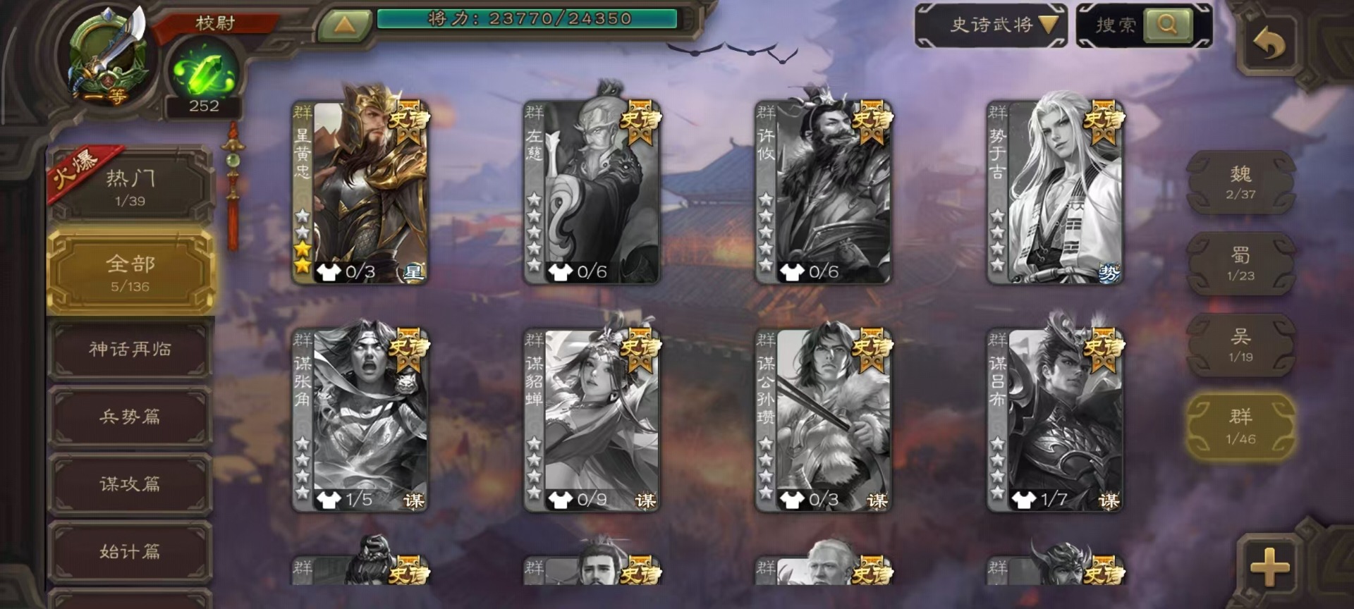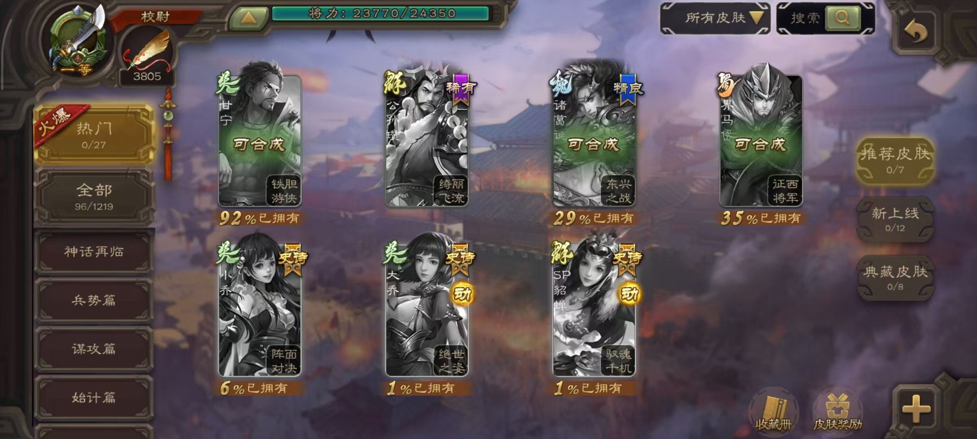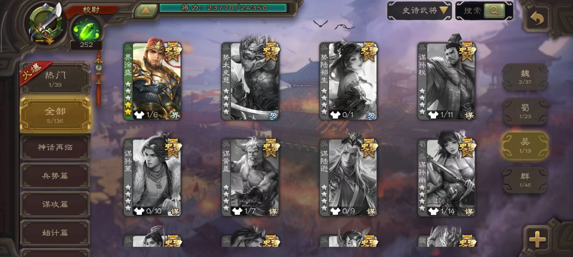 [14493662]vip3 校尉 128武将 4动态皮肤 5史诗武将 【魏国武将】:杨修郝昭 【蜀国武将】:谋诸葛亮 【吴国武将】:界徐盛 【群国武将】:星黄忠