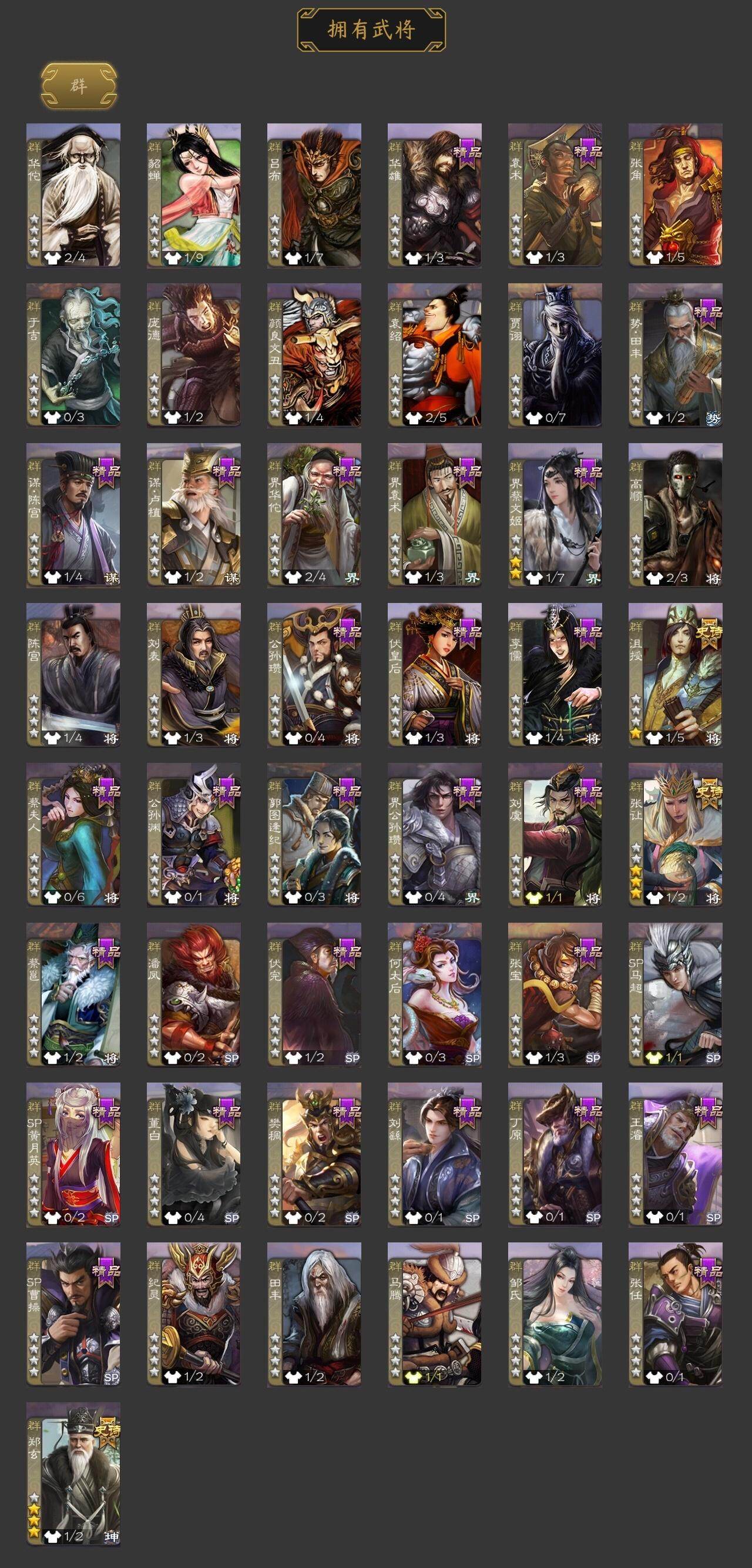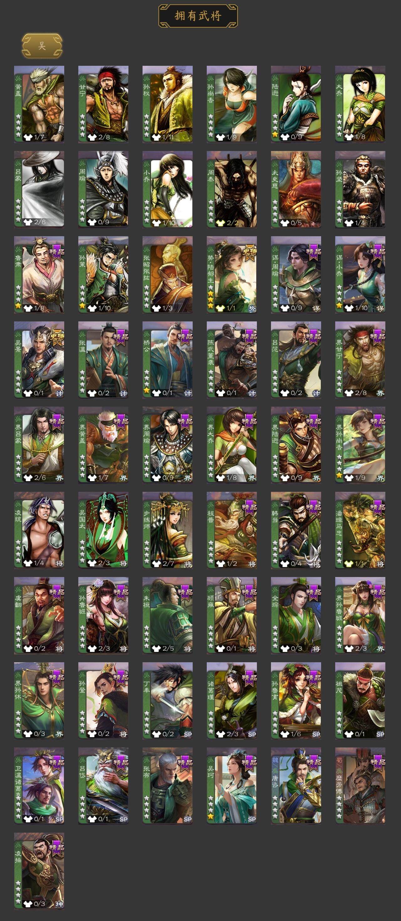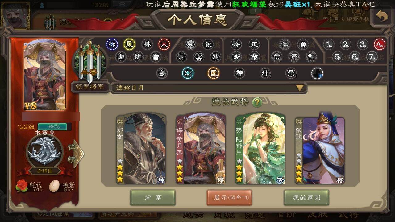 [15166234]【179】官阶:领军将军;vip等级:vip8;史诗武将数量:12;动态皮肤数量:5;武将总数:223;史诗宝珠数量:0;将魂数量:101;神将:2;魏国史诗武将:0;蜀国史诗武将:2;吴国史诗武将:2;群史诗武将:4 神张辽神吕蒙界钟会曹纯戏志才周群谯周吴景势陆郁生谋黄月英郑玄张让沮授神吕蒙-心生万象周群-卜卦观签动态黄月英-虎年中秋动态鲁肃-蛇年端午动态陶谦-安民护祚动态