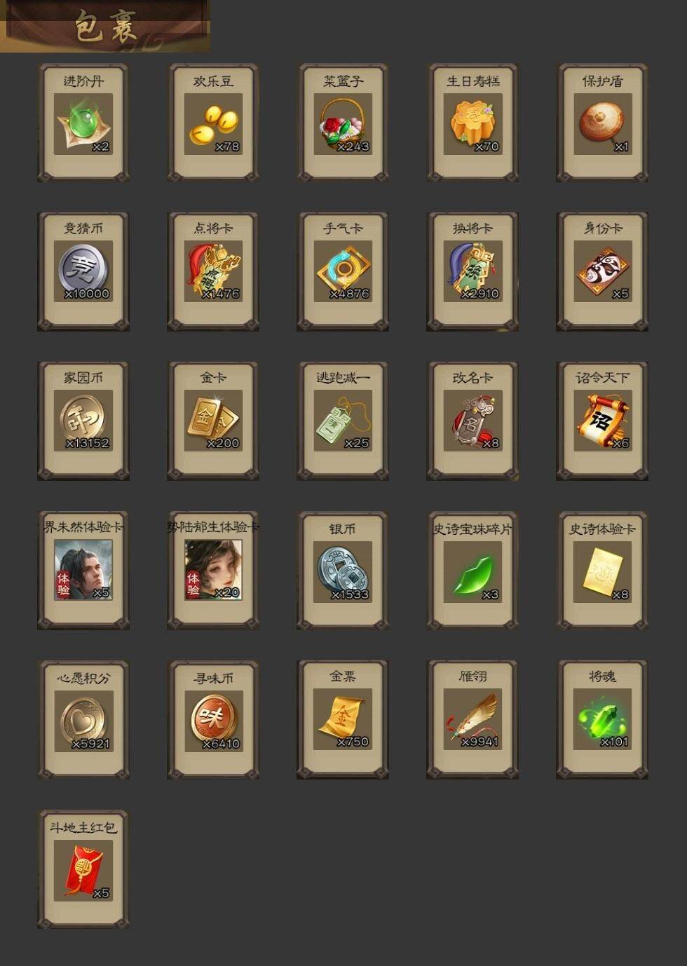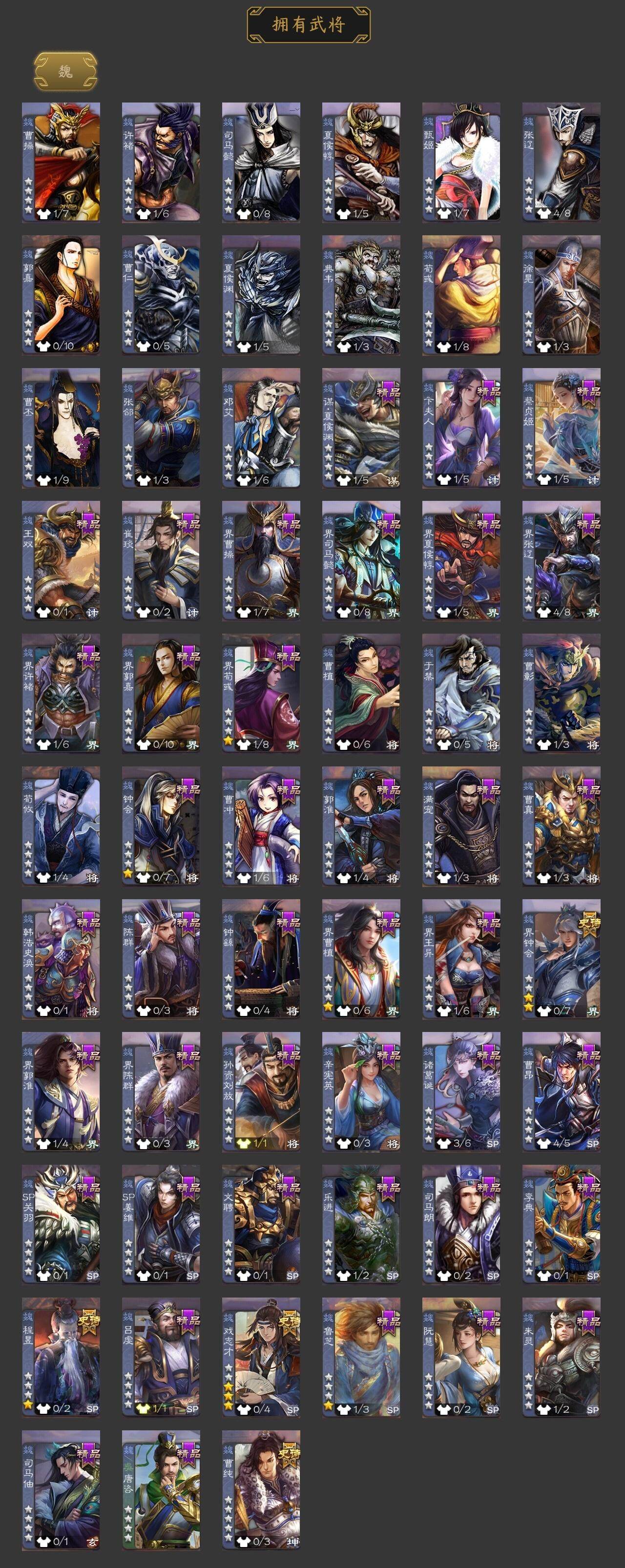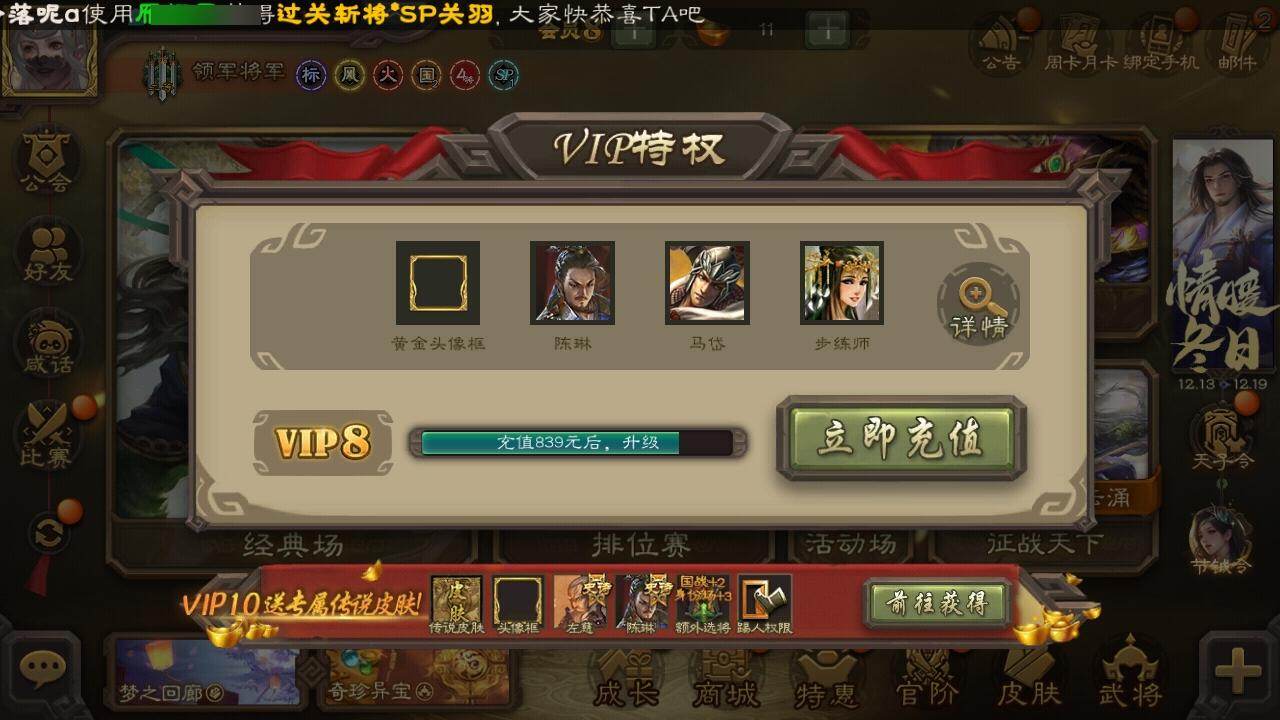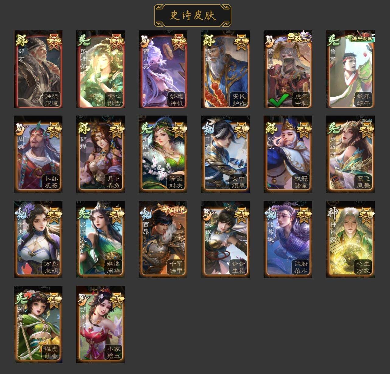 [15166234]【179】官阶:领军将军;vip等级:vip8;史诗武将数量:12;动态皮肤数量:5;武将总数:223;史诗宝珠数量:0;将魂数量:101;神将:2;魏国史诗武将:0;蜀国史诗武将:2;吴国史诗武将:2;群史诗武将:4 神张辽神吕蒙界钟会曹纯戏志才周群谯周吴景势陆郁生谋黄月英郑玄张让沮授神吕蒙-心生万象周群-卜卦观签动态黄月英-虎年中秋动态鲁肃-蛇年端午动态陶谦-安民护祚动态
