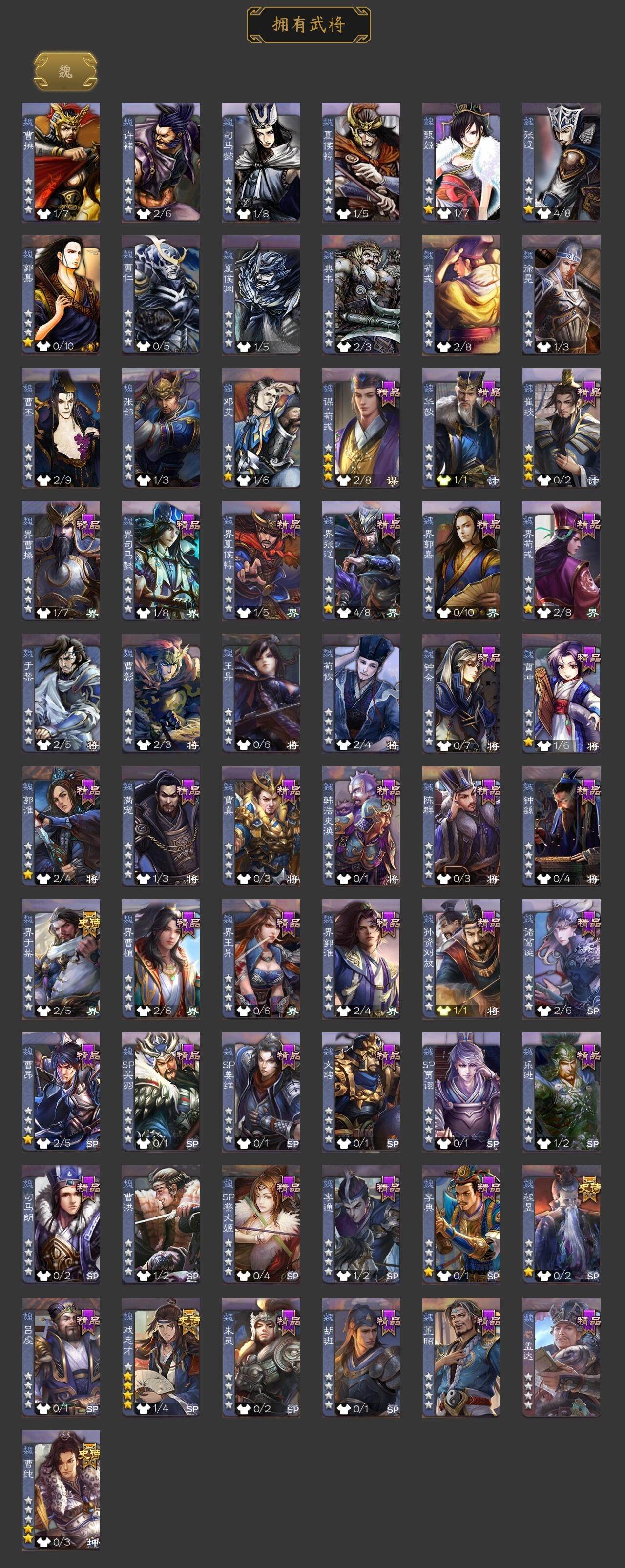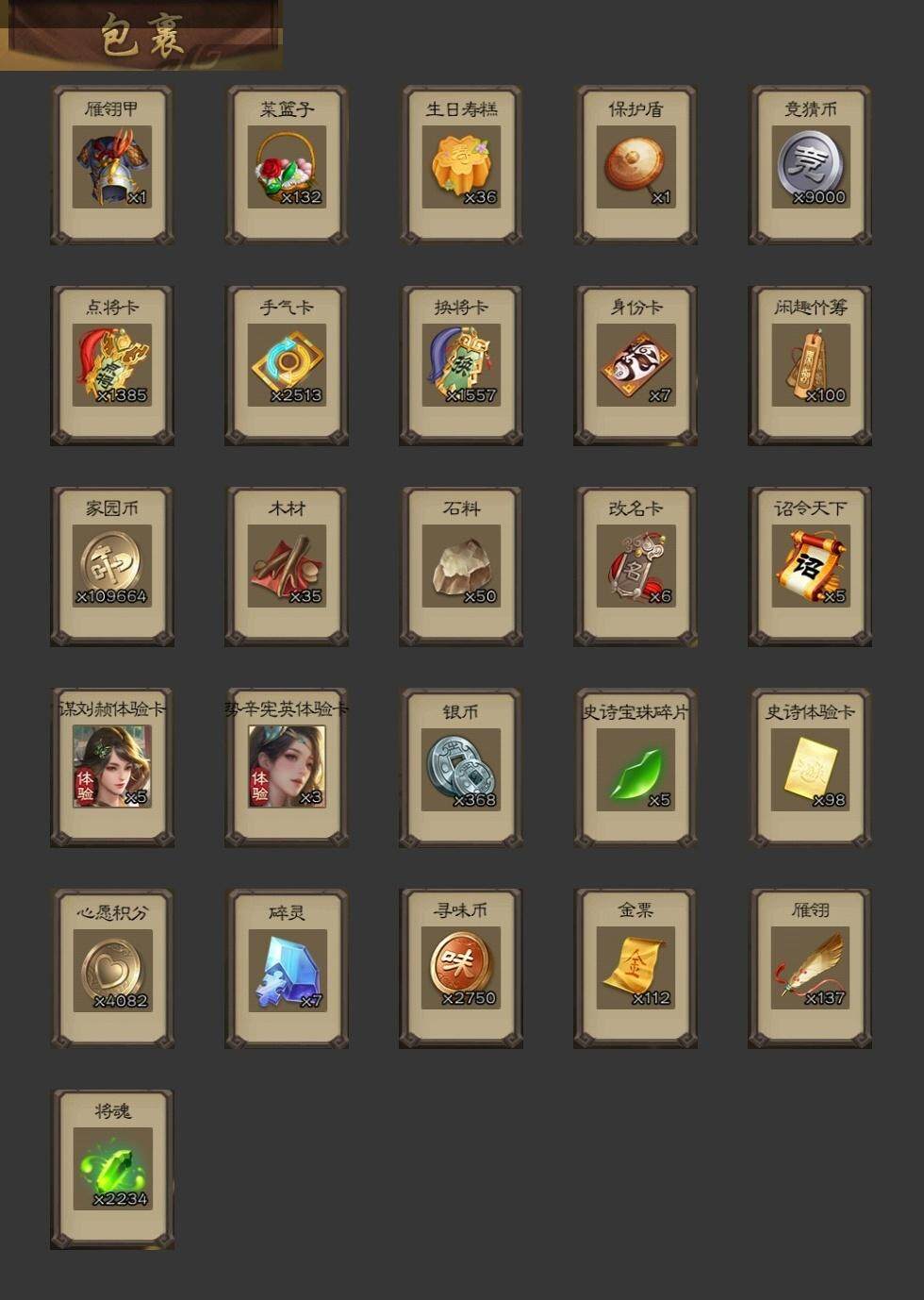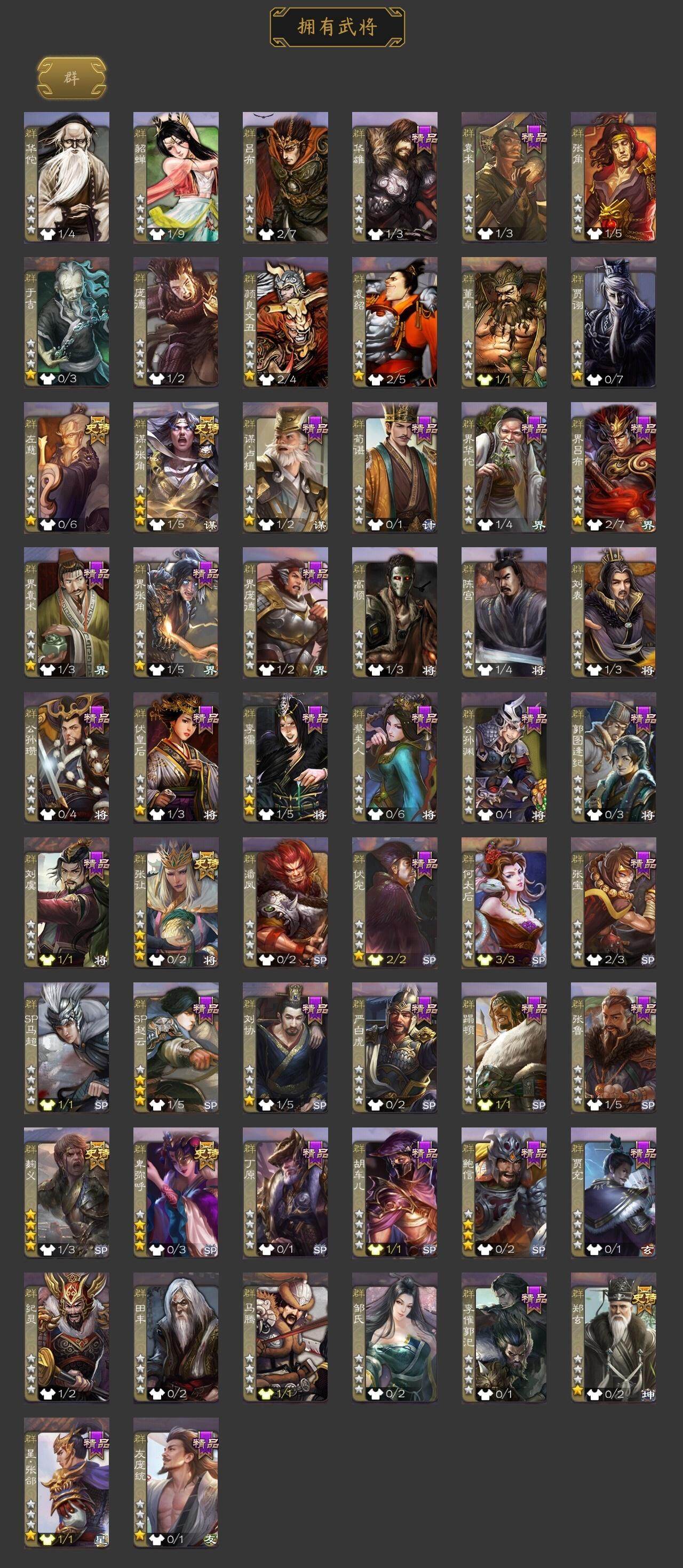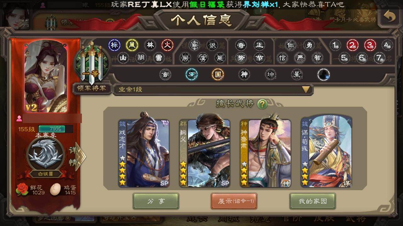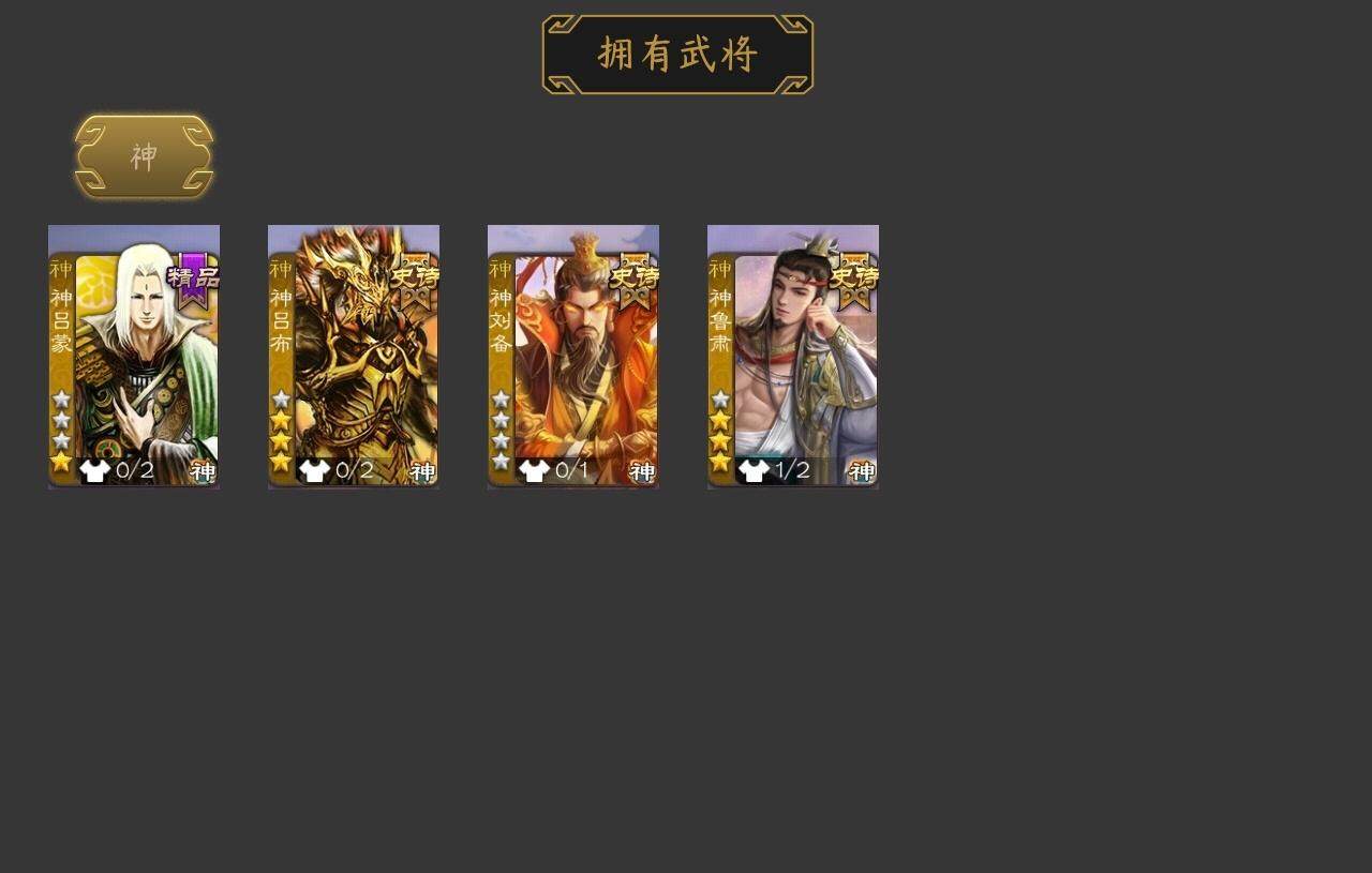 [15166258]【831】官阶:领军将军;vip等级:vip2;史诗武将数量:17;动态皮肤数量:9;武将总数:219;史诗宝珠数量:0;将魂数量:2234;神将:4;魏国史诗武将:4;蜀国史诗武将:3;吴国史诗武将:1;群史诗武将:8 神吕布神刘备神吕蒙神鲁肃界于禁曹纯戏志才谋赵云沙摩柯界黄忠孙皓谋荀彧左慈郑玄张让麹义卑弥呼鲍信谋张角神鲁肃-九州为局曹植-龙年中秋动态曹丕-龙年中秋动态关羽-明良千古动态周处-义除三害动态孙权-牛年七夕动态界孙权-牛年七夕动态孙鲁班-牛年端午动态何太后-蛇蝎为心动态张琪瑛-虎年冬至动态