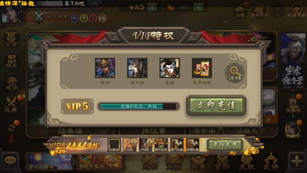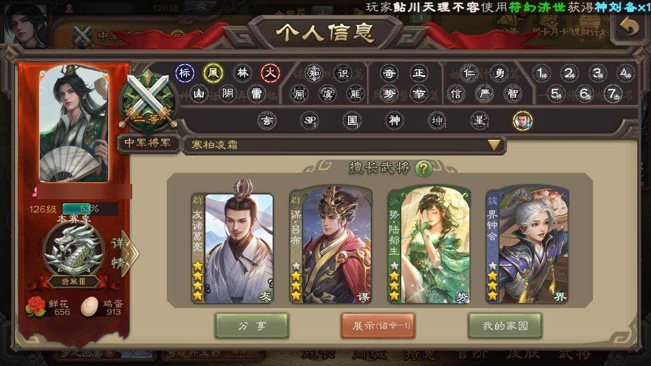 [15167015]【996】官阶:中军将军;vip等级:vip5;史诗武将数量:10;动态皮肤数量:5;武将总数:179;史诗宝珠数量:0;将魂数量:6390;神将:1;魏国史诗武将:2;蜀国史诗武将:2;吴国史诗武将:2;群史诗武将:3 神刘备界钟会谯周花鬘吴景势陆郁生张让谋吕布友诸葛亮钟会-龙年端午(动态)诸葛果-蛇年限定动态陆逊-蛇年清明动态吕布-鼠年七夕动态