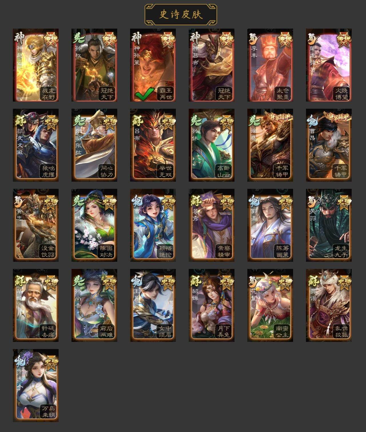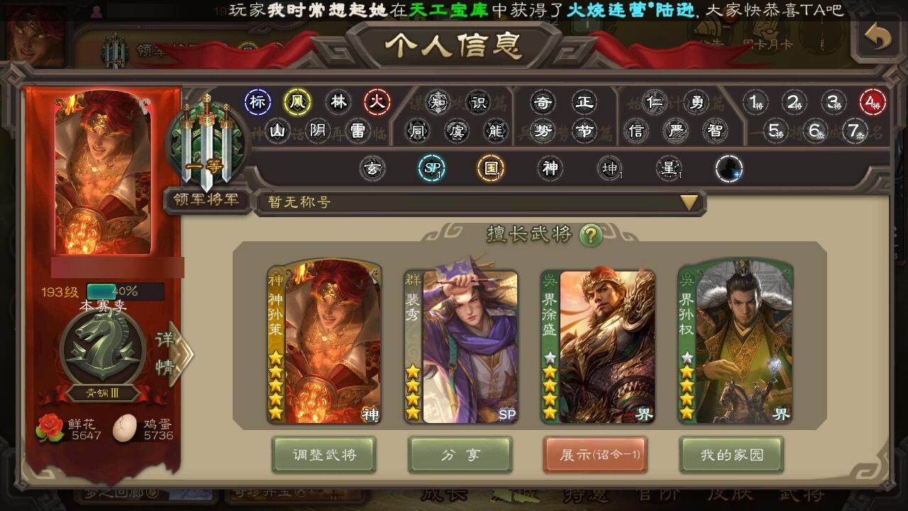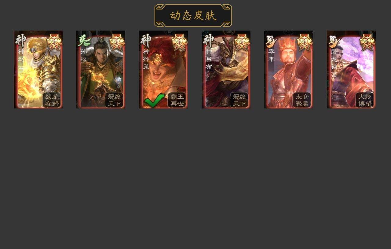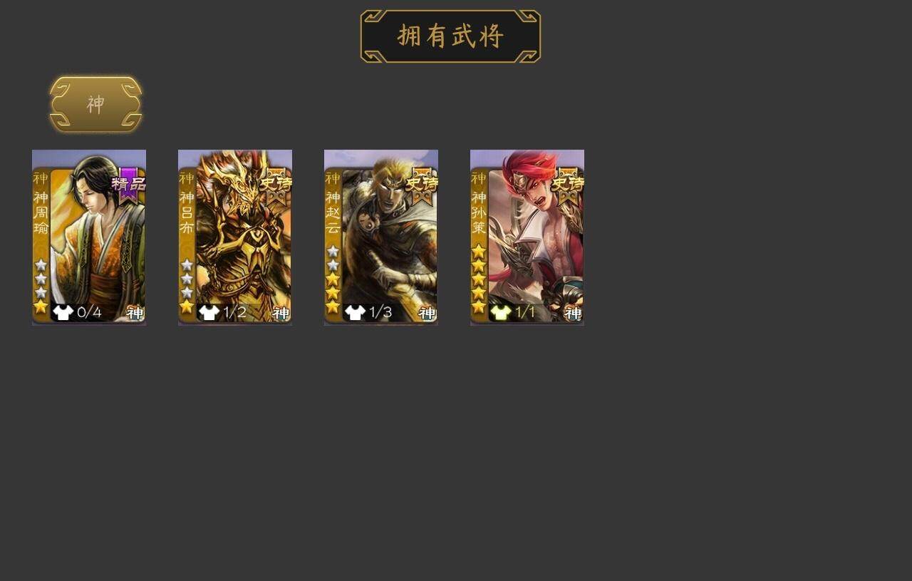 [15167079]【119】官阶:领军将军;vip等级:vip6;史诗武将数量:15;动态皮肤数量:5;武将总数:223;史诗宝珠数量:0;将魂数量:995;神将:4;魏国史诗武将:0;蜀国史诗武将:3;吴国史诗武将:1;群史诗武将:5 神吕布神赵云神孙策神周瑜王凌曹纯谋赵云谋马超花鬘界徐盛裴秀左慈苏飞沮授星董卓神孙策-霸王再世动态神吕布-冠绝天下动态神赵云-战龙在野动态李丰-太仓聚粟动态卧龙诸葛-火烧博望动态孙权-冠绝天下动态