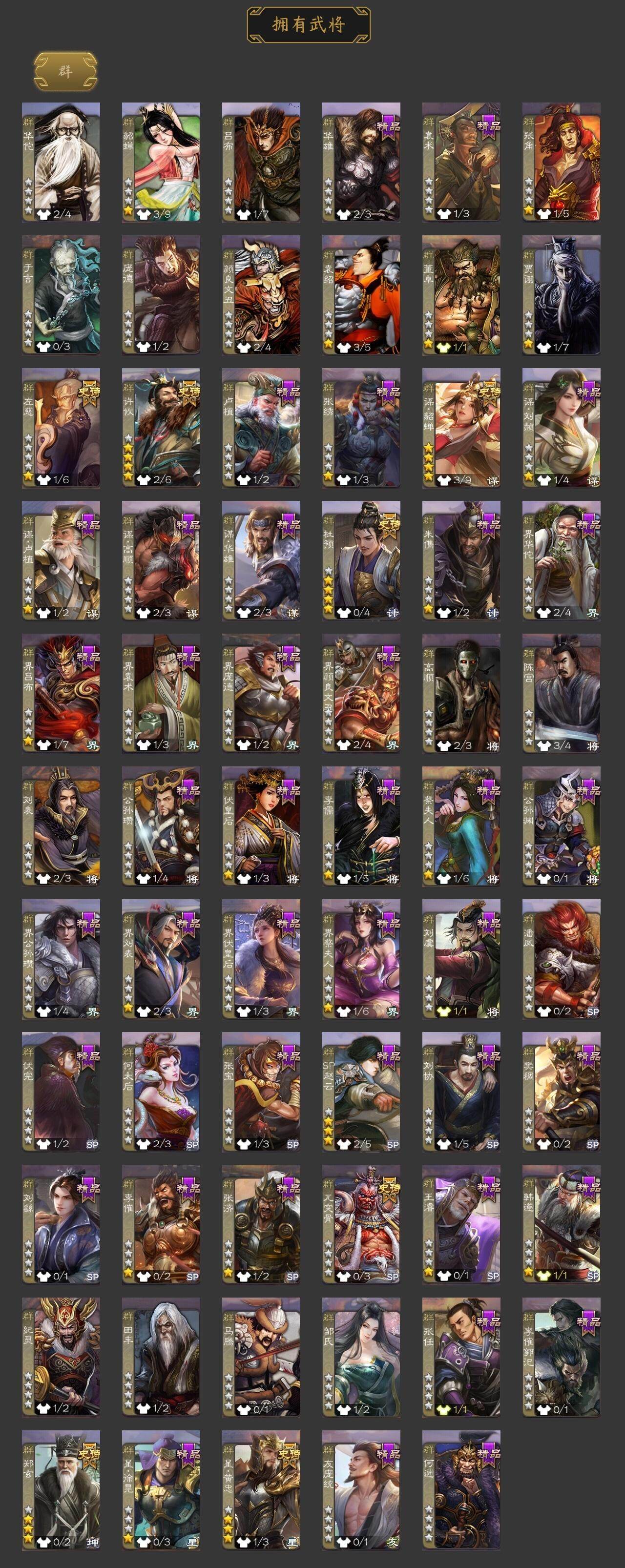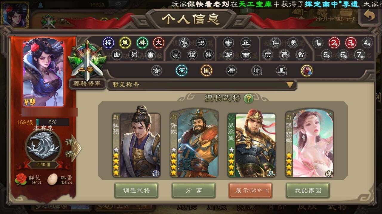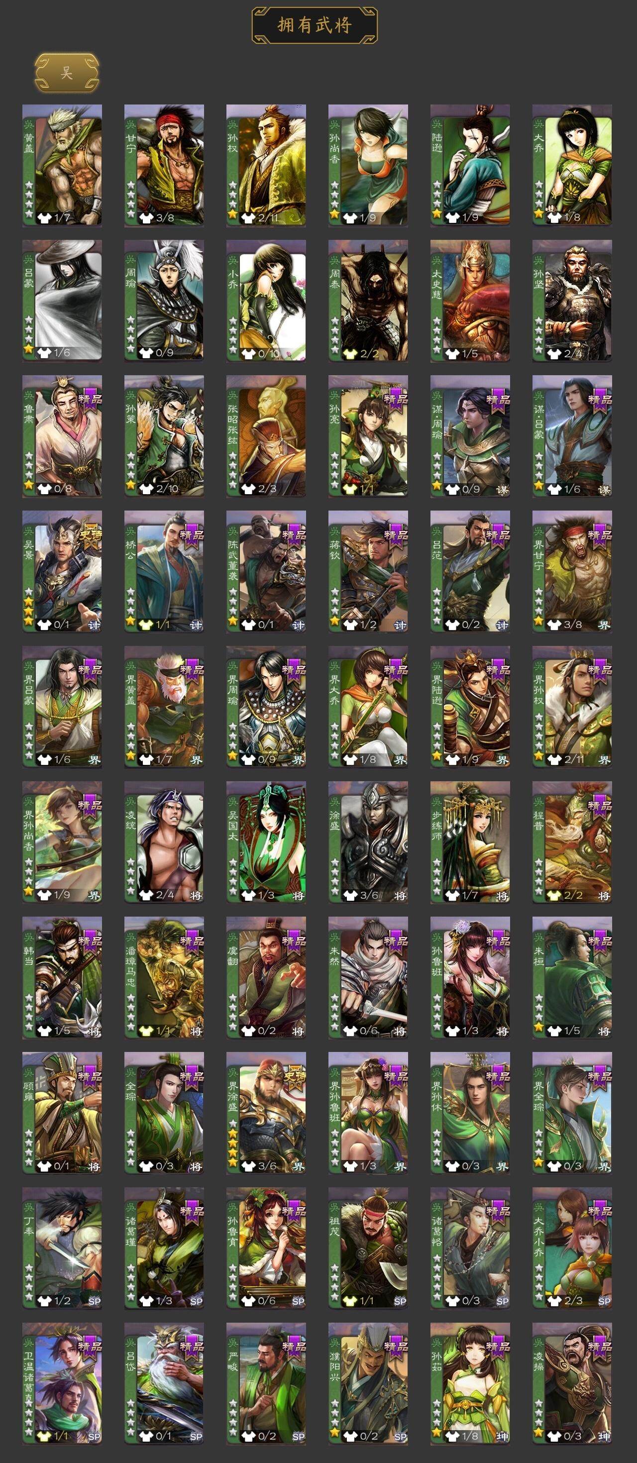 [15167171]【585】官阶:骠骑将军;vip等级:vip9;史诗武将数量:24;动态皮肤数量:17;武将总数:265;史诗宝珠数量:0;将魂数量:6123;神将:3;魏国史诗武将:8;蜀国史诗武将:9;吴国史诗武将:2;群史诗武将:8 神赵云神周瑜神诸葛亮星周不疑界于禁曹纯戏志才马云騄谋马超诸葛瞻张星彩沙摩柯傅佥界黄忠花鬘董允吴景界徐盛谋貂蝉左慈郑玄星黄忠杜预张绣李傕许攸神诸葛亮-风舞魔鸟动态曹丕-气荡山河(动态)曹丕-龙年中秋动态sp蔡文姬-兔年冬日动态张春华-雪中舞刃动态马超-虎年冬至动态关银屏-兔年春节动态李丰-太仓聚粟动态诸葛果-蛇年限定动态太史慈-涤荡江东动态孙权-永开吴祚动态袁绍-声震寰宇动态貂蝉-鼠年七夕动态貂蝉-绝世倾城动态许攸-盛气凌人动态