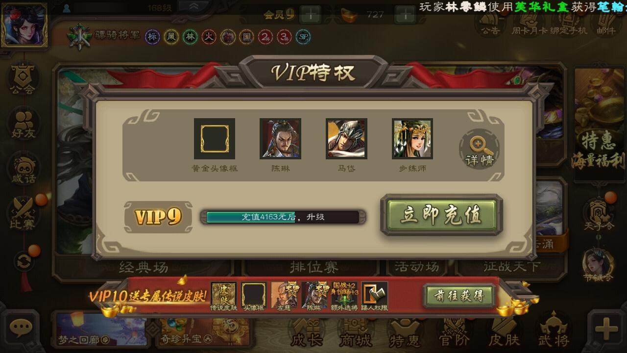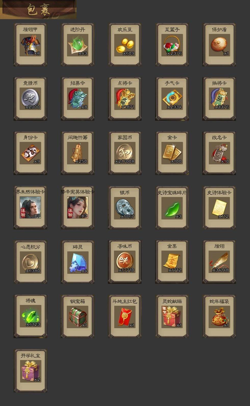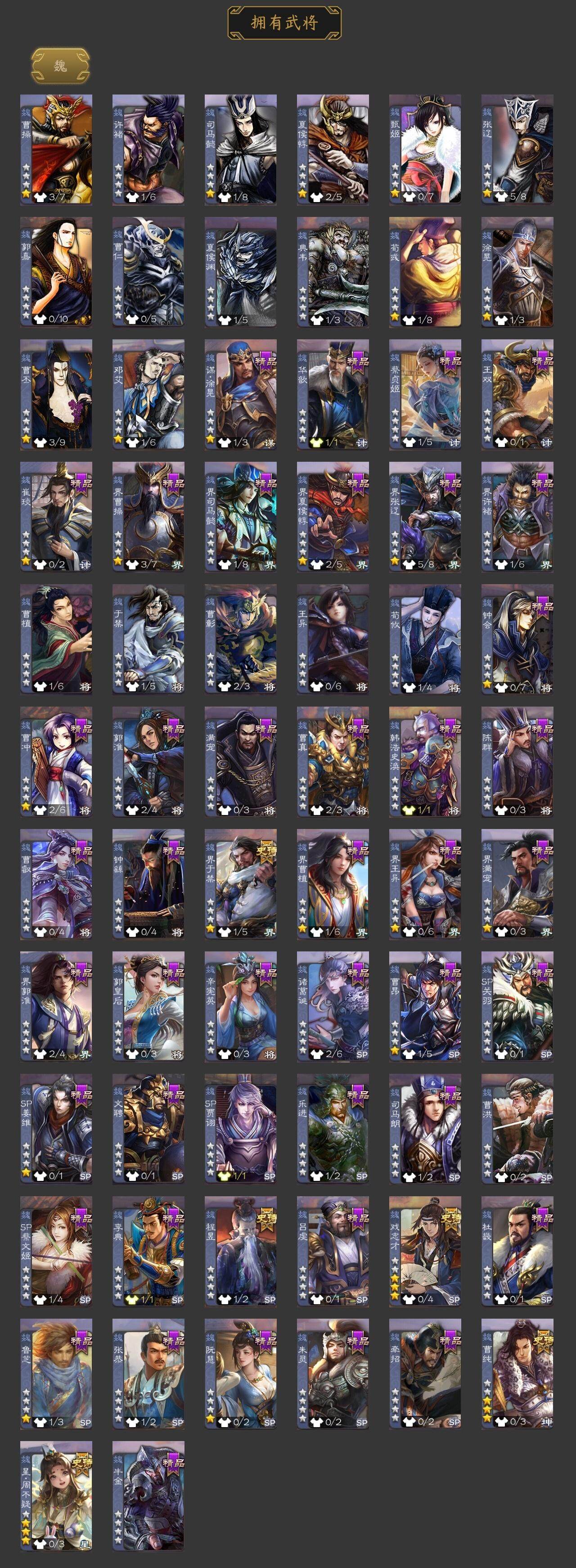 [15167171]【585】官阶:骠骑将军;vip等级:vip9;史诗武将数量:24;动态皮肤数量:17;武将总数:265;史诗宝珠数量:0;将魂数量:6123;神将:3;魏国史诗武将:8;蜀国史诗武将:9;吴国史诗武将:2;群史诗武将:8 神赵云神周瑜神诸葛亮星周不疑界于禁曹纯戏志才马云騄谋马超诸葛瞻张星彩沙摩柯傅佥界黄忠花鬘董允吴景界徐盛谋貂蝉左慈郑玄星黄忠杜预张绣李傕许攸神诸葛亮-风舞魔鸟动态曹丕-气荡山河(动态)曹丕-龙年中秋动态sp蔡文姬-兔年冬日动态张春华-雪中舞刃动态马超-虎年冬至动态关银屏-兔年春节动态李丰-太仓聚粟动态诸葛果-蛇年限定动态太史慈-涤荡江东动态孙权-永开吴祚动态袁绍-声震寰宇动态貂蝉-鼠年七夕动态貂蝉-绝世倾城动态许攸-盛气凌人动态