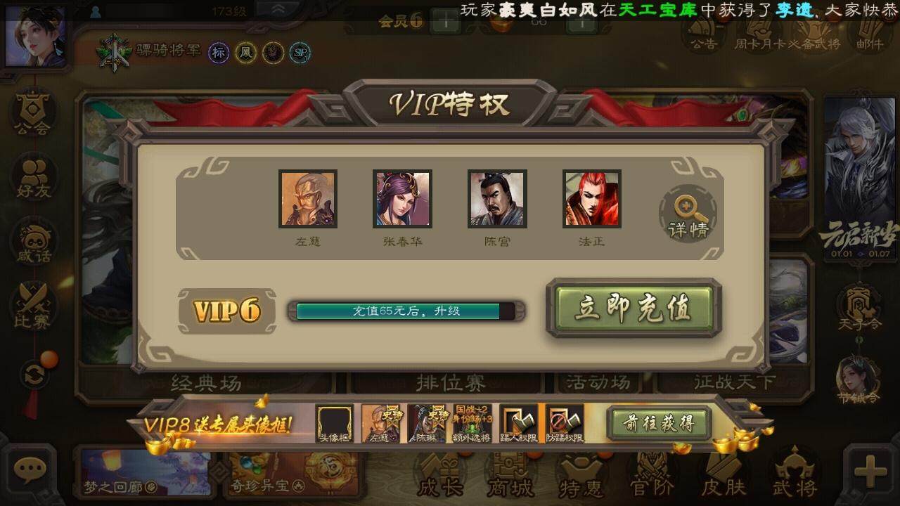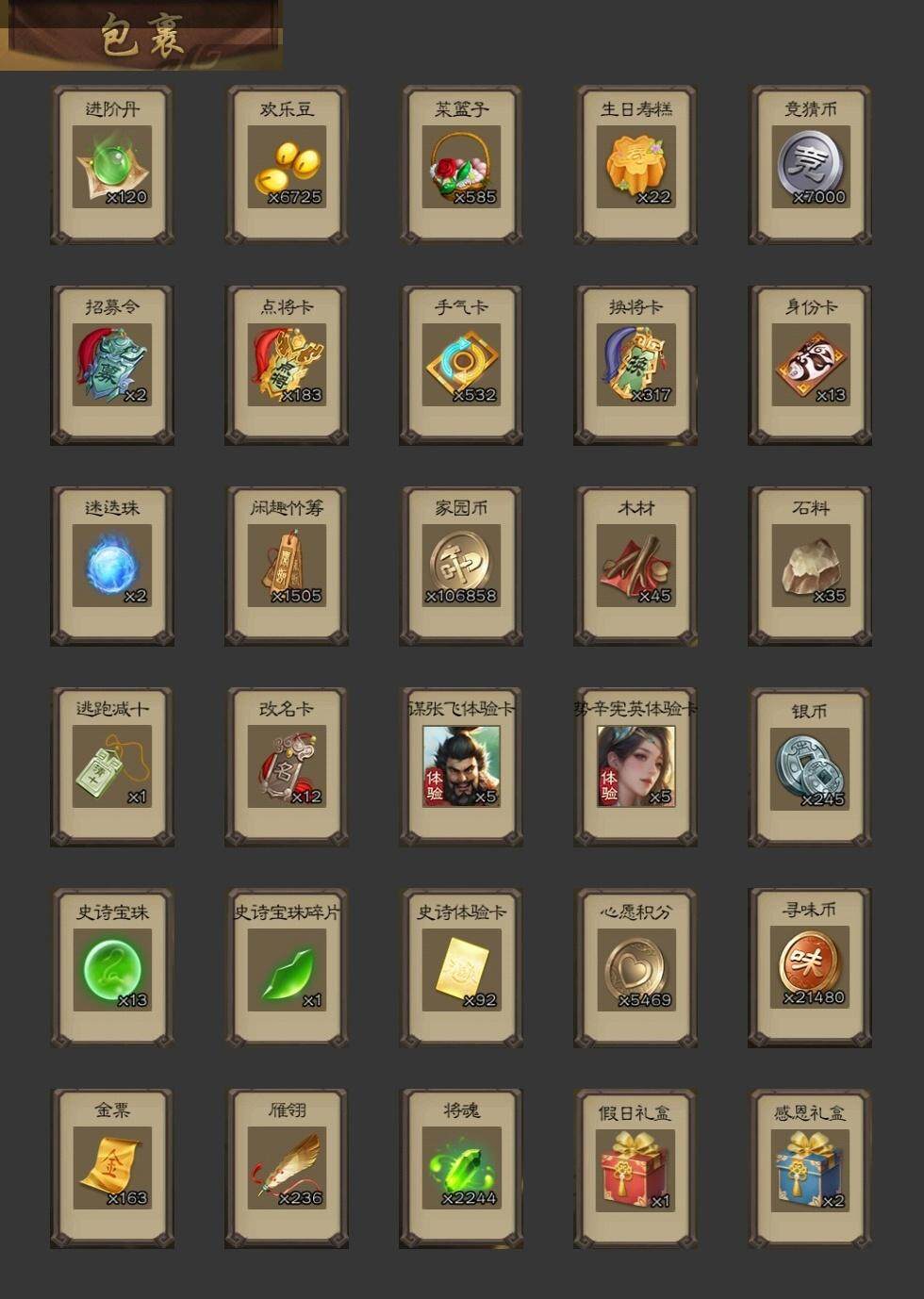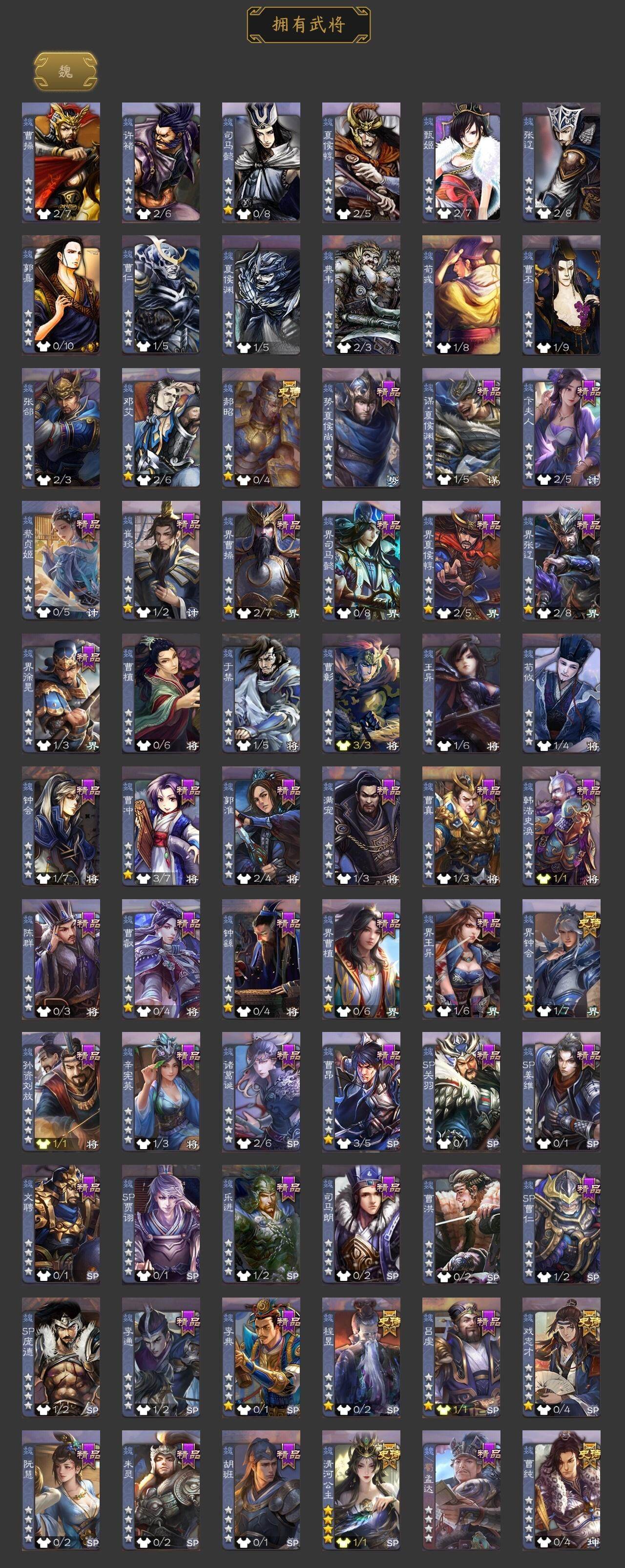 [15167533]【1029】官阶:骠骑将军;vip等级:vip6;史诗武将数量:17;动态皮肤数量:11;武将总数:233;史诗宝珠数量:13;将魂数量:2244;神将:3;魏国史诗武将:5;蜀国史诗武将:3;吴国史诗武将:3;群史诗武将:3 神吕布神赵云神诸葛亮界钟会郝昭曹纯戏志才清河公主程昱谋赵云诸葛瞻谋关羽留赞界徐盛势陆郁生左慈星董卓兀突骨神周瑜势夏侯尚sp关羽sp曹仁乐进曹昂诸葛诞朱灵文聘sp姜维钟会曹冲郭淮满宠界王异界曹操界司马懿界夏侯惇界张辽李典曹真韩浩史涣陈群曹叡钟繇司马朗李通孙资刘放辛宪英吕虔界徐晃界曹植卞夫人蔡贞姬崔琰阮慧胡班谋夏侯渊势陈到sp孙尚香关银屏夏侯霸马良关兴张苞廖化界马岱关平简雍刘封界法正界关兴张苞界刘备界张飞界赵云界马超sp徐庶吴懿周仓张松刘谌夏侯氏糜竺李严黄皓界黄月英界诸葛亮赵统赵广严颜界伊籍界庞统陈到界姜维界刘禅傅肜费祎糜夫人王甫赵累宗预谋庞统界张嶷谋张飞吴班诸葛果凌操大乔小乔诸葛恪诸葛瑾孙鲁育程普韩当潘璋马忠虞翻界甘宁界黄盖界周瑜界大乔界陆逊孙鲁班顾雍孙休界孙坚吕岱周妃许贡界潘璋马忠孙邵桥公濮阳兴谋周瑜界孙休谋小乔张布孟达伏完界袁术张宝伏皇后李儒界于吉华雄袁术界华佗界吕布公孙瓒蔡夫人公孙渊严白虎sp黄月英界貂蝉卢植张济樊稠星张郃界公孙瓒丁原谋杨婉王濬李傕郭汜势田丰仲帝袁术钟会-谋谟之勋动态曹冲-龙年清明动态清河公主-魅影萦心动态关羽-以身证道动态卧龙诸葛-火烧博望动态诸葛果-蛇年限定动态徐盛-破军杀将动态势陆郁生-素心傲雪动态周处-义除三害动态留赞-灵魂歌王动态司马昭-昭威淮南动态