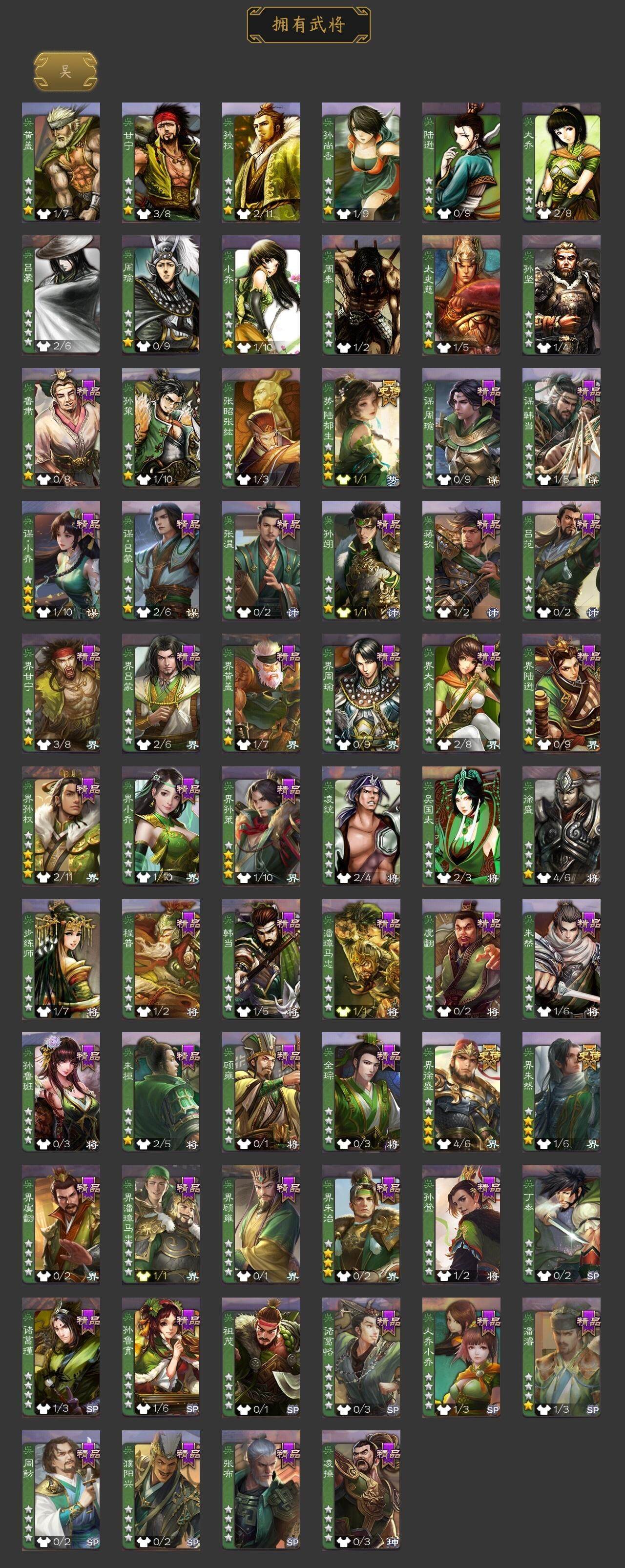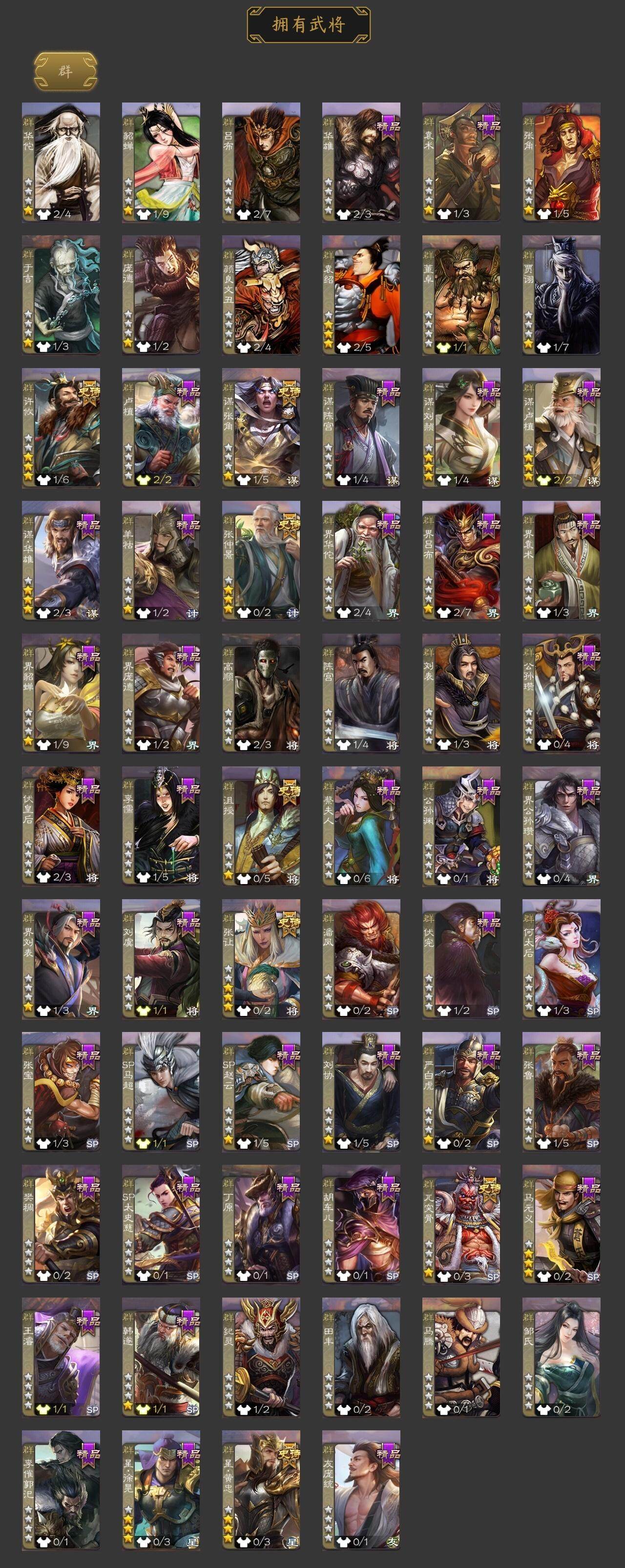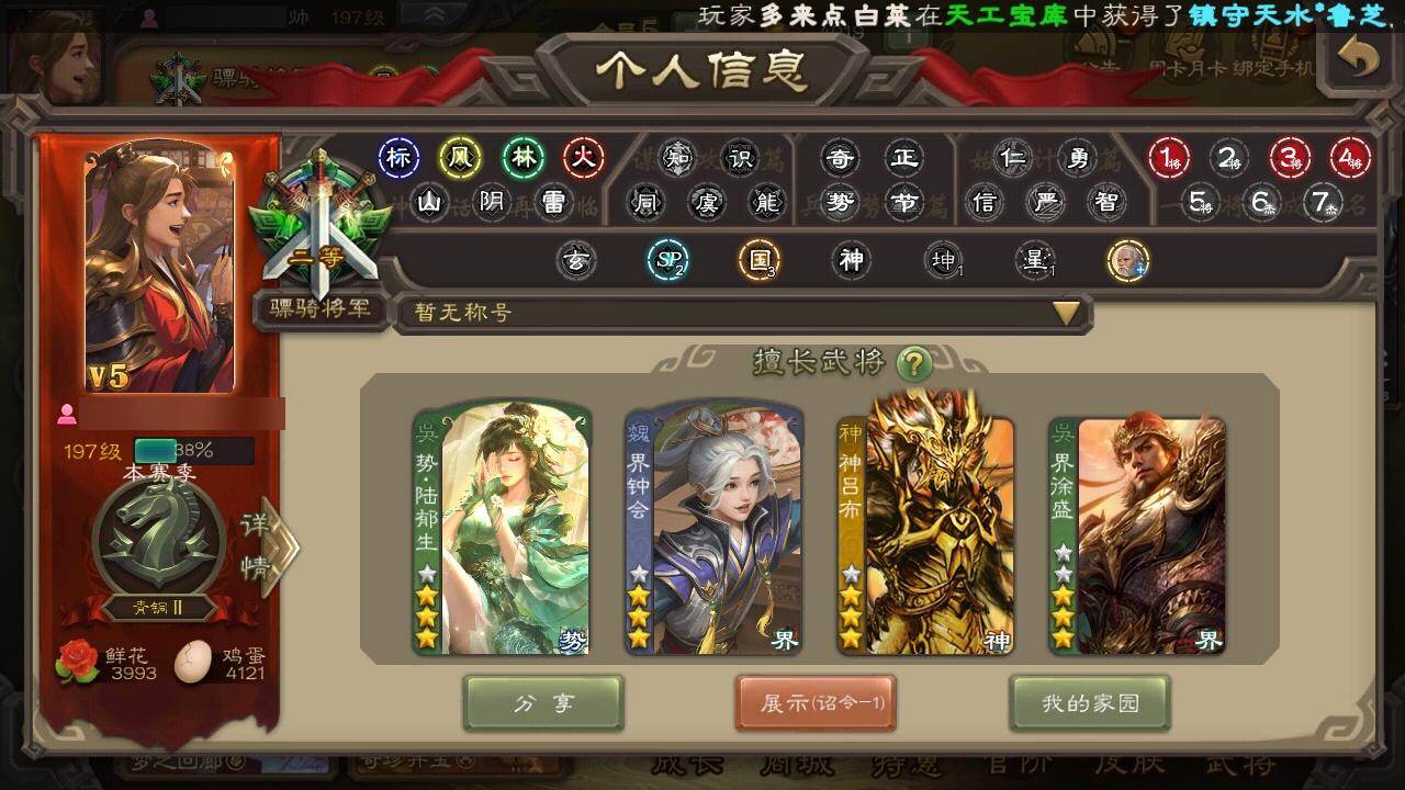 [15167573]【679】官阶:骠骑将军;vip等级:vip5;史诗武将数量:23;动态皮肤数量:11;武将总数:275;史诗宝珠数量:6;将魂数量:883;神将:4;魏国史诗武将:6;蜀国史诗武将:7;吴国史诗武将:3;群史诗武将:7 神吕布神赵云神吕蒙神周瑜谋曹操界钟会曹纯关索马云騄谋赵云谋马超沙摩柯谯周界黄忠界朱然界徐盛势陆郁生谋郭嘉张仲景张让星黄忠沮授谋张角许攸神赵云-神龙天降钟会-龙年端午(动态)sp蔡文姬-兔年冬日动态曹纯-虎年春节动态费祎-安民护祚(动态)马超-虎年冬至动态关索-虎年七夕动态周处-义除三害动态孙权-猪年端午动态界孙权-猪年端午动态孙寒华-蛇年限定动态左慈-蛇年限定动态