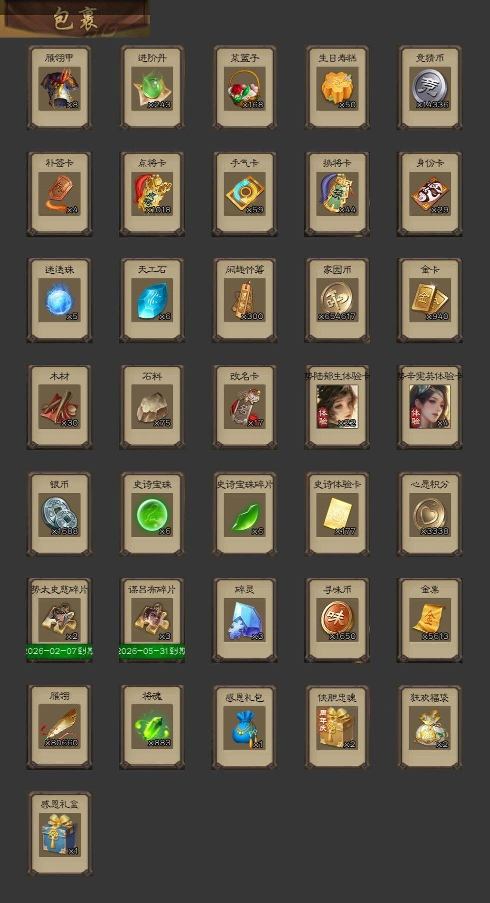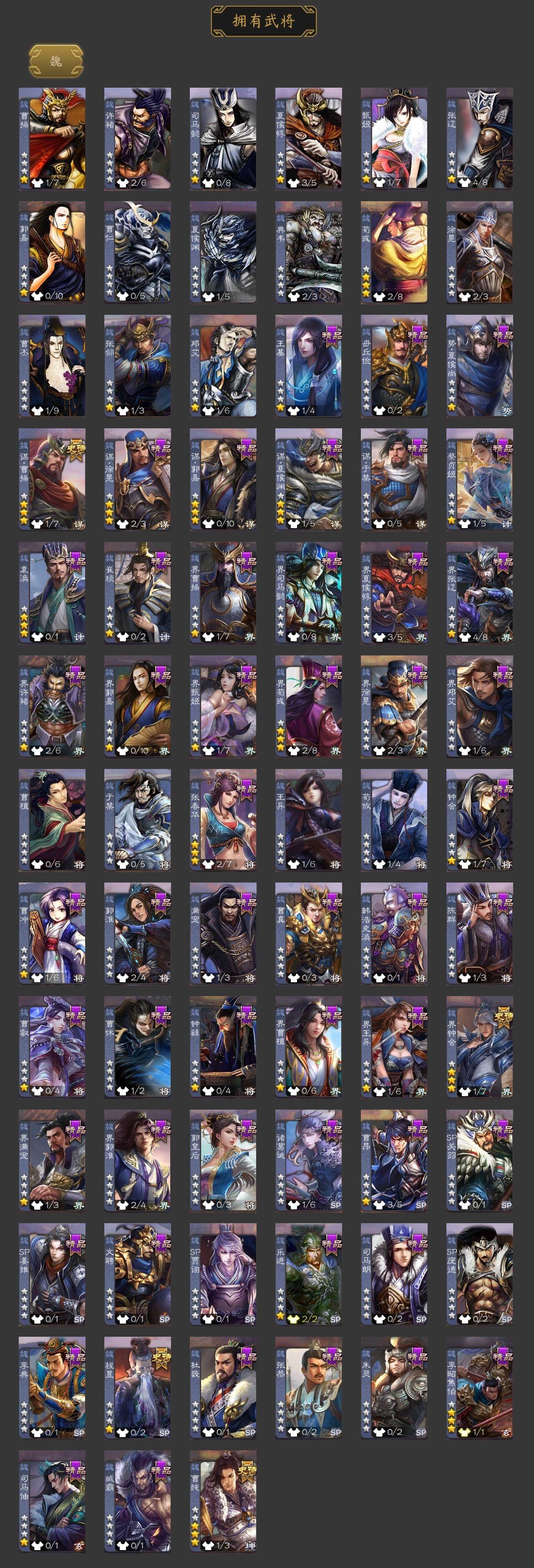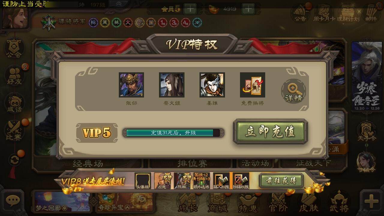 [15167573]【679】官阶:骠骑将军;vip等级:vip5;史诗武将数量:23;动态皮肤数量:11;武将总数:275;史诗宝珠数量:6;将魂数量:883;神将:4;魏国史诗武将:6;蜀国史诗武将:7;吴国史诗武将:3;群史诗武将:7 神吕布神赵云神吕蒙神周瑜谋曹操界钟会曹纯关索马云騄谋赵云谋马超沙摩柯谯周界黄忠界朱然界徐盛势陆郁生谋郭嘉张仲景张让星黄忠沮授谋张角许攸神赵云-神龙天降钟会-龙年端午(动态)sp蔡文姬-兔年冬日动态曹纯-虎年春节动态费祎-安民护祚(动态)马超-虎年冬至动态关索-虎年七夕动态周处-义除三害动态孙权-猪年端午动态界孙权-猪年端午动态孙寒华-蛇年限定动态左慈-蛇年限定动态