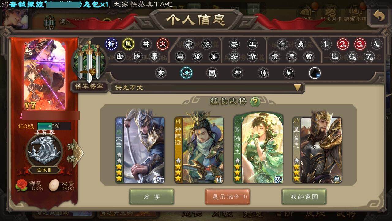[15167646]【345】官阶:领军将军;vip等级:vip7;史诗武将数量:15;动态皮肤数量:13;武将总数:213;史诗宝珠数量:0;将魂数量:0;神将:1;魏国史诗武将:2;蜀国史诗武将:2;吴国史诗武将:4;群史诗武将:4 神陆逊文鸯曹纯戏志才谋郭淮王平沙摩柯周处吴景界徐盛势陆郁生谋郭嘉左慈星黄忠星董卓郭嘉-以身证道(动态)黄忠-烈箭贯云动态)马超-西凉雄狮动态界马超-西凉雄狮动态卧龙诸葛-火烧博望动态鲁肃-蛇年端午动态陆逊-蛇年清明动态吕布-虓虎之勇动态界吕布-虓虎之勇动态sp赵云-威名尽显动态左慈-蛇年限定动态