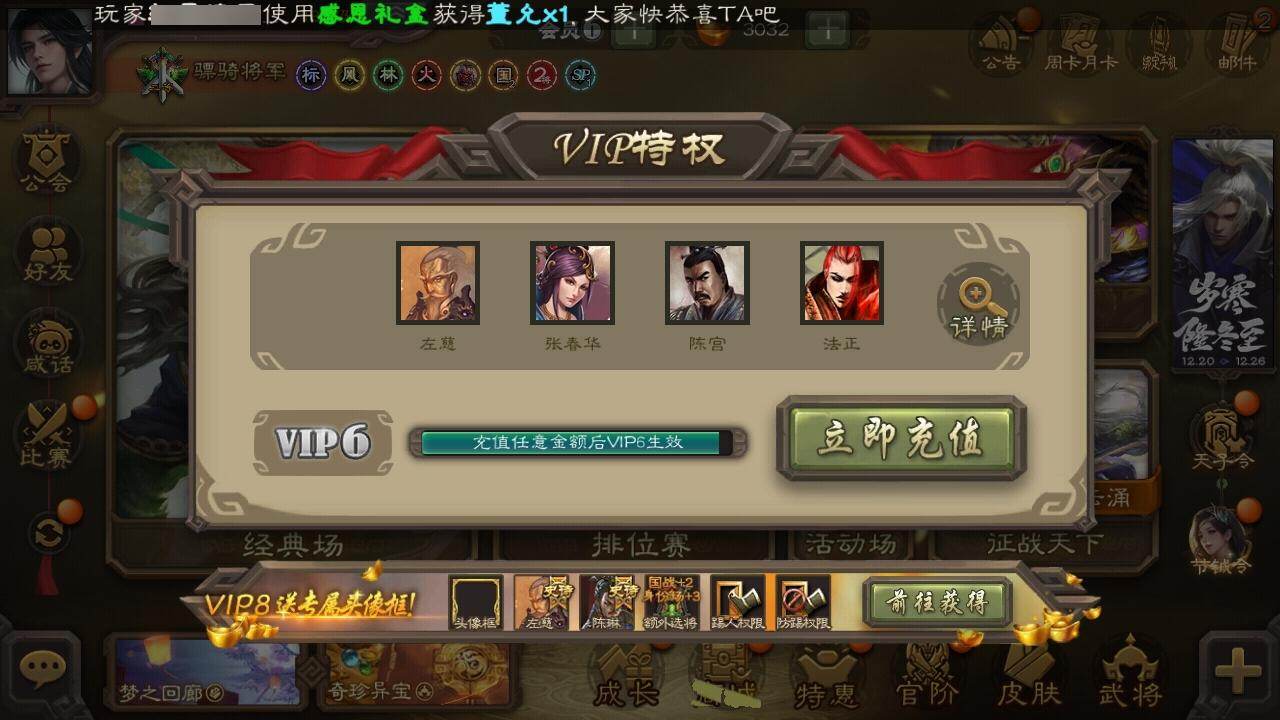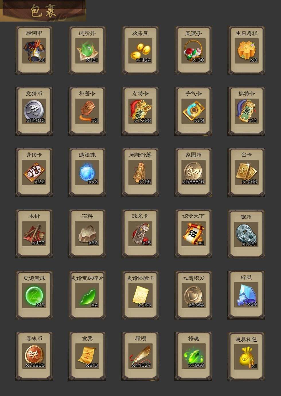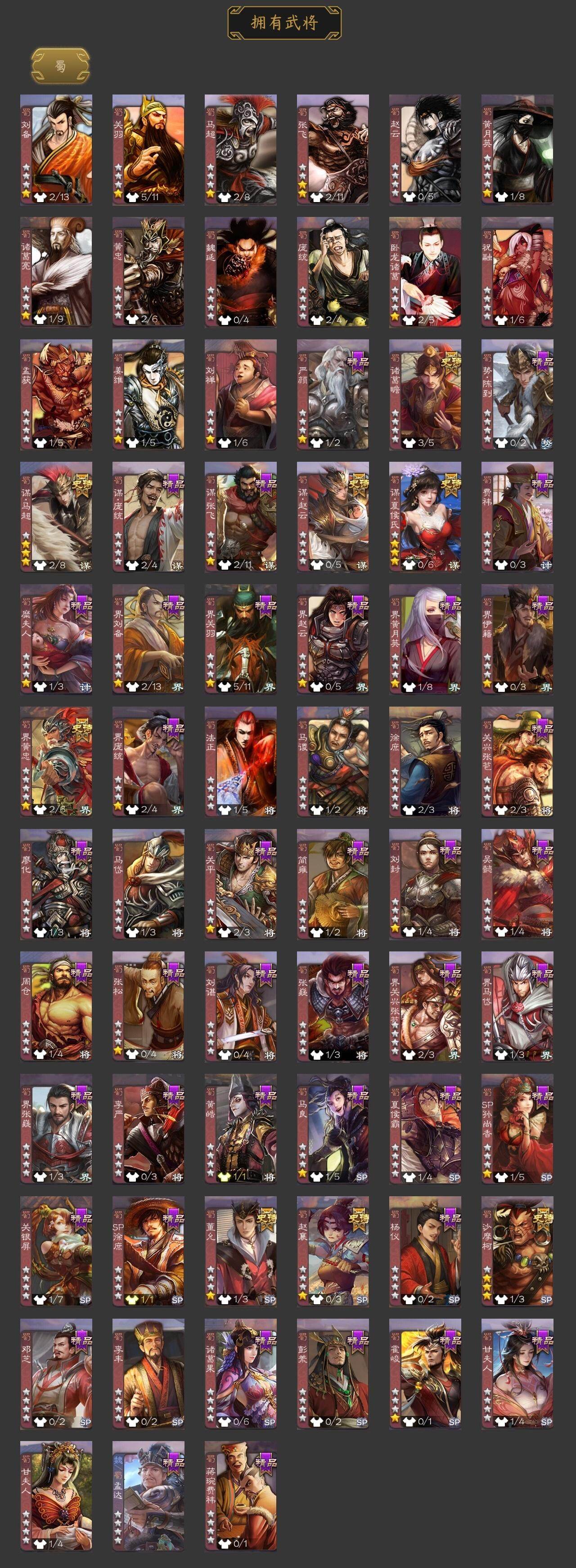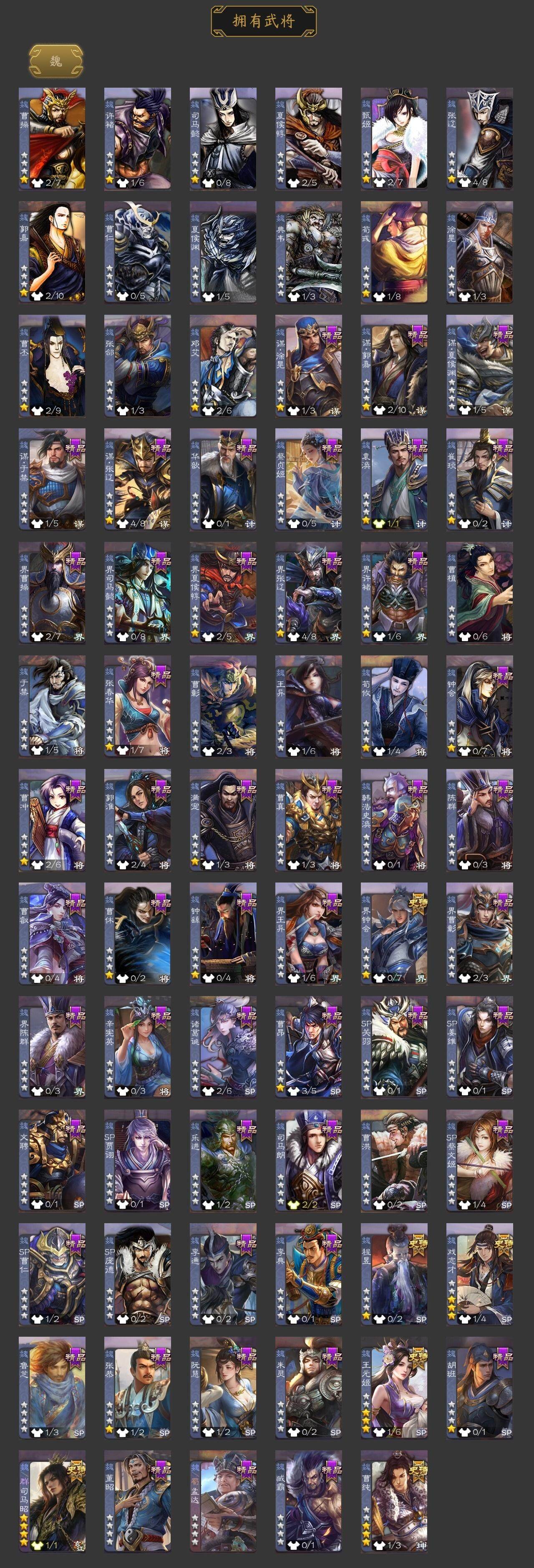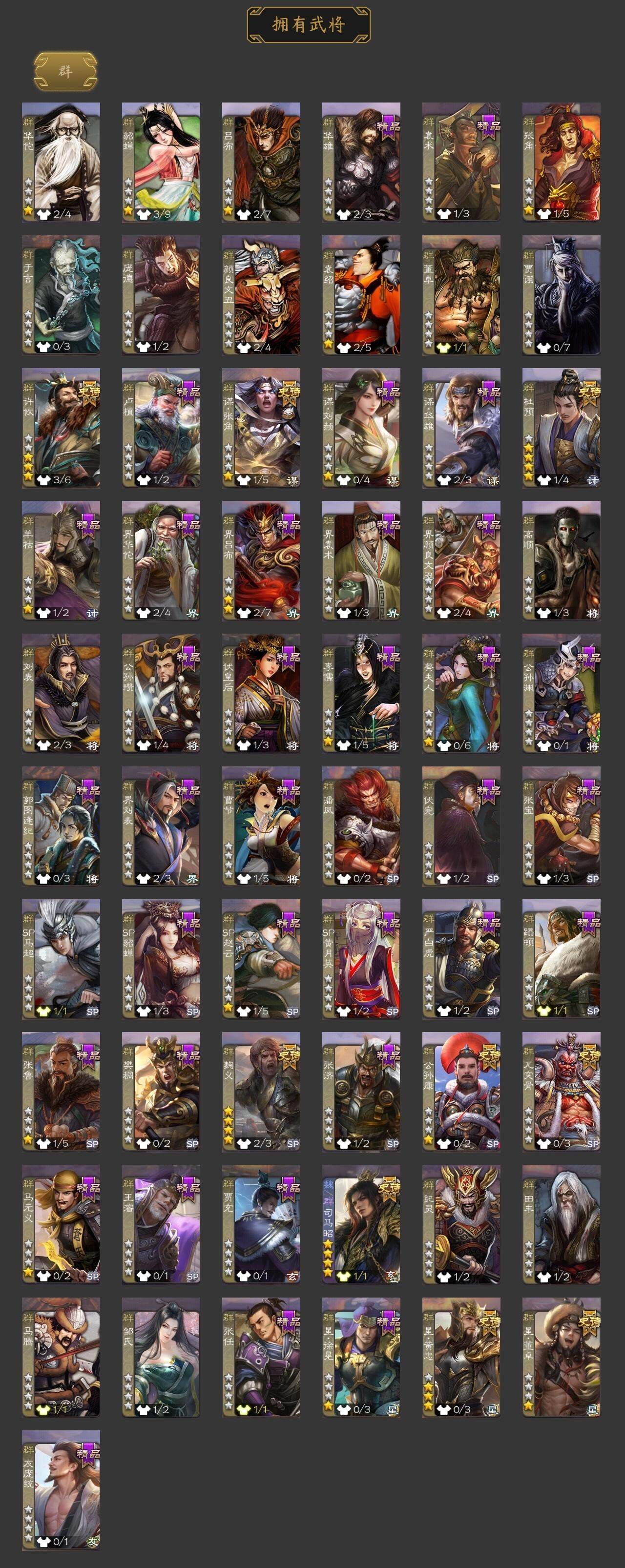 [15168526]【74】官阶:骠骑将军;vip等级:vip6;史诗武将数量:27;动态皮肤数量:16;武将总数:263;史诗宝珠数量:17;将魂数量:7060;神将:5;魏国史诗武将:12;蜀国史诗武将:8;吴国史诗武将:2;群史诗武将:8 神吕布神司马懿神华佗神吕蒙神周瑜王元姬魏-司马昭界钟会曹纯戏志才谋夏侯氏谋赵云谋马超诸葛瞻赵襄沙摩柯界黄忠董允界朱然界徐盛谋郭嘉星黄忠麹义公孙康杜预谋张角许攸星董卓曹丕-气荡山河(动态)甄姬-明珠耀躯(动态)sp蔡文姬-兔年冬日动态戏志才-举棋若定动态曹纯-长坂败备动态司马昭-昭威淮南(动态)诸葛瞻-绵竹之殇动态卧龙诸葛-火烧博望动态周处-义除三害动态孙权-永开吴祚动态周瑜-免年清明动态孙寒华-蛇年限定动态陆逊-蛇年清明动态许攸-火烧乌巢动态麹义-扬刀立威动态左慈-蛇年限定动态
