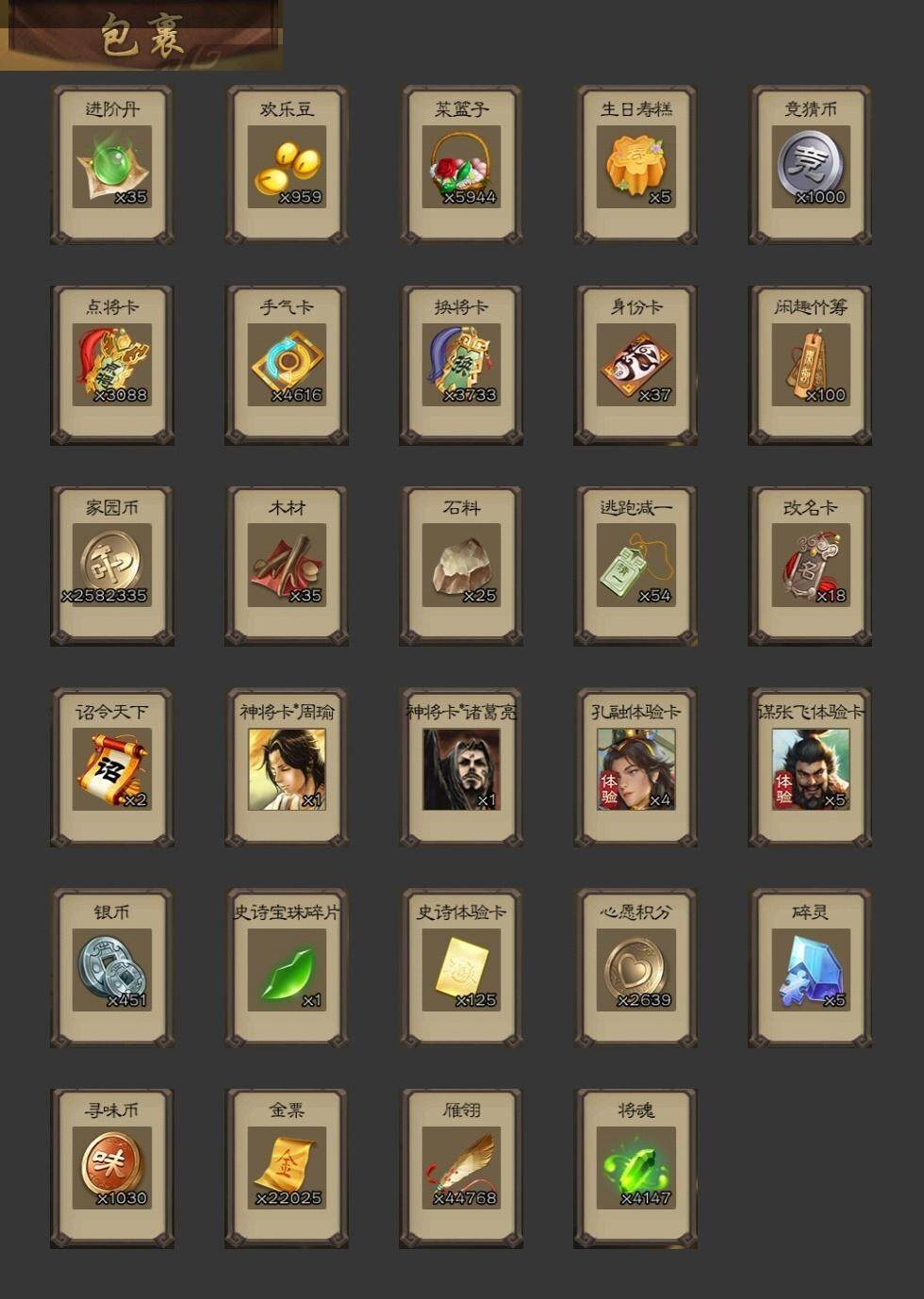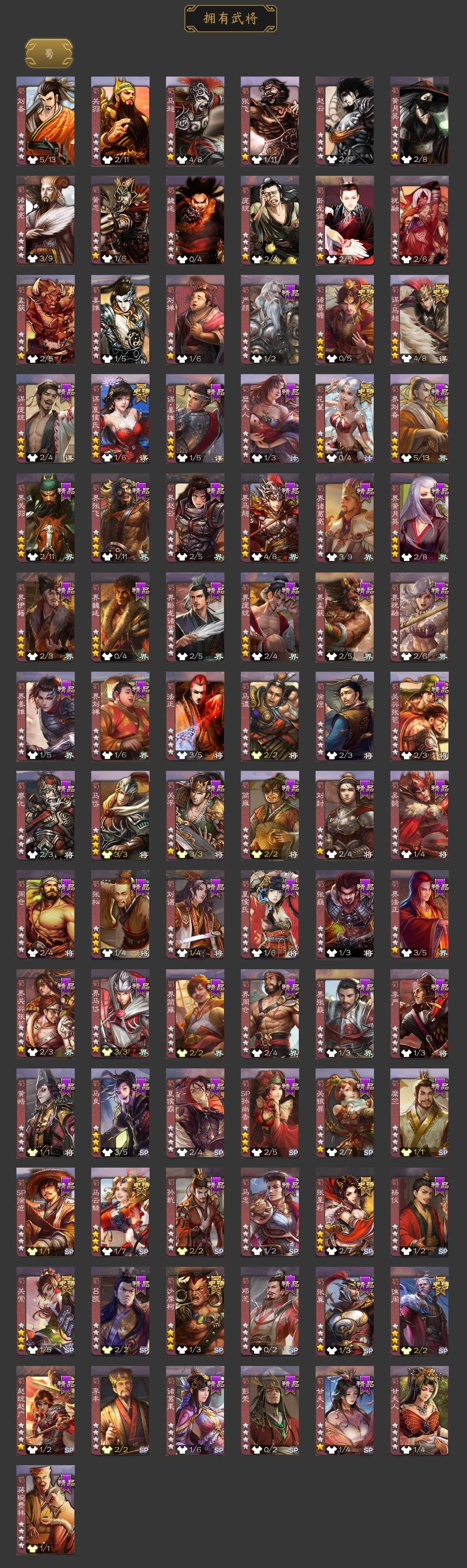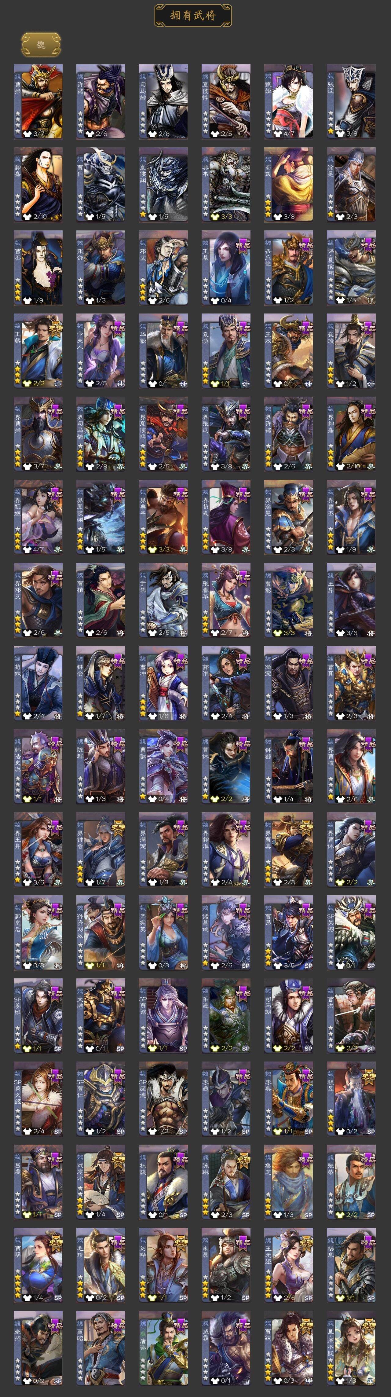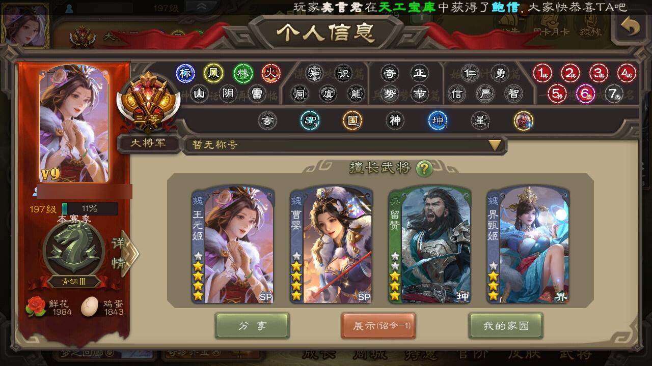 [15168741]【427】官阶:大将军;vip等级:vip9;史诗武将数量:39;动态皮肤数量:31;武将总数:353;史诗宝珠数量:0;将魂数量:4147;神将:5;魏国史诗武将:23;蜀国史诗武将:9;吴国史诗武将:6;群史诗武将:9 神吕布神赵云神张辽神吕蒙神周瑜星周不疑王粲王元姬界钟会界曹真陈琳曹婴曹纯戏志才刘晔关索马云騄谋夏侯氏谋马超诸葛瞻张星彩沙摩柯谯周花鬘谋陆逊孙皓留赞界朱然界徐盛贺齐左慈张让麹义南华老仙祢衡沮授界左慈界李儒谋张角神曹操-天下归心星周不疑-才广志宏动态张昌蒲-龙年端午(动态)曹植-龙年中秋动态甄姬-明珠耀躯(动态)sp蔡文姬-兔年冬日动态荀彧-驱虎吞狼动态邓艾-神兵天降动态王粲-笔翰如流动态界邓艾-神兵天降动态张春华-雪中舞刃动态曹婴-兔年春节动态朱灵-以战破氐动态王元姬-鼠年冬至动态刘备-龙御天下动态卧龙诸葛-龙跃凤鸣动态费祎-安民护祚(动态)马超-西凉雄狮动态马超-虎年冬至动态赵云-牛年春节动态黄月英-鼠年春节动态界赵云-牛年春节动态界马超-西凉雄狮动态界黄月英-鼠年春节动态张星彩-猪年中秋动态李丰-太仓聚粟动态孙策-兔年中秋动态周处-义除三害动态吕蒙-剑起惊澜动态孙权-兔年中秋动态孙权-永开吴祚动态孙策-虎踞江东动态孙尚香-星流霆击动态界孙尚香-星流霆击动态凌统-长风破浪动态界凌统-长风破浪动态刘赞-灵魂歌王动态袁绍-声震寰宇动态吕布-鼠年七夕动态界吕布-鼠年七夕动态李儒-鸠杀少帝动态界李儒-鸠杀少帝动态刘焉-雄踞益州动态张琪瑛-虎年冬至动态