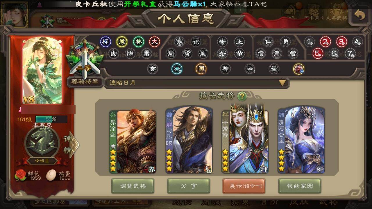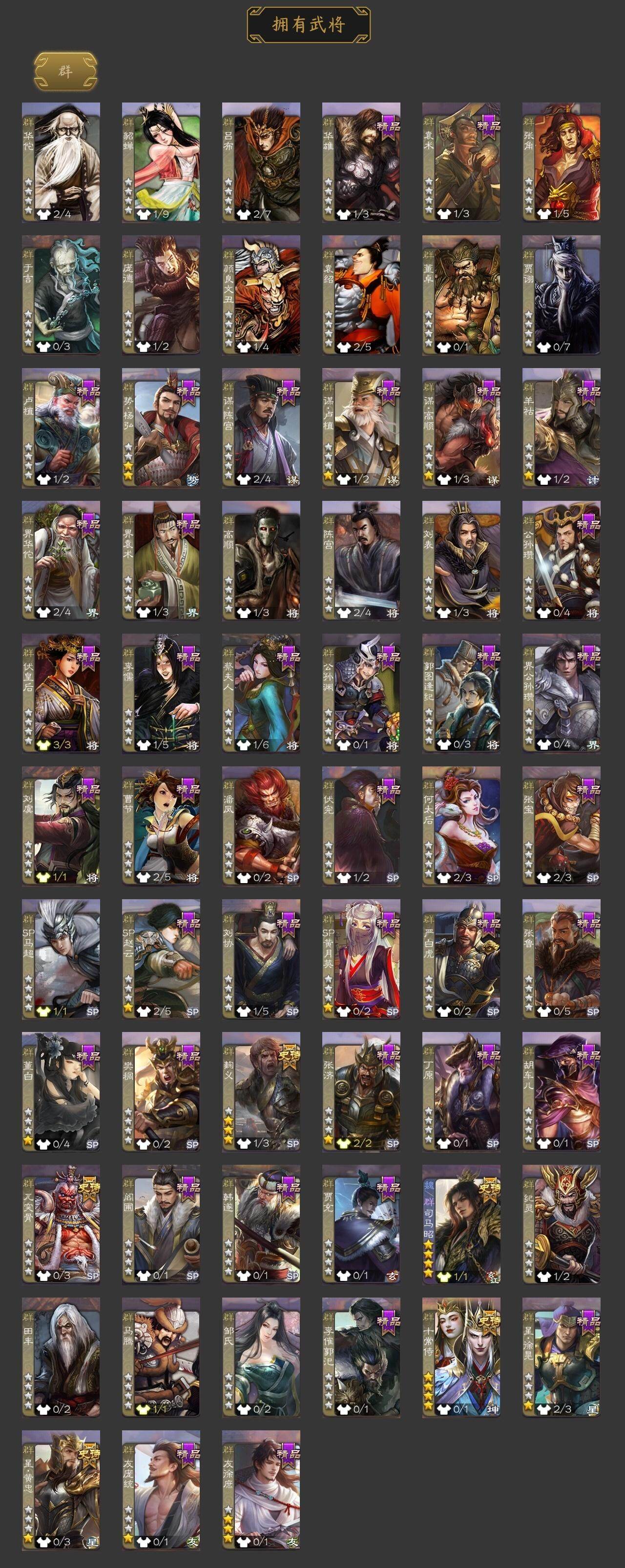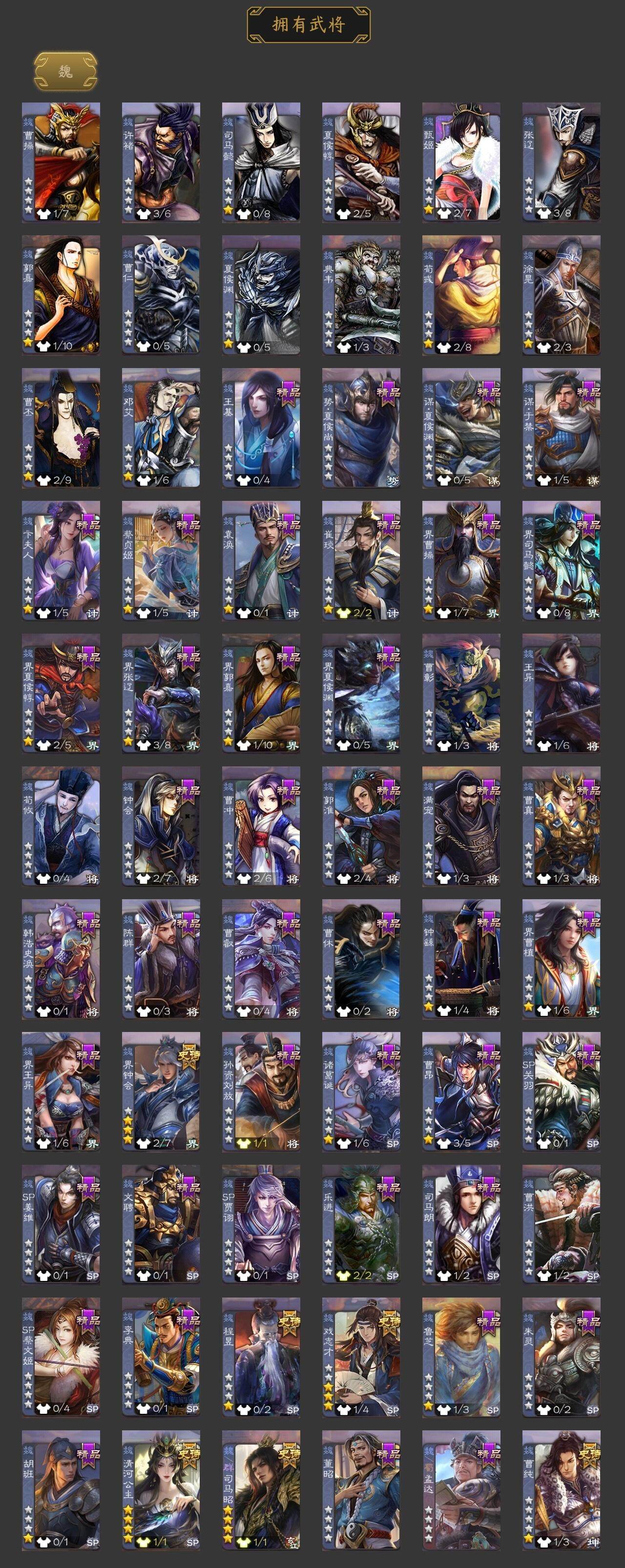 [15168886]【328】官阶:骠骑将军;vip等级:vip8;史诗武将数量:16;动态皮肤数量:18;武将总数:262;史诗宝珠数量:7;将魂数量:2008;神将:2;魏国史诗武将:10;蜀国史诗武将:3;吴国史诗武将:3;群史诗武将:4 神吕蒙神周瑜魏-司马昭界钟会曹纯戏志才清河公主沙摩柯谯周花鬘吴景界徐盛势陆郁生十常侍星黄忠麹义友徐庶神郭嘉-虎年清明动态神张辽-散敌擒孙神周瑜-波澜不惊神吕蒙-心生万象神赵云-战龙在野动态钟繇-安民护祚(动态)界曹植-鼠年端午动态司马昭-昭威淮南(动态)星徐晃-斧引霹雳动态清河公主-魅影萦心动态费祎-安民护祚(动态)诸葛果-蛇年限定动态陆逊-龙年七夕动态孙鲁育-牛年端午动态鲁肃-蛇年端午动态曹节-龙年中秋动态麹义-扬刀立威动态sp赵云-威名尽显动态皇甫嵩-奋钺振旅动态