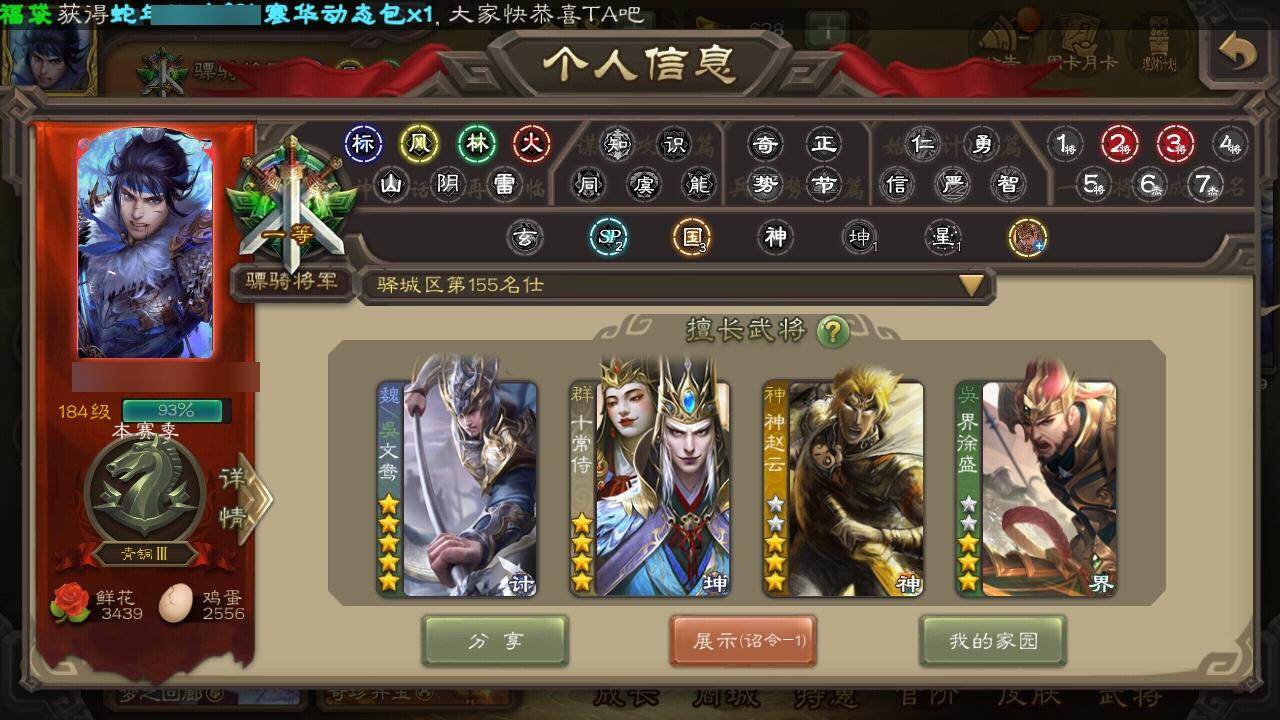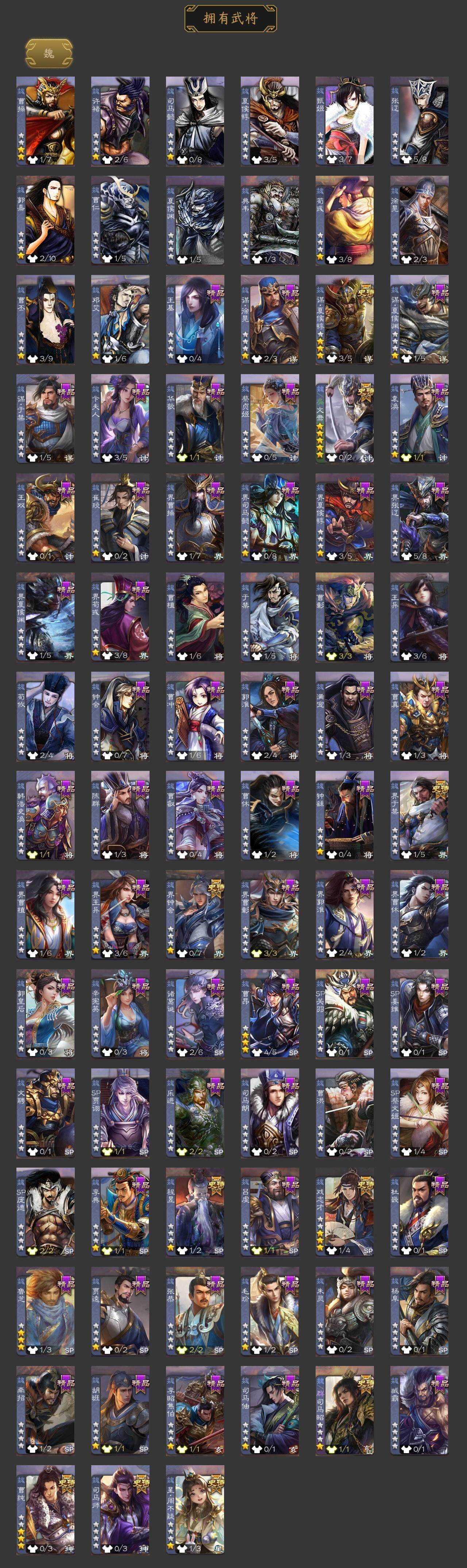 [15168953]【320】官阶:骠骑将军;vip等级:vip8;史诗武将数量:30;动态皮肤数量:25;武将总数:310;史诗宝珠数量:4;将魂数量:3423;神将:4;魏国史诗武将:12;蜀国史诗武将:6;吴国史诗武将:1;群史诗武将:10 神吕布神赵云神陆逊神吕蒙星周不疑文鸯魏-司马昭司马师界钟会界于禁曹纯戏志才谋夏侯惇谋赵云谋马超诸葛瞻赵襄沙摩柯董允界徐盛十常侍左慈张让麹义界左慈界李儒谋张角张绣阎象星董卓神甘宁-万人辟易动态星周不疑-才广志宏动态曹丕-气荡山河(动态)甄姬-明珠耀躯(动态)sp蔡文姬-兔年冬日动态曹昂-竭战麟伤动态司马昭-昭威淮南(动态)刘备-龙御天下动态关索-依心缱绻动态张飞-明良千古动态卧龙诸葛-火烧博望动态太史慈-涤荡江东动态周处-义除三害动态吕蒙-剑起惊澜动态陆逊-龙年七夕动态孙权-永开吴祚动态周瑜-兔年七夕动态孙策-虎踞江东动态孙权-吴王六剑动态孙尚香-星流霆击动态界孙权-吴王六剑动态界孙尚香-星流霆击动态袁绍-声震寰宇动态麹义-扬刀立威动态袁绍-一往无前动态左慈-役使鬼神动态