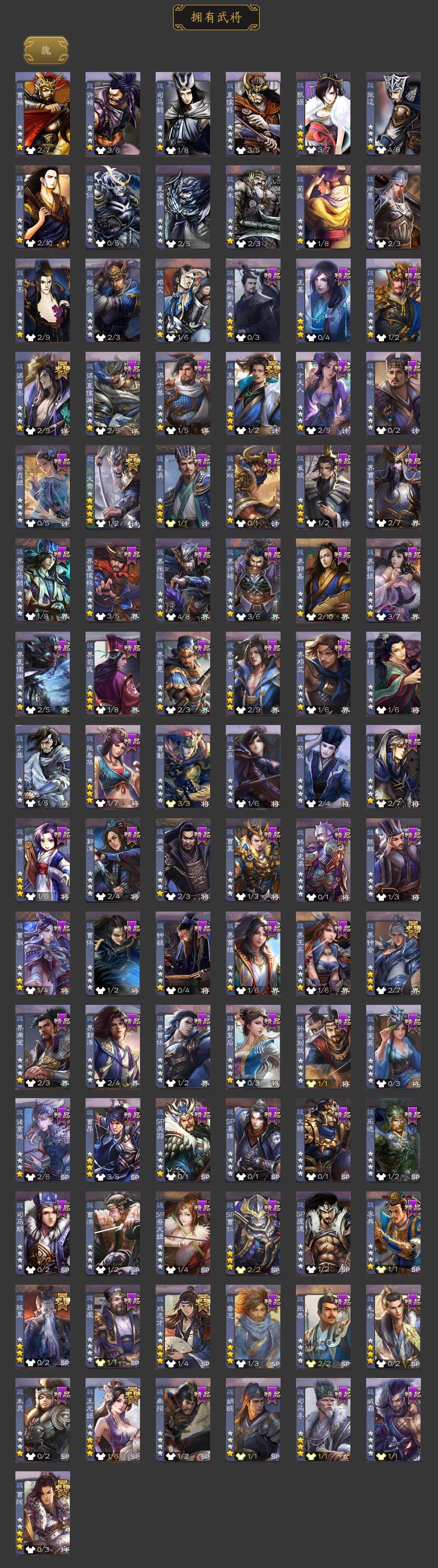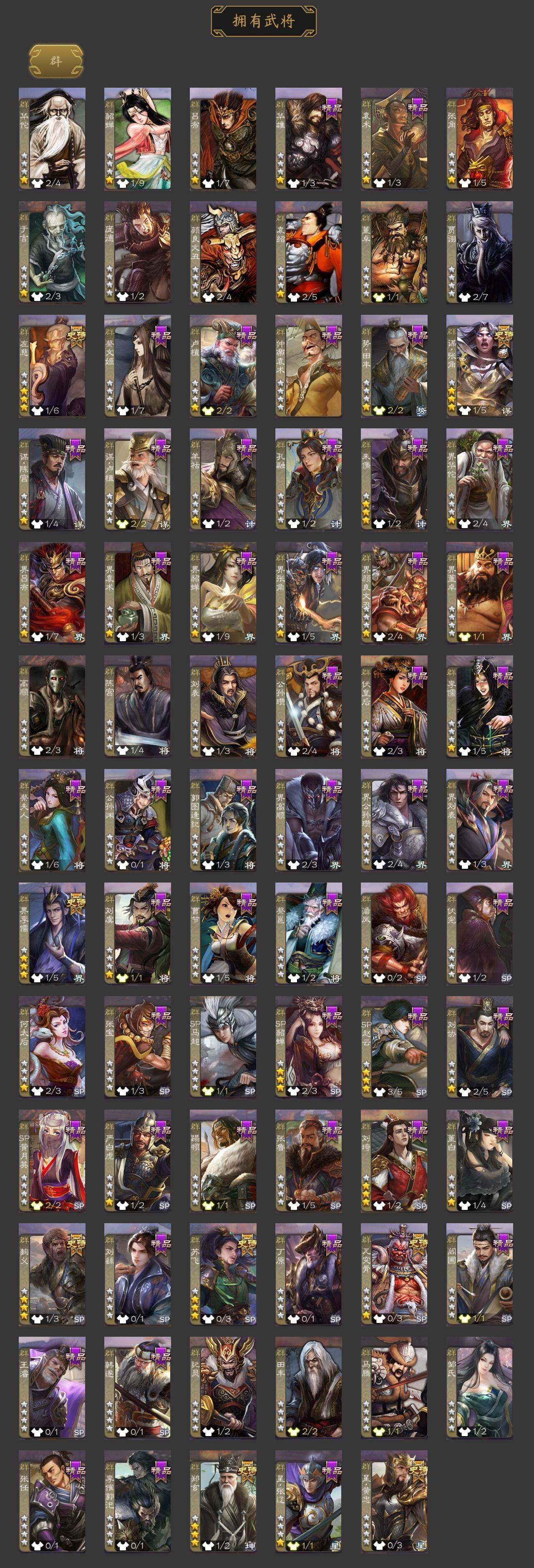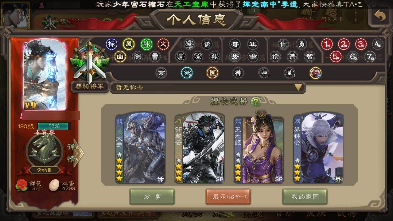 [15169376]【459】官阶:骠骑将军;vip等级:vip9;史诗武将数量:28;动态皮肤数量:16;武将总数:326;史诗宝珠数量:20;将魂数量:6046;神将:4;魏国史诗武将:10;蜀国史诗武将:5;吴国史诗武将:5;群史诗武将:7 神赵云神张辽神吕蒙神周瑜王粲文鸯王元姬界钟会曹纯戏志才谋曹丕谋赵云谋马超诸葛瞻沙摩柯谯周吴景骆统界徐盛贺齐势陆郁生左慈郑玄星黄忠苏飞麹义界李儒谋张角神甘宁-万人辟易动态张昌蒲-龙年端午(动态)甄姬-明珠耀躯(动态)钟会-谋谟之勋动态界钟会-谋谟之勋动态司马昭-昭威淮南(动态)马超-牛年春节动态界马超-牛年春节动态周处-义除三害动态吕蒙-剑起惊澜动态孙寒华-莲华熠熠动态孙策-傲凌绝顶动态文鸯-势若万钧动态许攸-火烧乌巢动态麹义-扬刀立威动态sp赵云-威名尽显动态