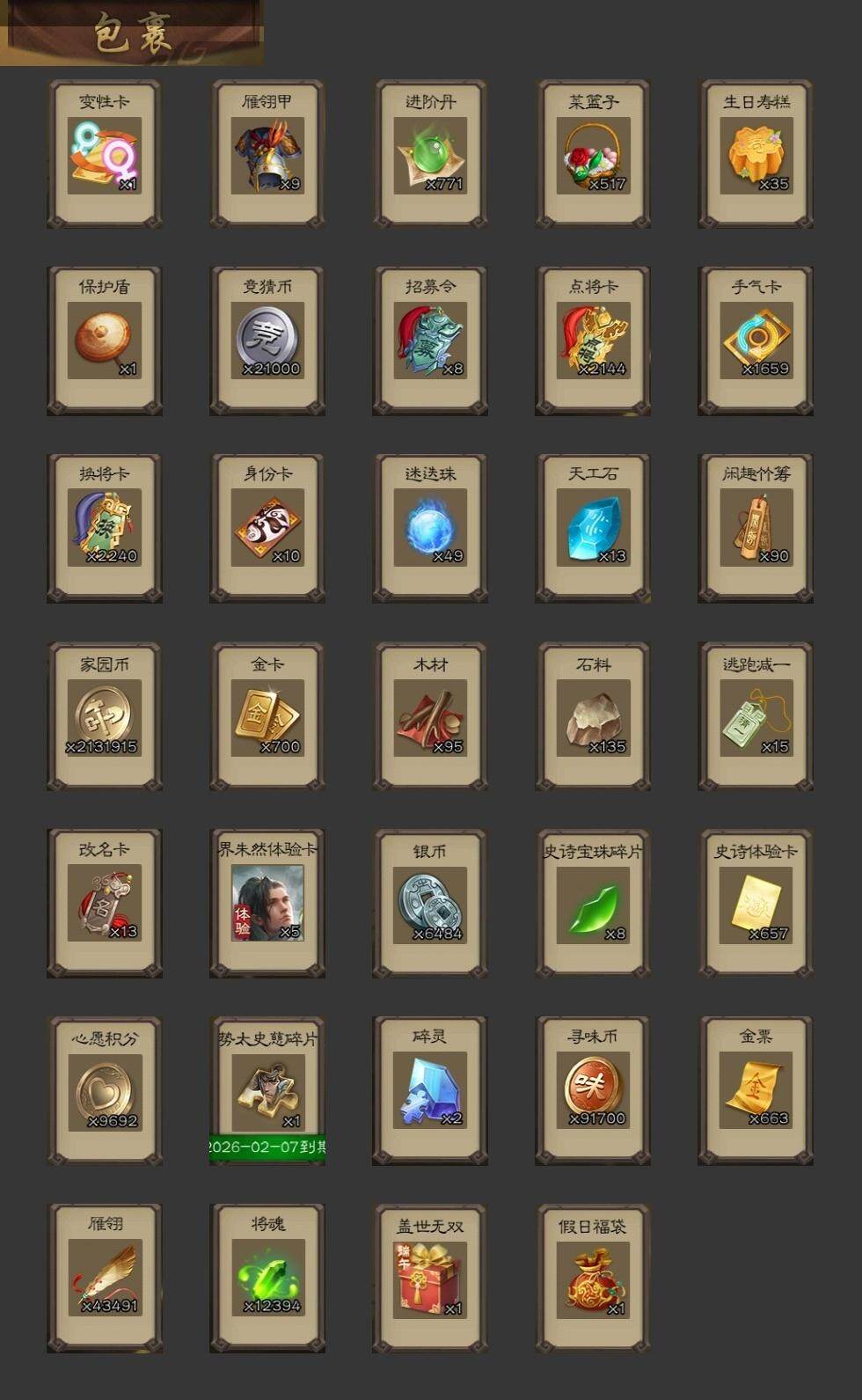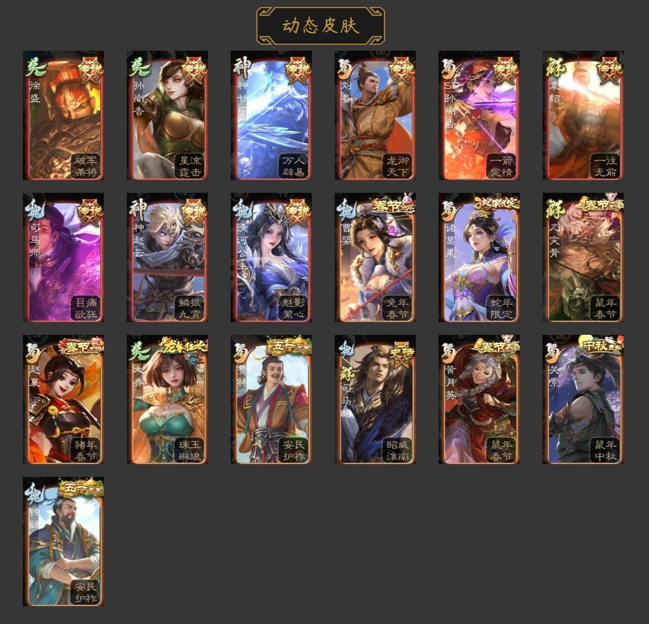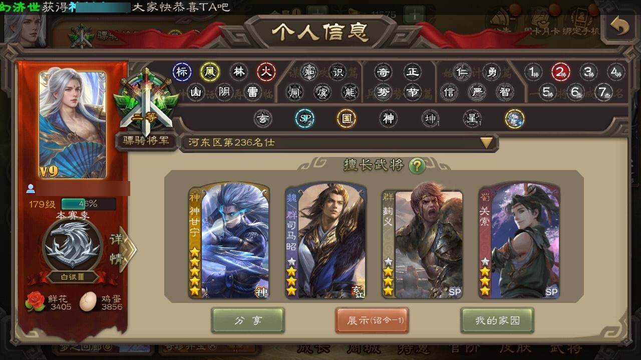 [15169608]【681】官阶:骠骑将军;vip等级:vip9;史诗武将数量:20;动态皮肤数量:17;武将总数:276;史诗宝珠数量:0;将魂数量:12394;神将:5;魏国史诗武将:8;蜀国史诗武将:6;吴国史诗武将:1;群史诗武将:8 神赵云神甘宁神吕蒙神周瑜神诸葛亮魏-司马昭界钟会曹纯戏志才清河公主关索谋赵云诸葛瞻赵襄谯周花鬘界徐盛谋黄月英麹义界李儒鲍信阎象谋吕布友徐庶星董卓神张辽-散敌擒孙神赵云-鳞振九霄神郭嘉-半醉山河神甘宁-万人辟易动态钟繇-安民护祚(动态)曹婴-兔年春节动态司马昭-昭威淮南(动态)清河公主-魅影萦心动态刘备-龙御天下动态费祎-安民护祚(动态)黄月英-鼠年春节动态赵襄-猪年春节动态关索-鼠年中秋动态诸葛果-蛇年限定动态孙尚香-星流霆击动态界孙尚香-星流霆击动态徐盛-破军杀将动态袁绍-一往无前动态兀突骨-鼠年春节动态