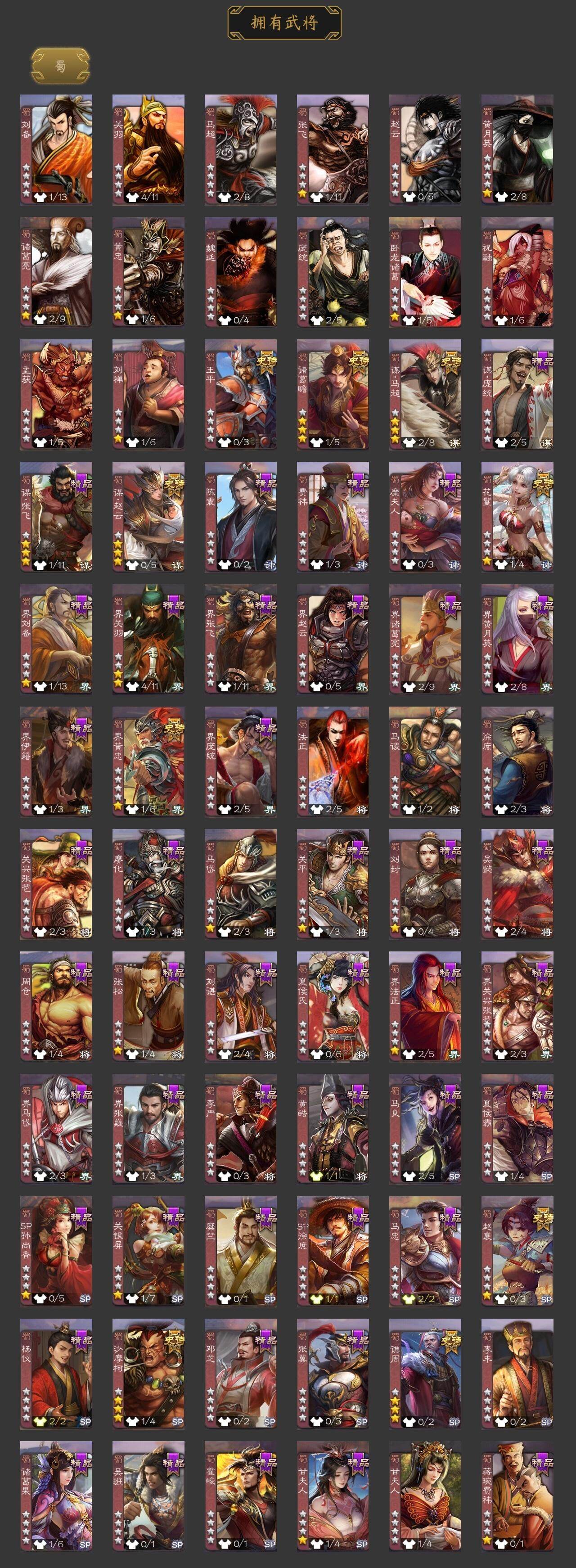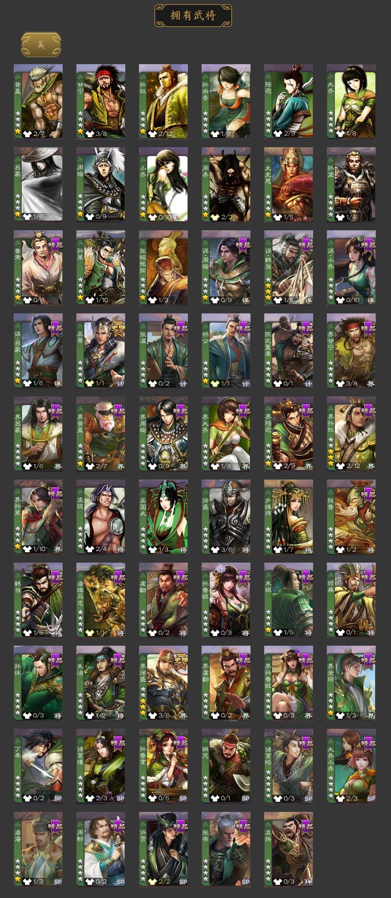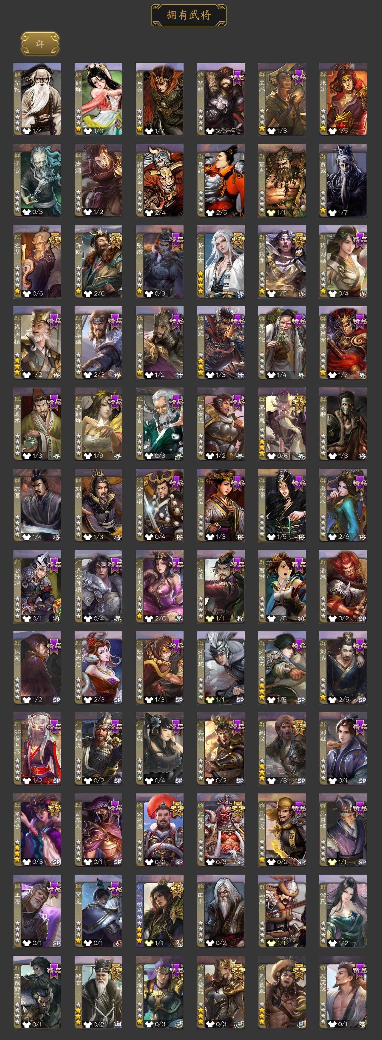 [15169617]【693】官阶:骠骑将军;vip等级:vip6;史诗武将数量:33;动态皮肤数量:13;武将总数:289;史诗宝珠数量:0;将魂数量:0;神将:2;魏国史诗武将:16;蜀国史诗武将:9;吴国史诗武将:2;群史诗武将:14 神吕布神鲁肃星周不疑王元姬界钟会界曹真曹纯戏志才程昱谋赵云谋马超诸葛瞻赵襄王平沙摩柯谯周界黄忠花鬘吴景界徐盛左慈郑玄星黄忠麹义界左慈公孙康卑弥呼谋张角许攸势于吉星董卓兀突骨司马昭神吕蒙sp关羽乐进曹昂诸葛诞朱灵文聘sp姜维张春华钟会曹冲郭淮满宠界王异界曹操界司马懿界夏侯惇界张辽界许褚界郭嘉李典曹真韩浩史涣陈群曹叡钟繇司马朗李通郭皇后孙资刘放辛宪英吕虔鲁芝界荀彧杜畿张恭界曹植界满宠界郭淮卞夫人华歆蔡贞姬袁涣崔琰毛玠谋徐晃谋于禁界曹休牵招胡班司马孚谋郭嘉界夏侯渊臧霸sp孙尚香关银屏夏侯霸马良关兴张苞廖化界马岱关平刘封界法正界关兴张苞界刘备界关羽界张飞界赵云sp徐庶吴懿周仓张松刘谌夏侯氏糜竺马忠李严黄皓界黄月英界诸葛亮界伊籍界庞统张翼杨仪邓芝陈震费祎糜夫人谋庞统界张嶷谋张飞吴班霍峻诸葛果蒋琬费祎甘夫人鲁肃凌操大乔小乔诸葛恪诸葛瑾孙鲁育程普韩当潘璋马忠虞翻界甘宁界吕蒙界黄盖界周瑜界大乔界陆逊孙鲁班朱桓顾雍孙休朱治界孙权潘濬周鲂界孙策许贡界虞翻桥公张温陈武董袭界孙鲁班谋韩当谋吕蒙谋周瑜界全琮谋小乔张布友庞统伏完刘协界袁术sp赵云张宝伏皇后李儒界于吉华雄袁术界华佗界吕布公孙瓒蔡夫人公孙渊严白虎sp黄月英董白刘虞曹节界貂蝉界庞德樊稠刘繇张绣星徐晃界公孙瓒胡车儿羊祜高览马元义界蔡夫人谋刘赪马日磾王濬谋卢植谋华雄贾充李傕郭汜神赵云-神龙天降神鲁肃-九州为局甄姬-明珠耀躯动态荀彧-龙年限定动态钟会-谋谟之勋动态曹冲-龙年清明动态钟繇-安民护祚动态曹昂-竭战麟伤动态sp蔡文姬-兔年冬日动态王元姬-鼠年冬至动态诸