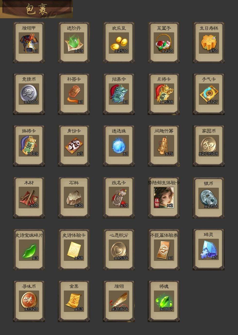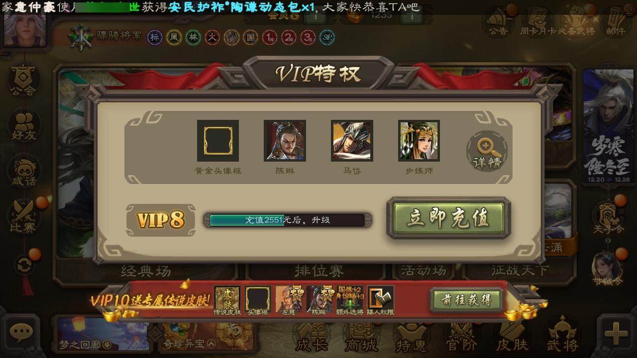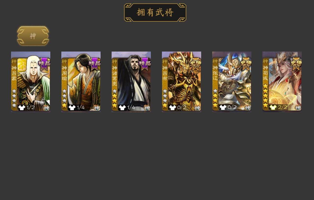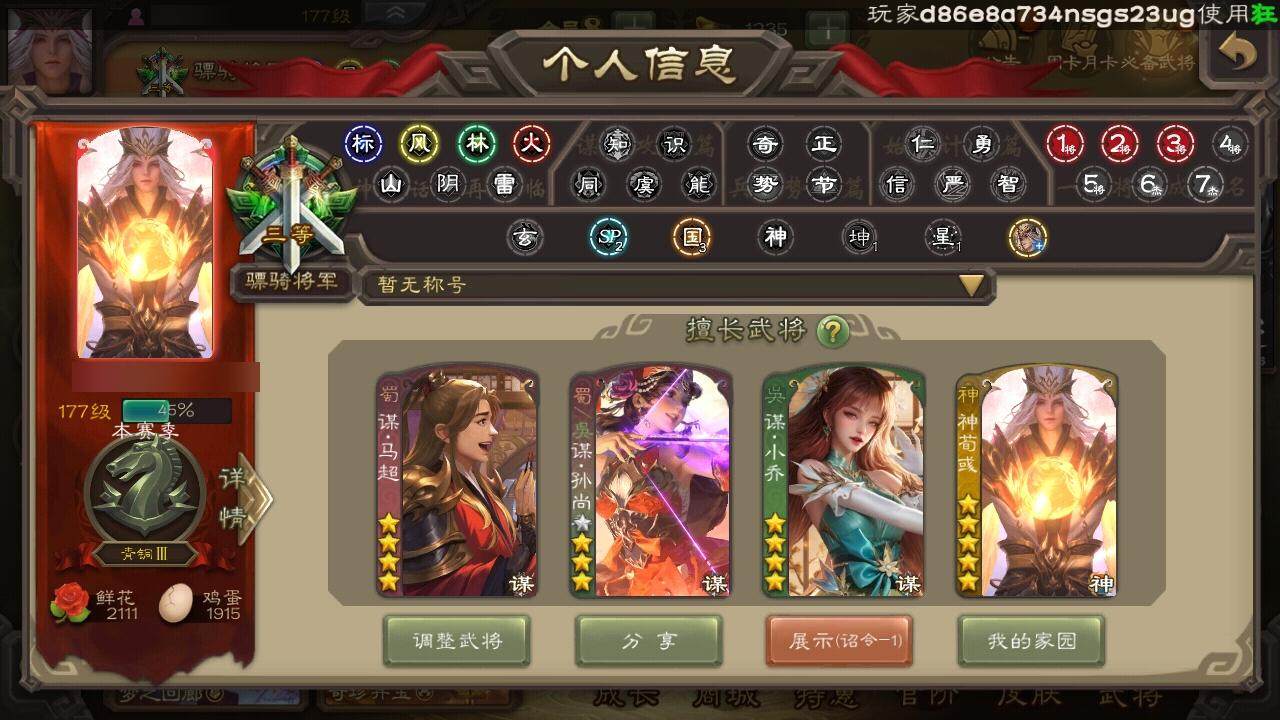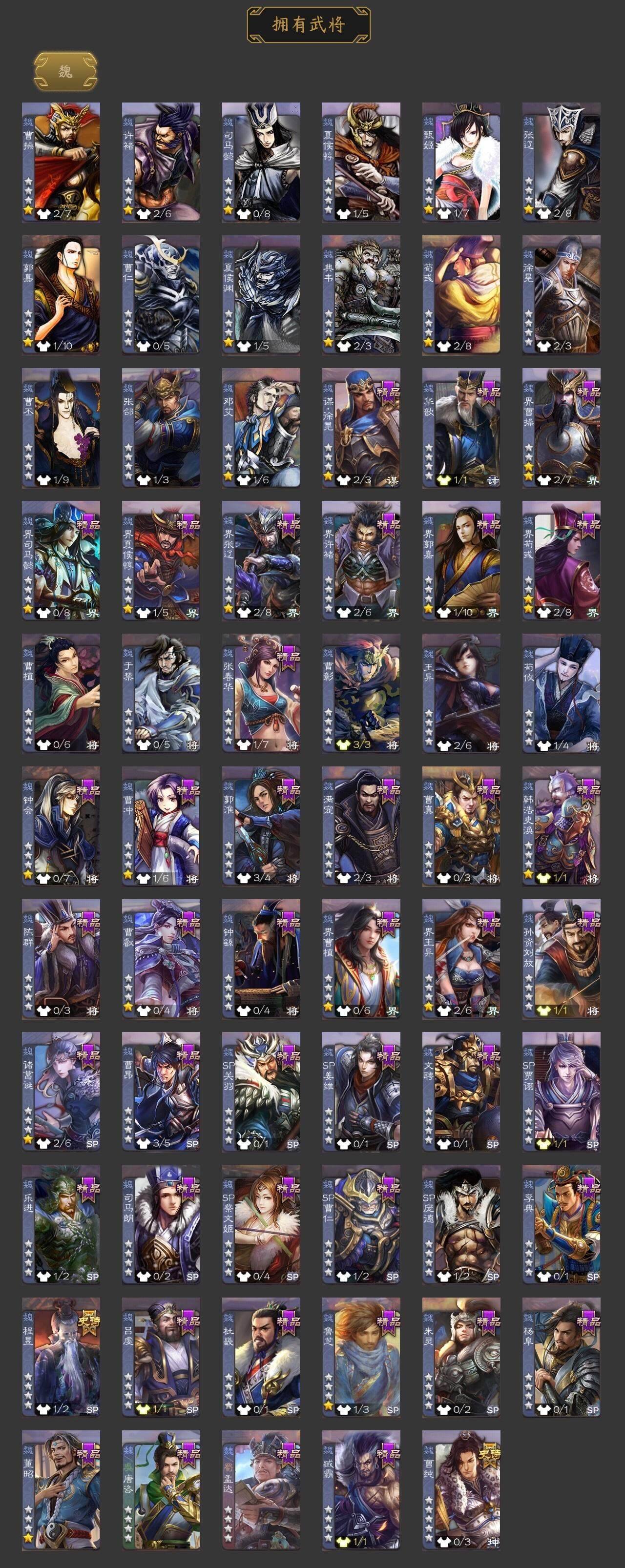 [15169697]【415】官阶:骠骑将军;vip等级:vip8;史诗武将数量:16;动态皮肤数量:11;武将总数:267;史诗宝珠数量:0;将魂数量:1807;神将:6;魏国史诗武将:4;蜀国史诗武将:4;吴国史诗武将:1;群史诗武将:7 神吕布神张辽神荀彧神吕蒙神周瑜神诸葛亮曹纯关索谋孙尚香谋马超界徐盛左慈郑玄星黄忠麹义卑弥呼李傕星董卓神荀彧-虎年清明动态神荀彧-匡汉延祚动态神周瑜-波澜不惊神吕蒙-心生万象神诸葛亮-孟章诛邪动态荀彧-驱虎吞狼动态戏志才-举棋若定动态马超-虎年冬至动态孙权-兔年中秋动态孙尚香-兔年春节动态