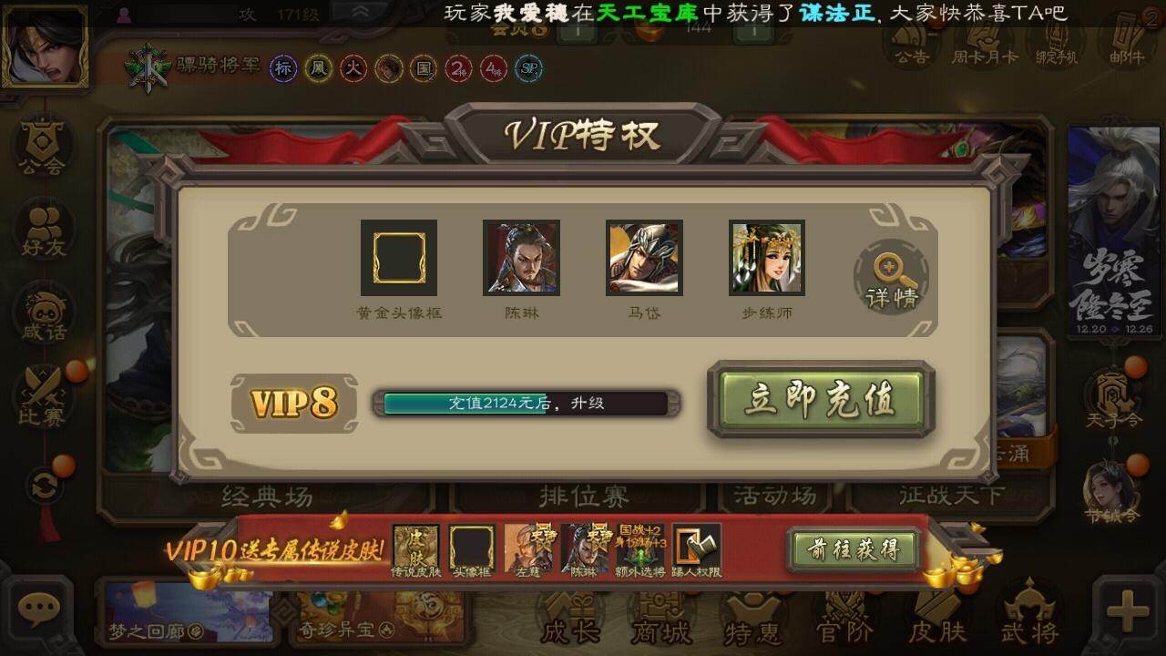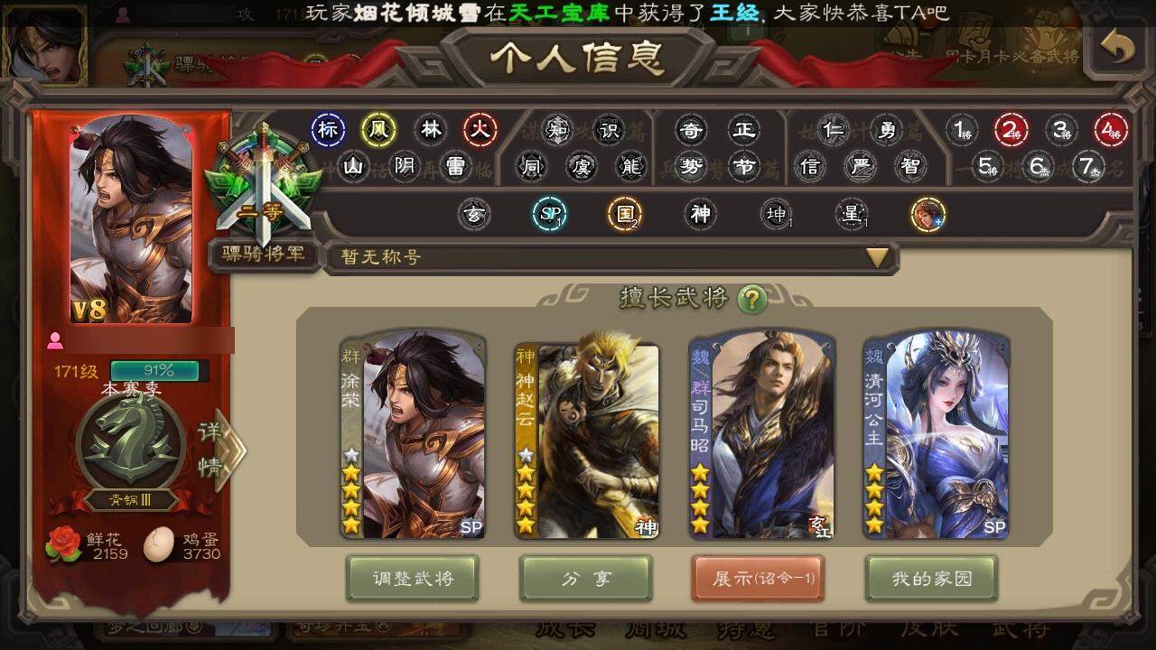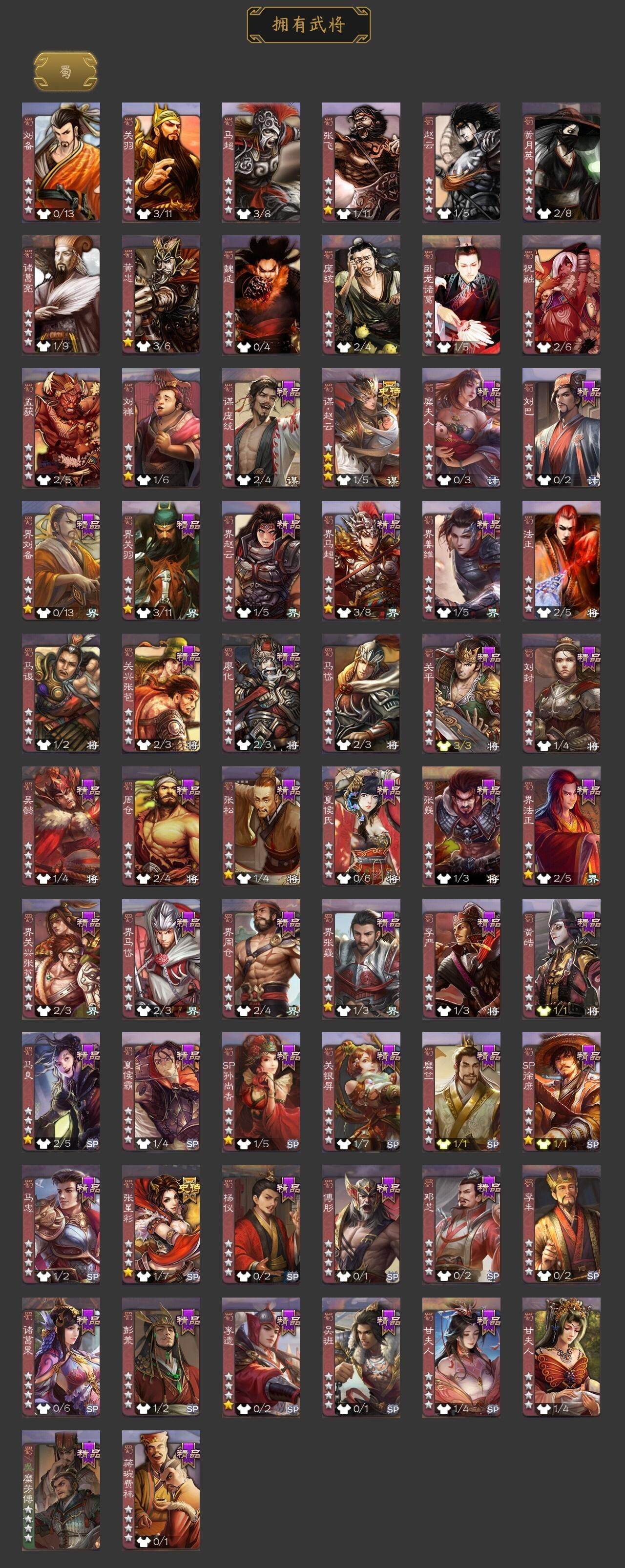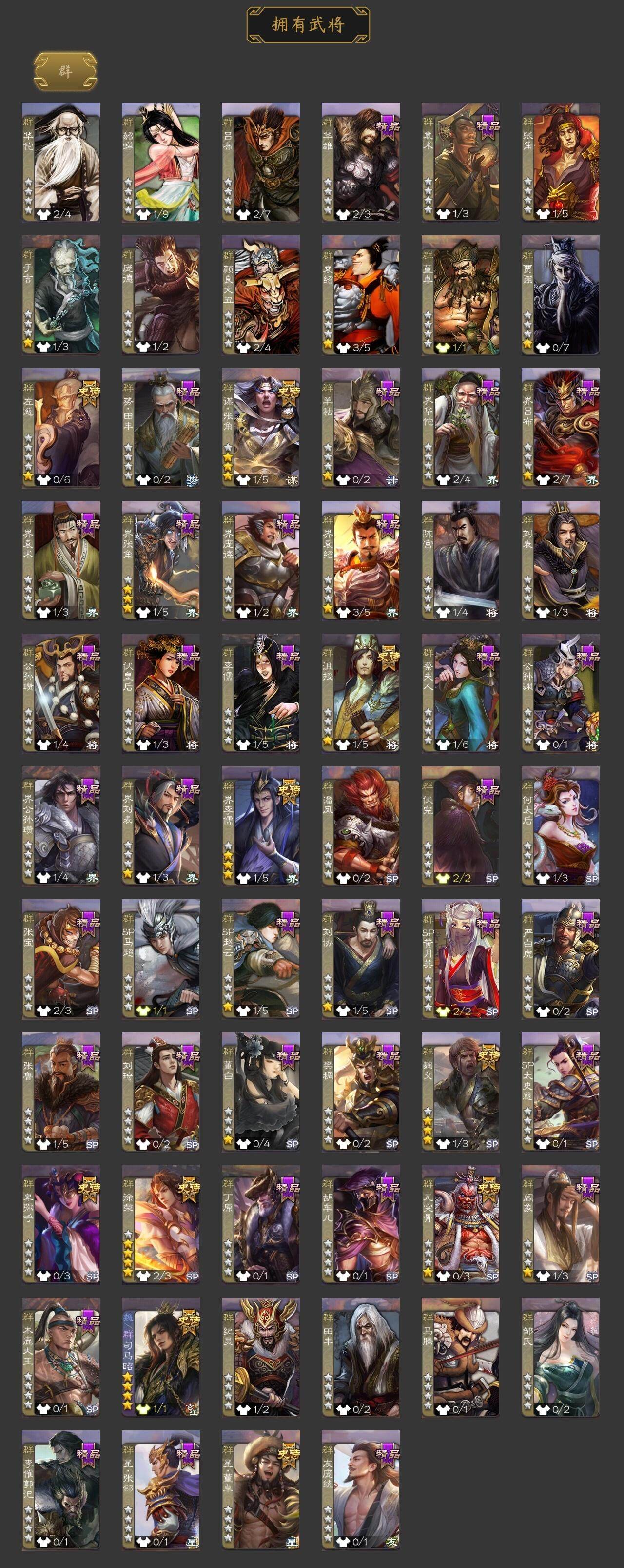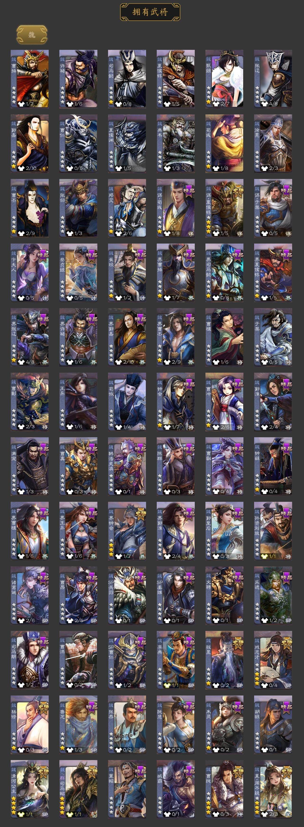 [15169824]【319】官阶:骠骑将军;vip等级:vip8;史诗武将数量:23;动态皮肤数量:18;武将总数:259;史诗宝珠数量:0;将魂数量:4606;神将:2;魏国史诗武将:16;蜀国史诗武将:2;吴国史诗武将:1;群史诗武将:10 神吕布神赵云星周不疑杨修魏-司马昭界钟会曹纯戏志才谋夏侯惇清河公主谋赵云张星彩吴景谋荀彧左慈徐荣麹义沮授界李儒卑弥呼谋张角阎象星董卓神鲁肃-九州为局神吕布-冠绝天下动态星周不疑-才广志宏动态曹丕-气荡山河(动态)星周不疑-龙年清明动态甄姬-明珠耀躯(动态)sp蔡文姬-兔年冬日动态司马昭-昭威淮南(动态)星徐晃-斧引霹雳动态清河公主-魅影萦心动态赵云-牛年春节动态界赵云-牛年春节动态孙策-兔年中秋动态周处-义除三害动态孙权-永开吴祚动态袁绍-声震寰宇动态徐荣-横行四海动态麹义-扬刀立威动态徐荣-烬灭神骸动态