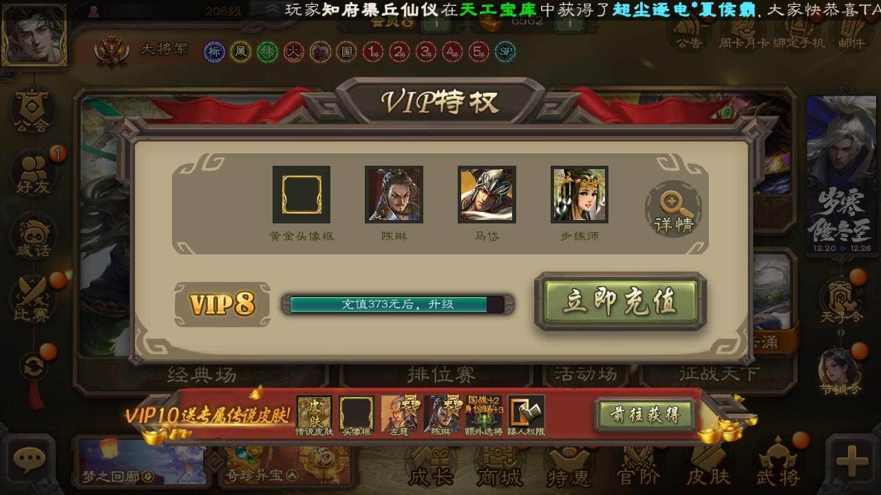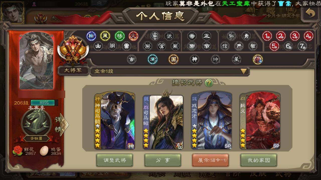 [15169861]【426】官阶:大将军;vip等级:vip8;史诗武将数量:25;动态皮肤数量:38;武将总数:342;史诗宝珠数量:3;将魂数量:9844;神将:4;魏国史诗武将:20;蜀国史诗武将:7;吴国史诗武将:3;群史诗武将:7 神司马懿神张辽神吕蒙神周瑜魏-司马昭界钟会曹纯戏志才清河公主关索谋赵云赵襄张星彩沙摩柯谯周花鬘吴景界徐盛势陆郁生谋黄月英左慈郑玄张让麹义沮授界李儒神赵云-战龙在野动态神司马懿-鉴往知来动态郭嘉-以身证道(动态)曹丕-气荡山河(动态)甄姬-明珠耀躯(动态)sp蔡文姬-兔年冬日动态许褚-兔年端午动态戏志才-举棋若定动态曹纯-虎年春节动态司马昭-昭威淮南(动态)星徐晃-斧引霹雳动态清河公主-魅影萦心动态刘备-龙御天下动态关羽-啸风从龙动态关羽-明良千古动态马超-牛年春节动态张飞-猪年中秋动态界关羽-啸风从龙动态界张飞-猪年中秋动态界马超-牛年春节动态关索-虎年七夕动态李丰-太仓聚粟动态诸葛果-蛇年限定动态太史慈-涤荡江东动态周处-义除三害动态吕蒙-剑起惊澜动态陆逊-龙年七夕动态孙权-兔年中秋动态孙权-永开吴祚动态大乔-猪年七夕动态界大乔-猪年七夕动态鲁肃-蛇年端午动态袁绍-声震寰宇动态麹义-扬刀立威动态何太后-蛇蝎为心动态sp赵云-威名尽显动态左慈-蛇年限定动态