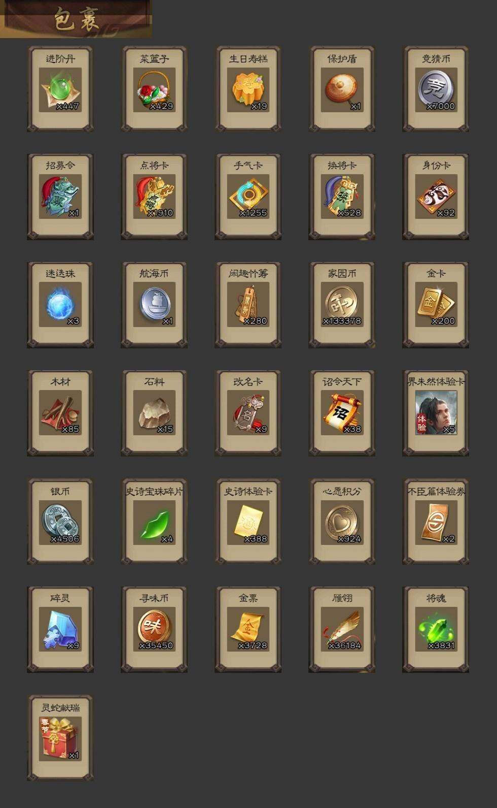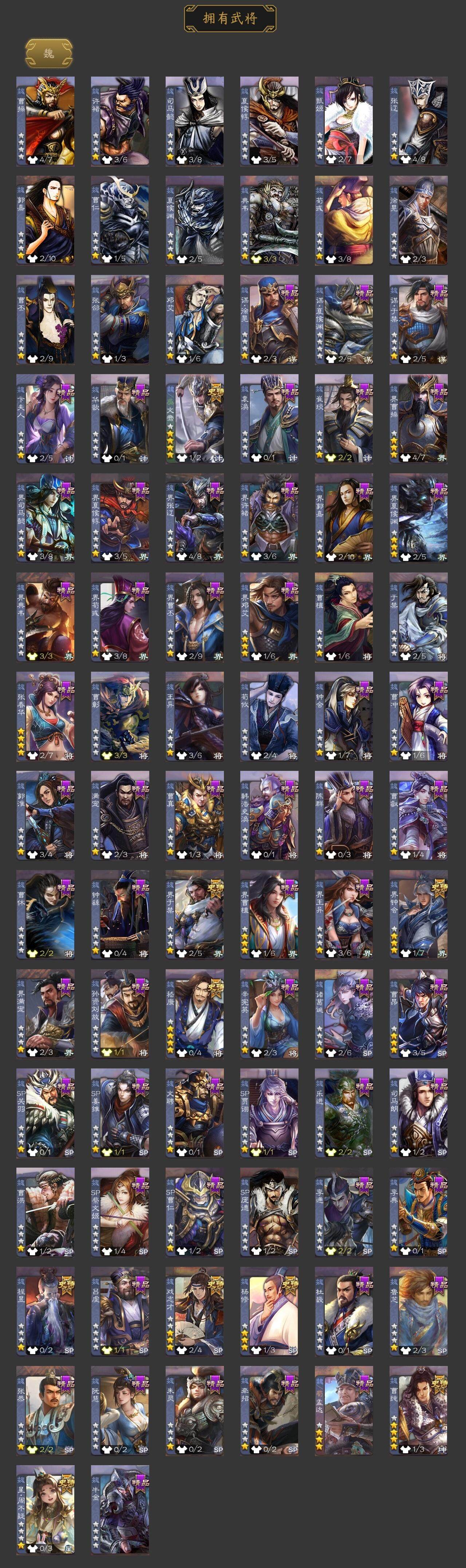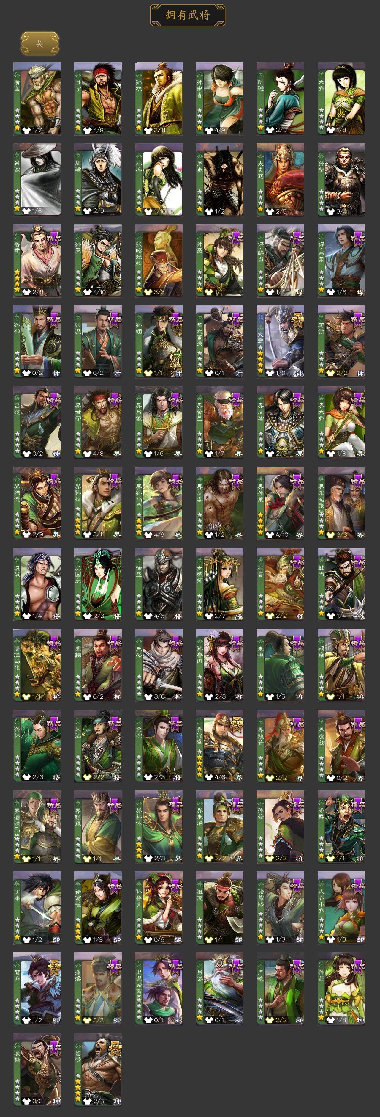 [15169937]【195】官阶:大将军;vip等级:vip8;史诗武将数量:37;动态皮肤数量:21;武将总数:344;史诗宝珠数量:0;将魂数量:3831;神将:5;魏国史诗武将:8;蜀国史诗武将:9;吴国史诗武将:3;群史诗武将:12 神吕布神赵云神刘备神吕蒙神周瑜星周不疑杨修文鸯界钟会界于禁嵇康曹纯戏志才关索谋诸葛亮马云騄谋赵云谋马超诸葛瞻张星彩王平谯周留赞界徐盛贺齐左慈张让星黄忠王允南华老仙沮授界左慈界李儒卑弥呼谋张角星董卓sp甄姬神诸葛亮-观星唤雨sp蔡文姬-兔年冬日动态张春华-雪中舞刃动态曹婴-兔年春节动态曹纯-虎年春节动态刘备-龙御天下动态刘备-明良千古动态马超-牛年春节动态马超-明良千古动态诸葛亮-明良千古动态界刘备-明良千古动态界马超-牛年春节动态夏侯氏-明良千古动态关银屏-兔年春节动态关索-虎年七夕动态胡金定-明良千古动态卧龙诸葛-火烧博望动态孙策-兔年清明动态周处-义除三害动态孙权-永开吴祚动态孙策-虎踞江东动态孙尚香-星流霆击动态界孙尚香-星流霆击动态刘赞-灵魂歌王动态文鸯-势若万钧动态袁绍-声震寰宇动态南华老仙-冠绝天下动态张琪瑛-虎年冬至动态兀突骨-鼠年春节动态星甘宁-肝胆相照动态