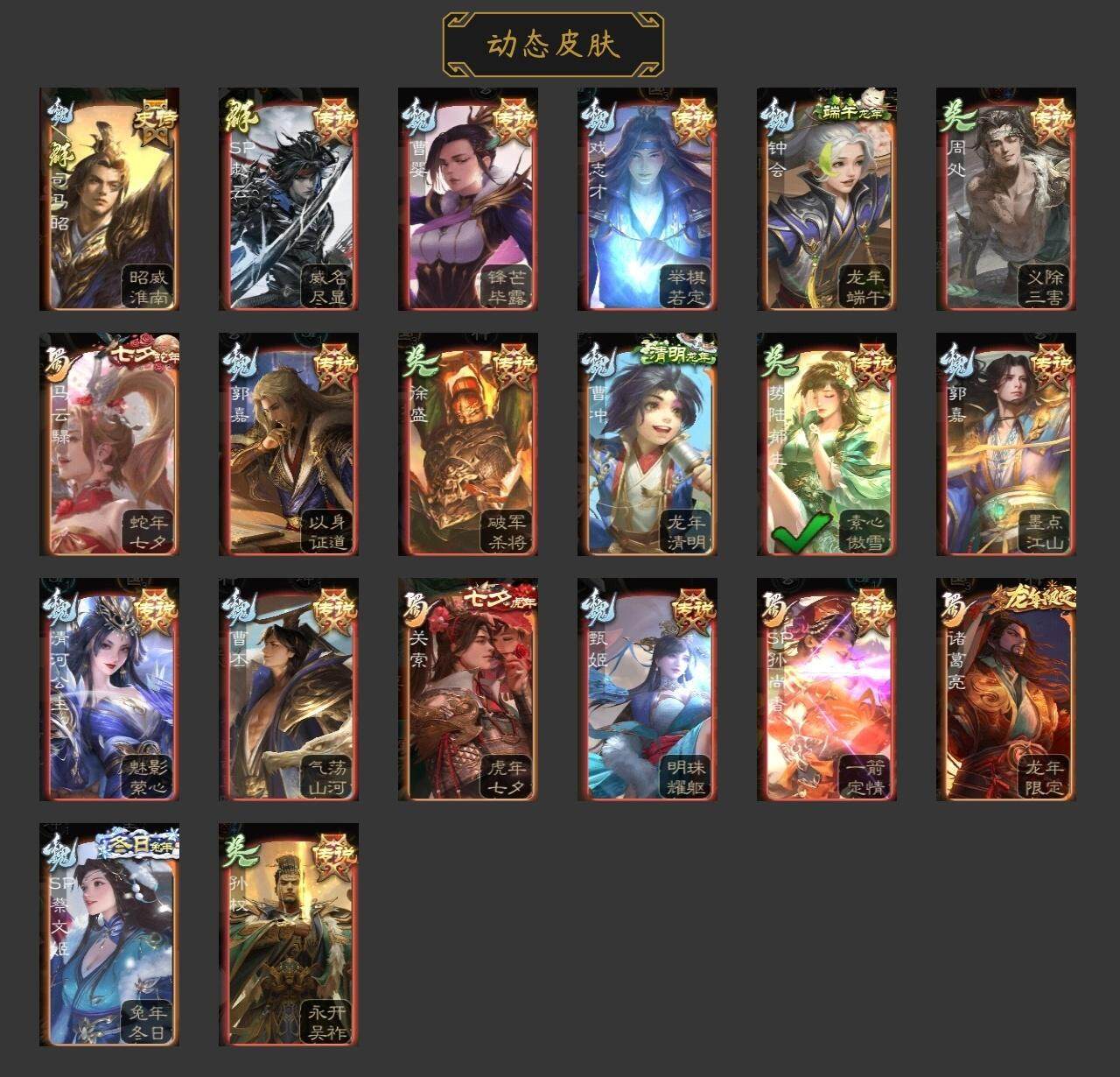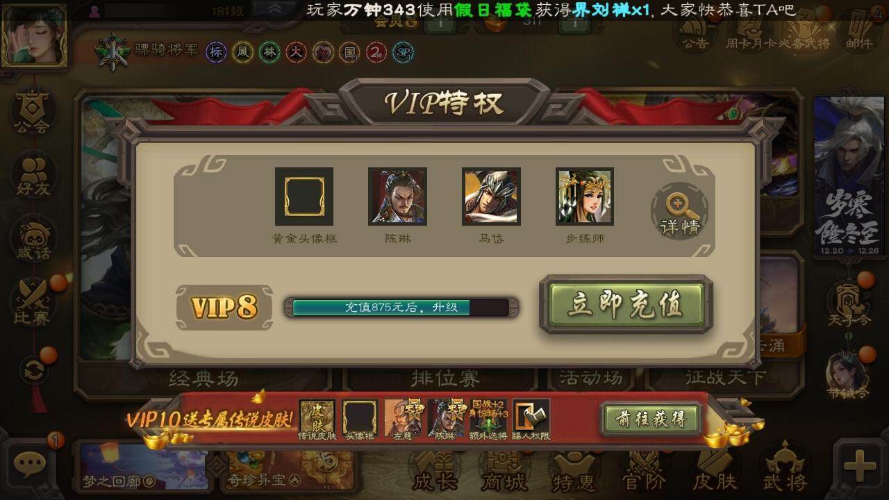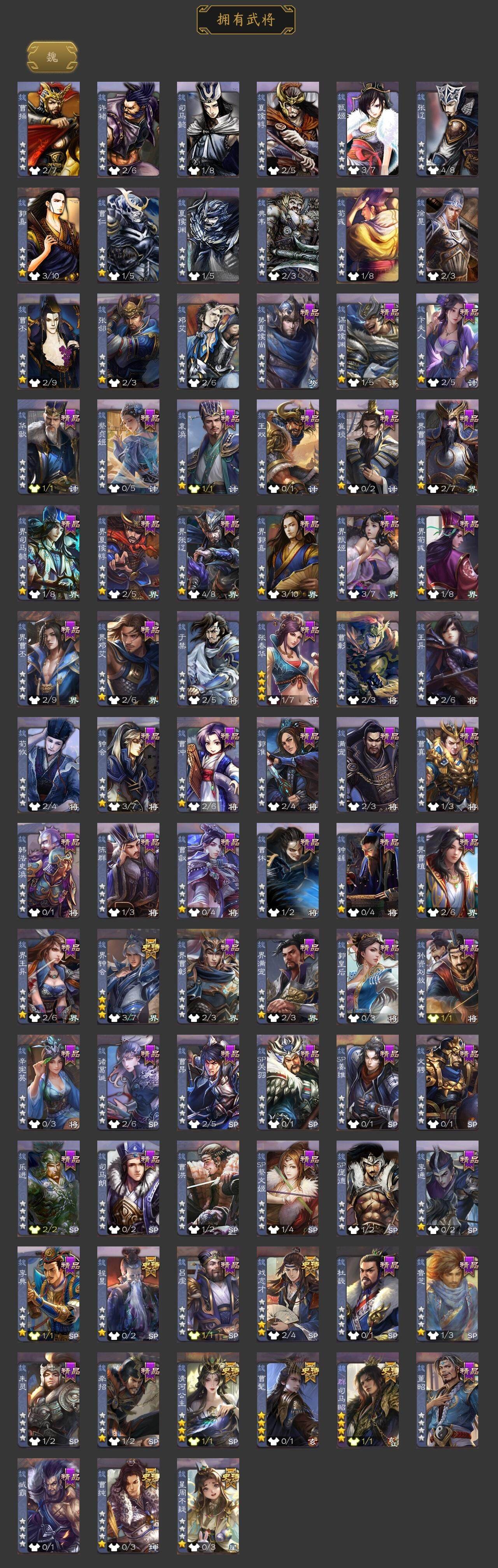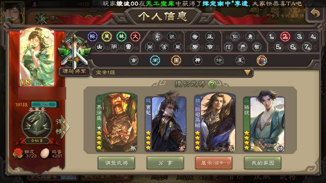 [15169985]【750】官阶:骠骑将军;vip等级:vip8;史诗武将数量:24;动态皮肤数量:20;武将总数:285;史诗宝珠数量:33;将魂数量:8765;神将:2;魏国史诗武将:18;蜀国史诗武将:4;吴国史诗武将:3;群史诗武将:7 神赵云神周瑜曹髦星周不疑魏-司马昭界钟会曹纯戏志才清河公主关索谋赵云沙摩柯傅佥骆统界徐盛势陆郁生星魏延左慈张让麹义公孙康卑弥呼星董卓神赵云-战龙在野动态郭嘉-以身证道(动态)钟会-龙年端午(动态)曹丕-气荡山河(动态)甄姬-明珠耀躯(动态)sp蔡文姬-兔年冬日动态戏志才-举棋若定动态曹婴-锋芒毕露动态司马昭-昭威淮南(动态)清河公主-魅影萦心动态诸葛亮-龙年限定动态关索-虎年七夕动态周处-义除三害动态孙权-永开吴祚动态徐盛-破军杀将动态sp赵云-威名尽显动态