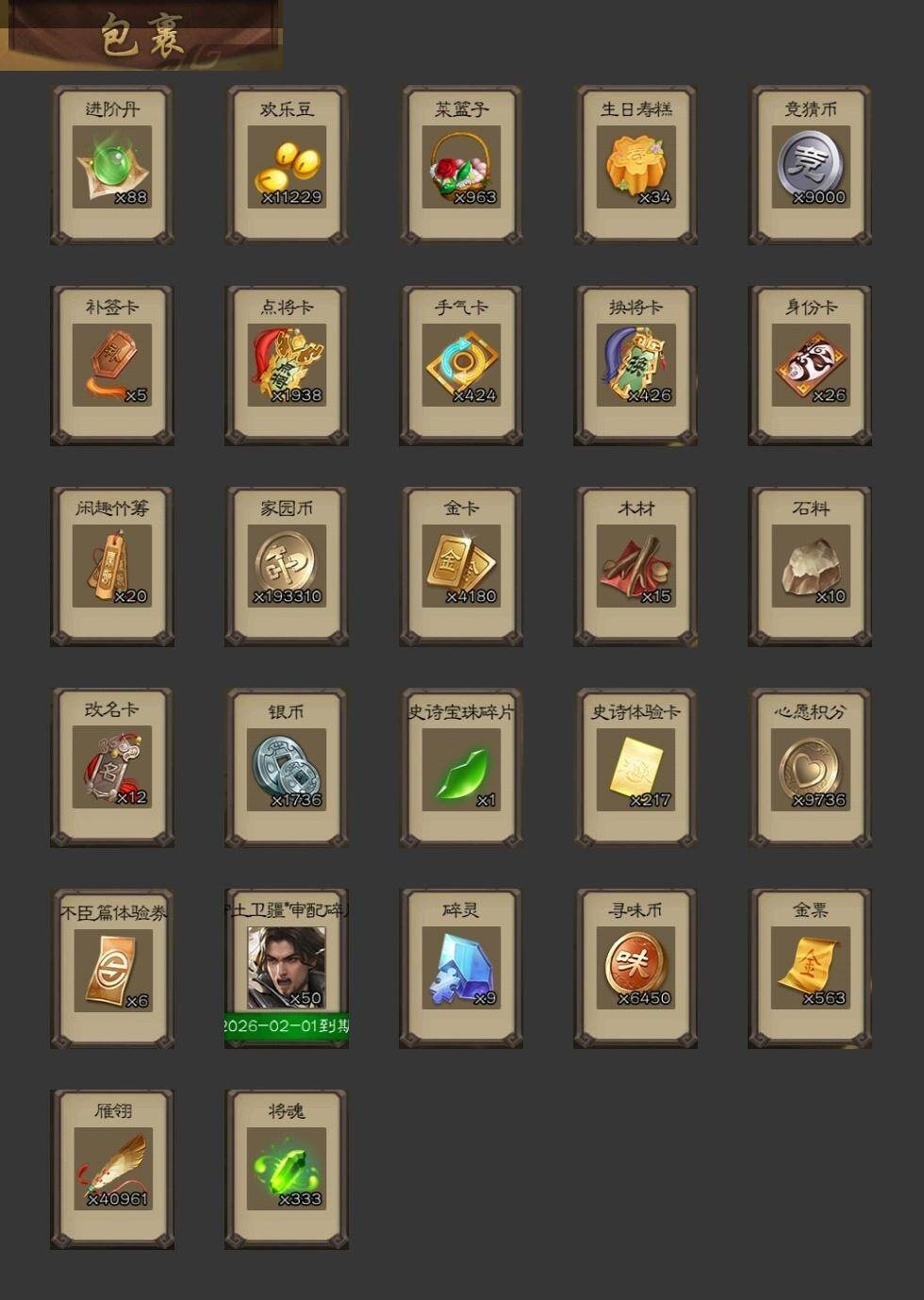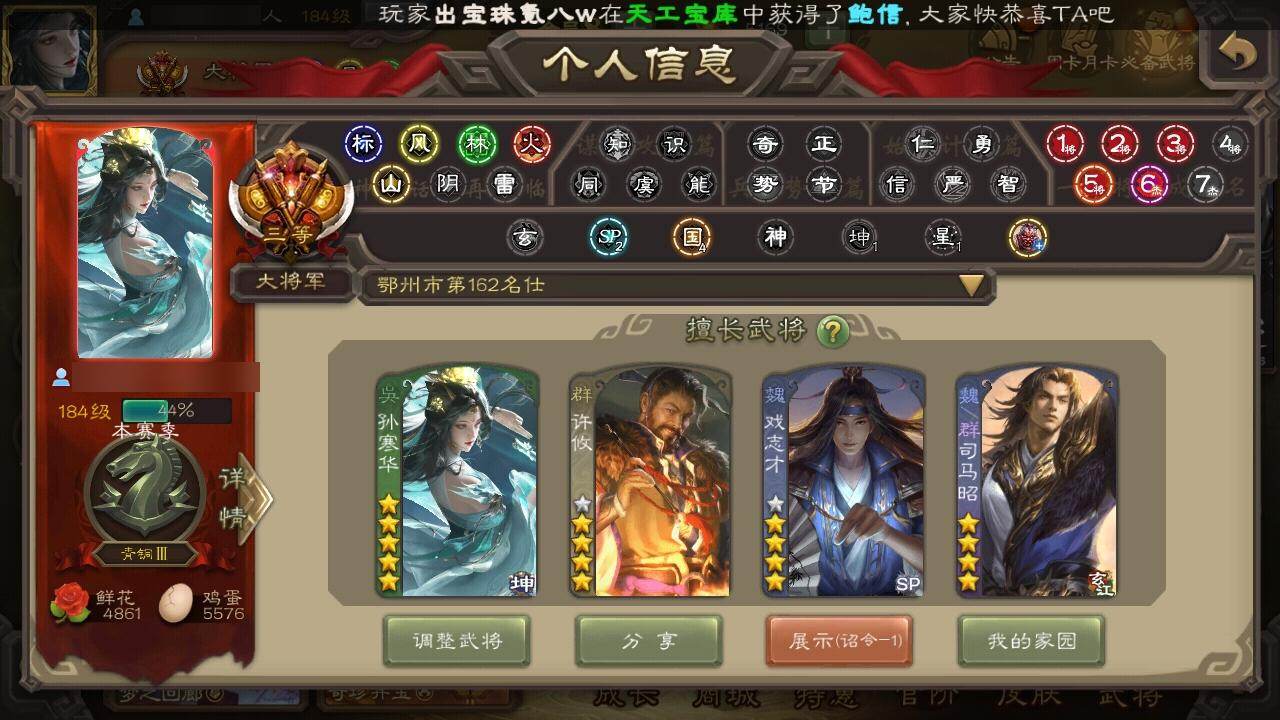 [15169996]【287】官阶:大将军;vip等级:vip8;史诗武将数量:30;动态皮肤数量:31;武将总数:326;史诗宝珠数量:0;将魂数量:333;神将:5;魏国史诗武将:22;蜀国史诗武将:7;吴国史诗武将:4;群史诗武将:12 神赵云神陆逊神吕蒙神周瑜神诸葛亮魏-司马昭界钟会郝昭曹纯戏志才关索谋赵云谋马超沙摩柯谯周界黄忠花鬘张奋周处孙寒华界徐盛谋荀彧谋公孙瓒左慈郑玄张让星黄忠麹义界左慈谋张角张绣许攸星董卓神荀彧-虎年清明动态神甘宁-万人辟易动态神赵云-战龙在野动态神赵云-神龙天降郭嘉-以身证道(动态)星周不疑-才广志宏动态曹植-龙年中秋动态曹丕-气荡山河(动态)甄姬-明珠耀躯(动态)曹丕-龙年中秋动态sp蔡文姬-兔年冬日动态戏志才-举棋若定动态曹纯-虎年春节动态王元姬-鼠年冬至动态司马昭-昭威淮南(动态)马超-虎年冬至动态sp孙尚香-明良千古动态周处-义除三害动态吕蒙-剑起惊澜动态孙权-永开吴祚动态孙策-虎踞江东动态孙寒华-威灵尽显动态周瑜-免年清明动态孙权-牛年七夕动态界孙权-牛年七夕动态孙寒华-蛇年限定动态陆逊-蛇年清明动态灵雎-霜刃绚练动态许攸-火烧乌巢动态袁绍-声震寰宇动态张琪瑛-虎年冬至动态sp赵云-威名尽显动态陶谦-安民护祚动态左慈-蛇年限定动态