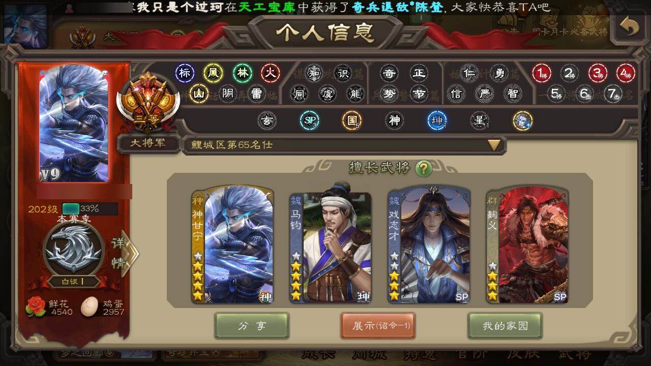[15170119]【848】官阶:大将军;vip等级:vip9;史诗武将数量:35;动态皮肤数量:28;武将总数:344;史诗宝珠数量:0;将魂数量:2222;神将:5;魏国史诗武将:20;蜀国史诗武将:5;吴国史诗武将:5;群史诗武将:9 神吕布神赵云神甘宁神吕蒙神周瑜星周不疑王粲杨修王凌马钧界钟会界于禁界曹真郝昭陈琳曹纯戏志才谋赵云谋马超赵襄沙摩柯花鬘吴景留赞界朱然界徐盛界步练师裴秀左慈苏飞麹义南华老仙沮授界李儒公孙康张绣神郭嘉-虎年清明动态神甘宁-万人辟易动态sp蔡文姬-兔年冬日动态许褚-兔年端午动态司马懿-牛年立冬动态荀彧-驱虎吞狼动态曹丕-牛年清明动态界司马懿-牛年立冬动态界曹丕-牛年清明动态曹真-虎年春节动态戏志才-举棋若定动态曹纯-虎年春节动态刘备-龙御天下动态刘备-明良千古动态马超-明良千古动态界刘备-明良千古动态赵襄-猪年春节动态鲍三娘-柳娇桃艳动态李丰-太仓聚粟动态诸葛果-蛇年限定动态太史慈-涤荡江东动态周处-义除三害动态孙权-永开吴祚动态孙策-虎踞江东动态孙权-猪年端午动态大乔-鼠年春分动态界大乔-鼠年春分动态界孙权-猪年端午动态步练师-牛年七夕动态界步练师-牛年七夕动态袁绍-声震寰宇动态麹义-扬刀立威动态吕布-鼠年七夕动态袁绍-一往无前动态谋刘赪-明良千古动态界吕布-鼠年七夕动态界袁绍-一往无前动态sp赵云-单骑救主动态苏飞-肝胆相照动态