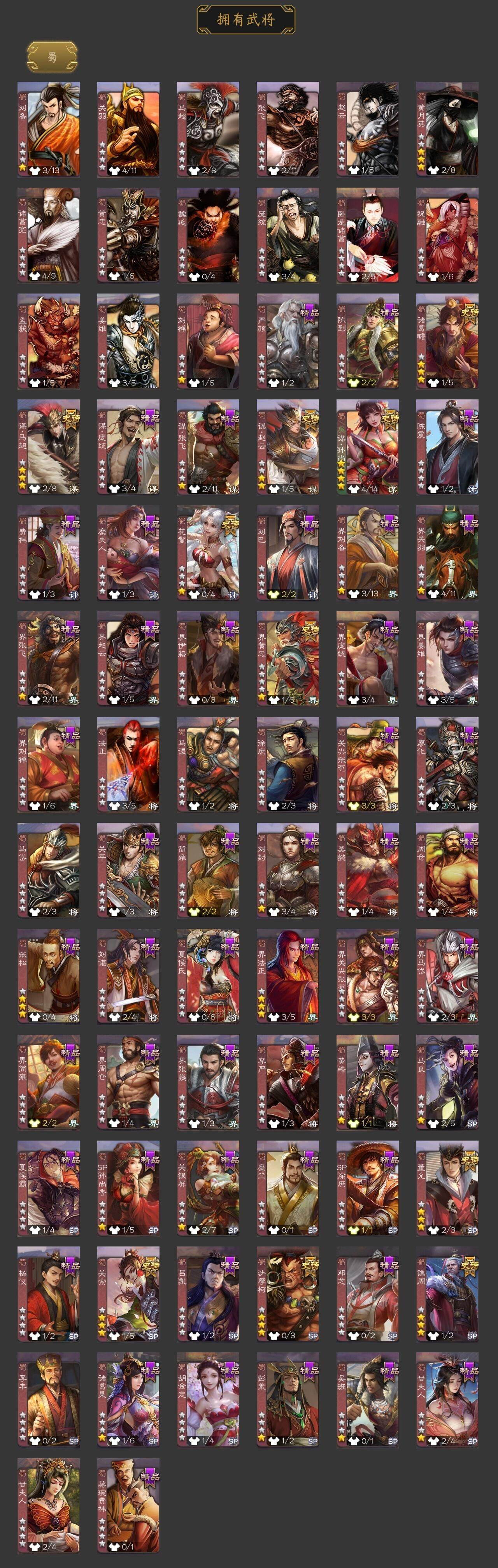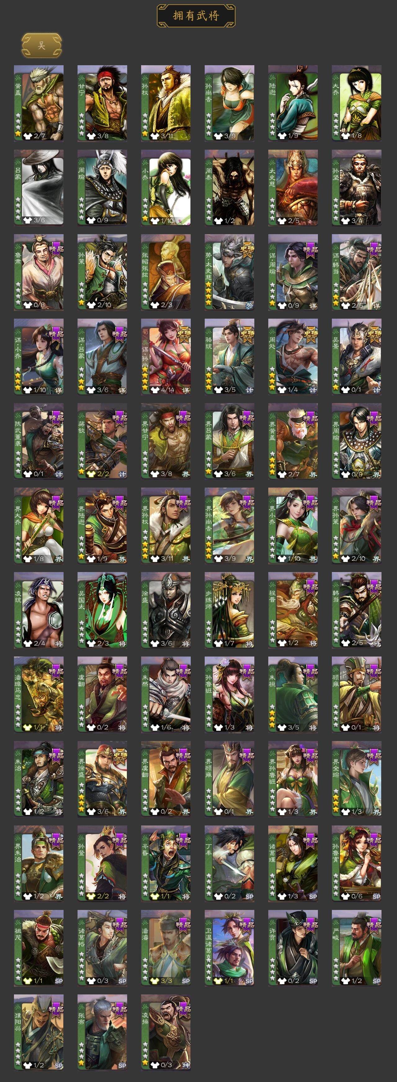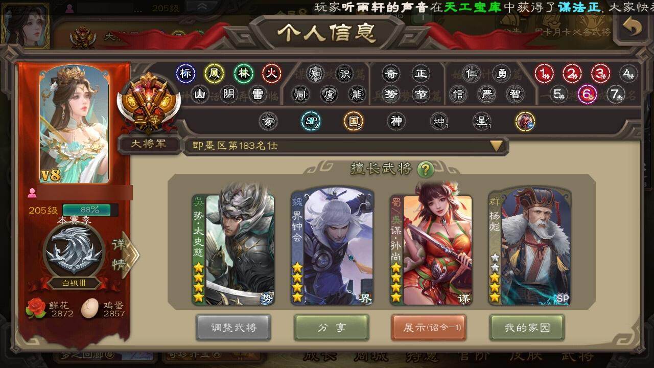 [15170147]【946】官阶:大将军;vip等级:vip8;史诗武将数量:35;动态皮肤数量:26;武将总数:319;史诗宝珠数量:8;将魂数量:2702;神将:5;魏国史诗武将:26;蜀国史诗武将:11;吴国史诗武将:5;群史诗武将:10 神吕布神赵云神吕蒙神周瑜神诸葛亮星周不疑魏-司马昭界钟会界于禁曹婴曹纯戏志才关索谋孙尚香谋赵云谋马超诸葛瞻沙摩柯谯周界黄忠花鬘董允周处吴景骆统界徐盛势太史慈左慈张让杨彪星黄忠麹义界李儒谋张角张绣许攸星董卓神吕蒙-心生万象神曹操-天下归心星周不疑-才广志宏动态曹丕-气荡山河(动态)星周不疑-龙年清明动态甄姬-明珠耀躯(动态)sp蔡文姬-兔年冬日动态王粲-笔翰如流动态张春华-雪中舞刃动态钟会-谋谟之勋动态界钟会-谋谟之勋动态戏志才-举棋若定动态曹婴-兔年春节动态司马昭-昭威淮南(动态)星徐晃-斧引霹雳动态刘备-龙御天下动态卧龙诸葛-龙跃凤鸣动态张飞-据水断桥动态界张飞-据水断桥动态诸葛果-蛇年限定动态周处-义除三害动态吕蒙-剑起惊澜动态孙权-永开吴祚动态孙策-虎踞江东动态孙寒华-蛇年限定动态许攸-火烧乌巢动态袁绍-声震寰宇动态麹义-扬刀立威动态杜预-龙吟破竹动态吕布-虓虎之勇动态界吕布-虓虎之勇动态杨彪-忧心国事动态左慈-蛇年限定动态