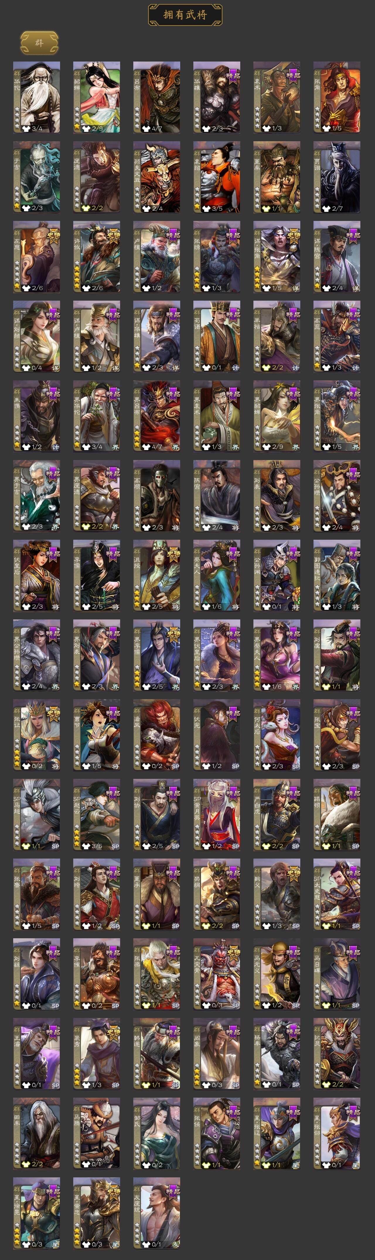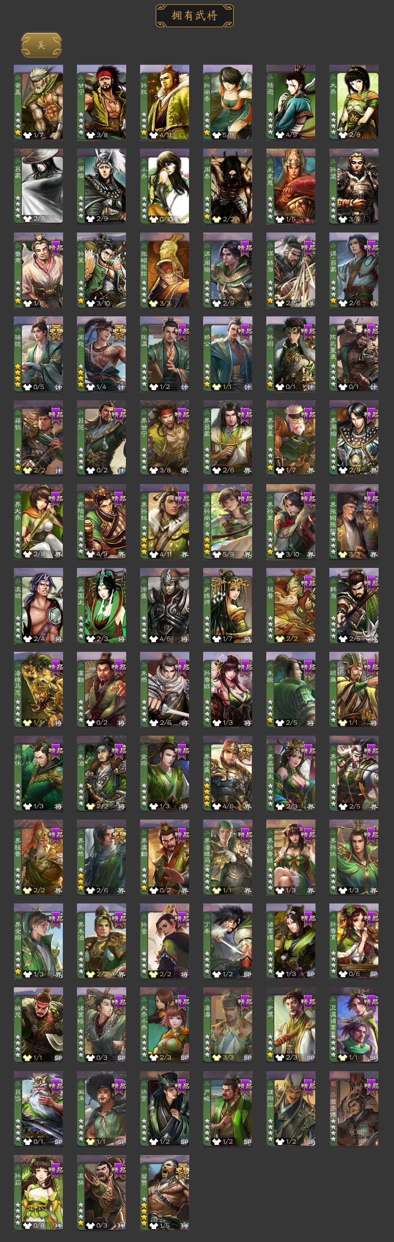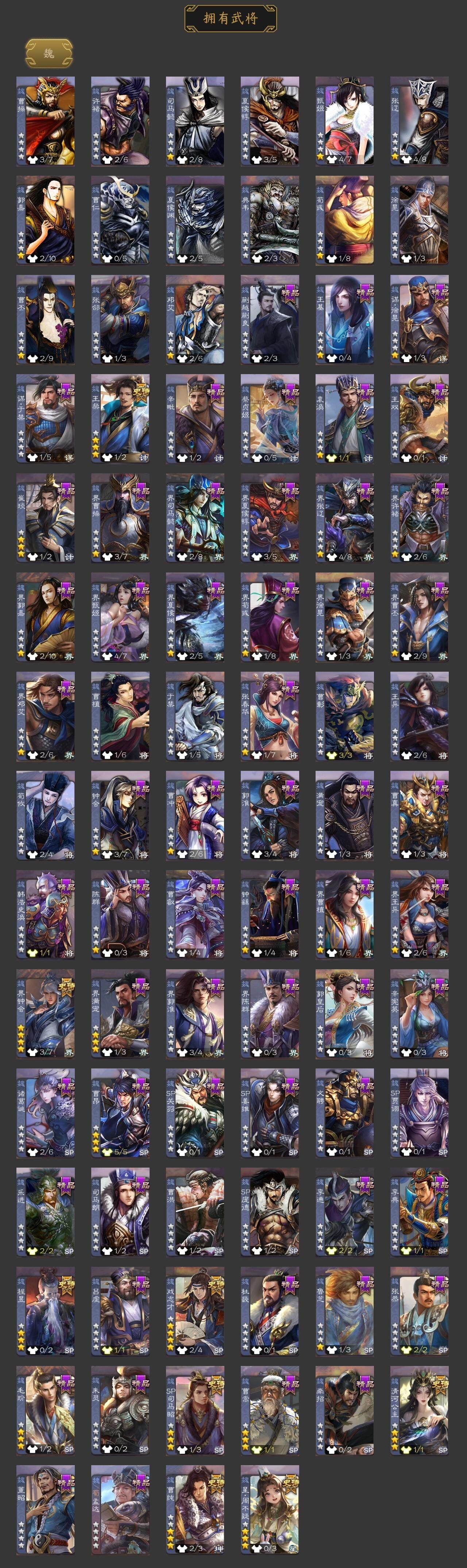 [15170205]【114】官阶:大将军;vip等级:vip8;史诗武将数量:36;动态皮肤数量:31;武将总数:351;史诗宝珠数量:9;将魂数量:12030;神将:6;魏国史诗武将:16;蜀国史诗武将:9;吴国史诗武将:5;群史诗武将:12 神吕布神赵云神张辽神太史慈神关羽神吕蒙sp司马昭星周不疑王粲界钟会曹纯戏志才清河公主关索谋诸葛亮谋赵云谋马超诸葛瞻沙摩柯谯周花鬘董允周处骆统留赞界朱然界徐盛裴秀左慈张让星黄忠麹义沮授界李儒谋张角张绣李傕阎象许攸神诸葛亮-观星唤雨神吕布-监兵噬魅动态神吕布-冠绝天下动态鲍三娘-情定缘起钟会-潜蛟觊天动态曹丕-气荡山河(动态)甄姬-明珠耀躯(动态)sp蔡文姬-兔年冬日动态曹昂-竭战麟伤动态戏志才-举棋若定动态曹纯-虎年春节动态清河公主-魅影萦心动态刘备-龙御天下动态诸葛亮-国之柱石(动态)关索-依心缱绻动态李丰-太仓聚粟动态太史慈-涤荡江东动态周处-义除三害动态孙权-永开吴祚动态孙策-虎踞江东动态孙权-吴王六剑动态孙尚香-兔年春节动态孙尚香-星流霆击动态界孙权-吴王六剑动态界孙尚香-星流霆击动态徐盛-破军杀将动态刘赞-灵魂歌王动态灵雎-霜刃绚练动态袁绍-声震寰宇动态左慈-道法显威(动态)吕布-鼠年七夕动态许攸-盛气凌人动态界吕布-鼠年七夕动态苏飞-肝胆相照动态星甘宁-肝胆相照动态sp赵云-威名尽显动态